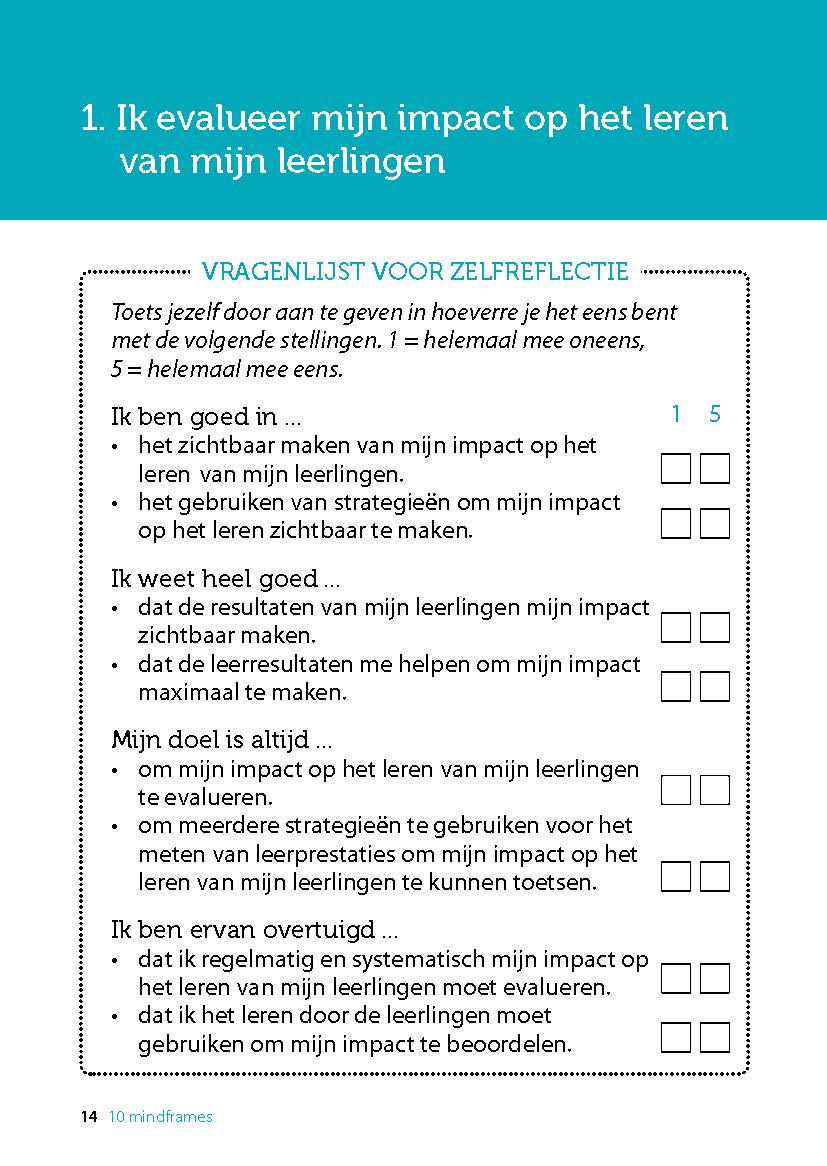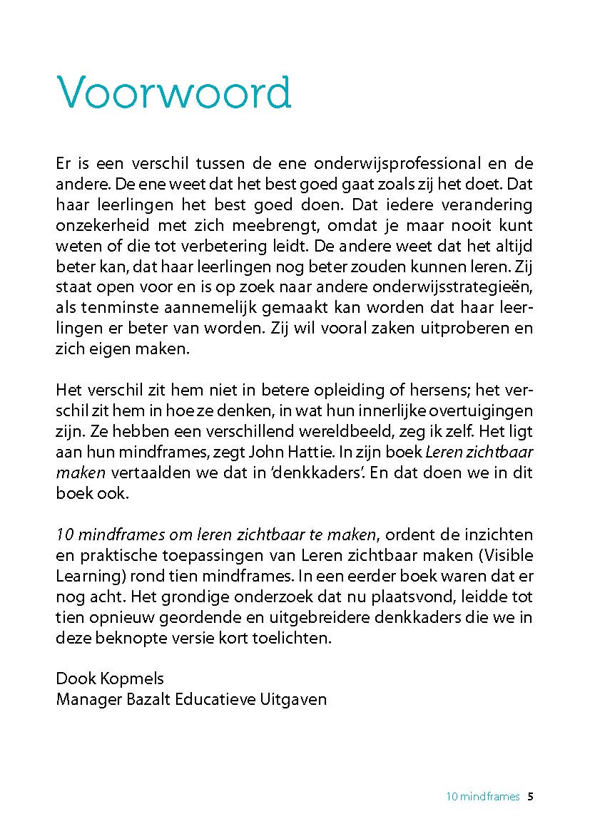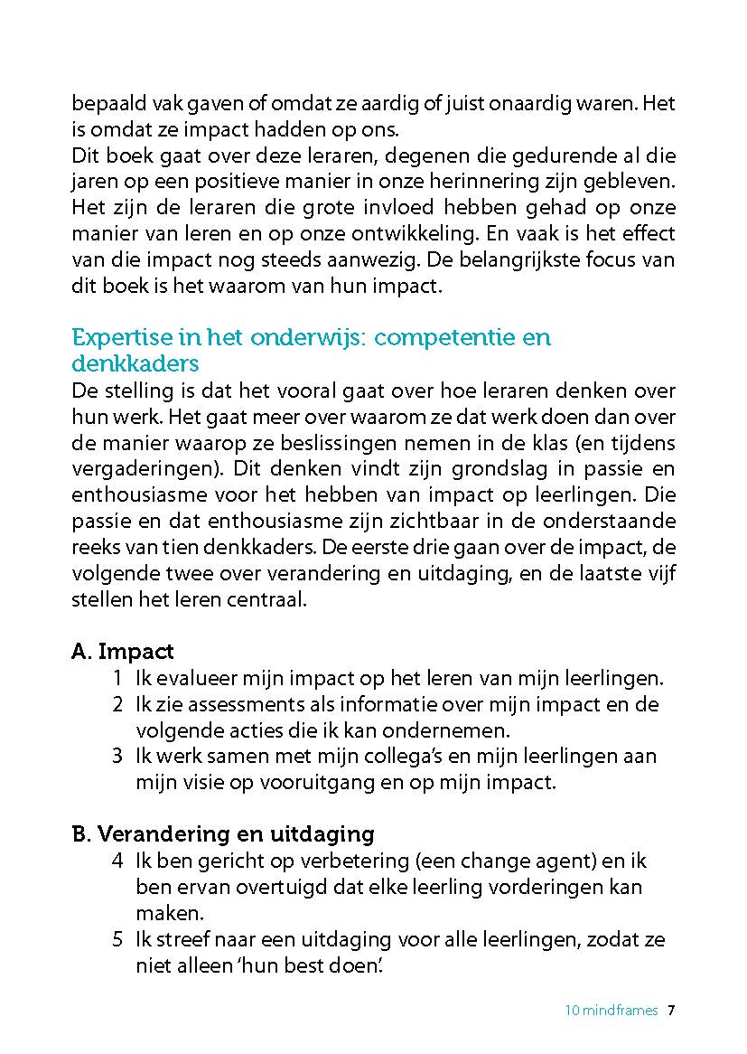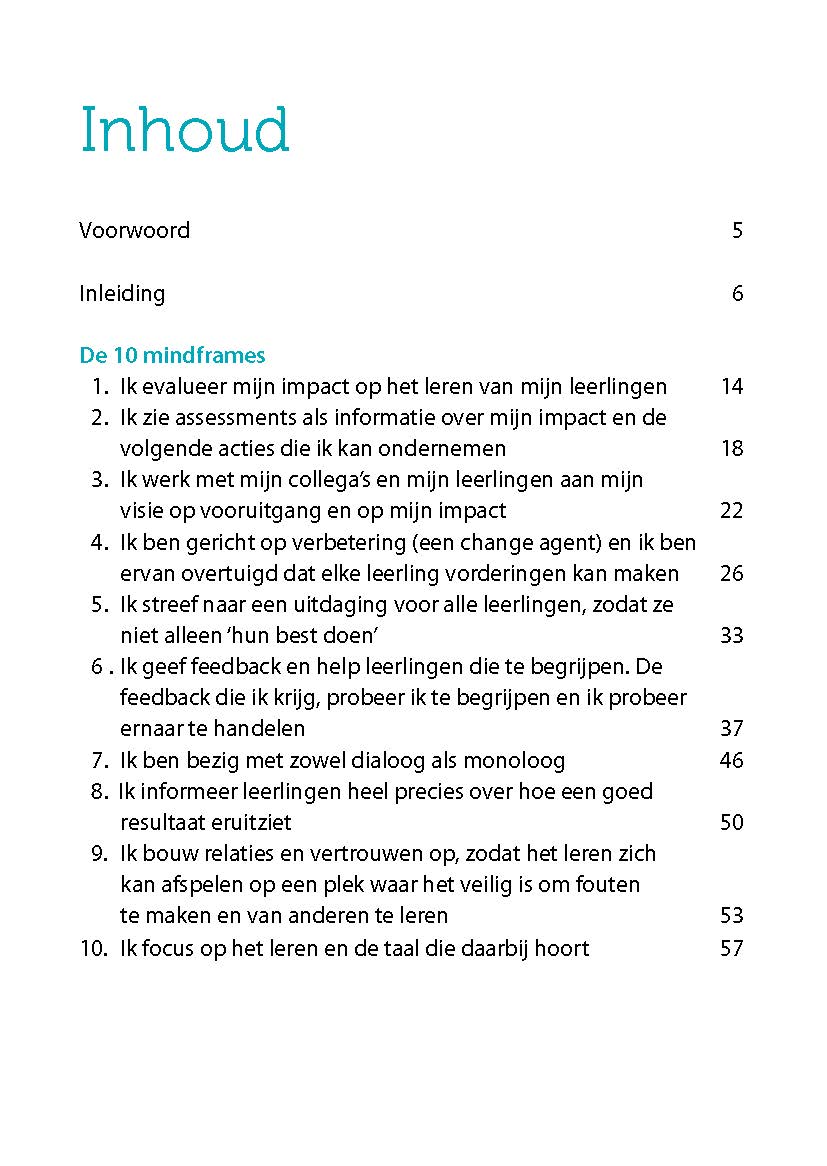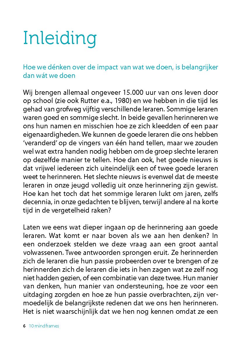 Hoe leraren denken over leren en over hun eigen rol hierin, is een van de belangrijkste invloeden op de leerprestaties van leerlingen. Samen met Klaus Zierer beschrijft John Hattie de mindframes of denkkaders die leraren zich eigen kunnen maken om het maximale uit hun leerlingen te halen. Deze denkkaders komen voort uit het boek Leren zichtbaar maken. Een voorbeeld van zo’n denkkader is: Ik streef naar een uitdaging voor alle leerlingen, zodat ze niet alleen ‘hun best doen’. Als dit je denkkader is, wat betekent dat dan in de praktijk voor je lessen en voor je handelen?