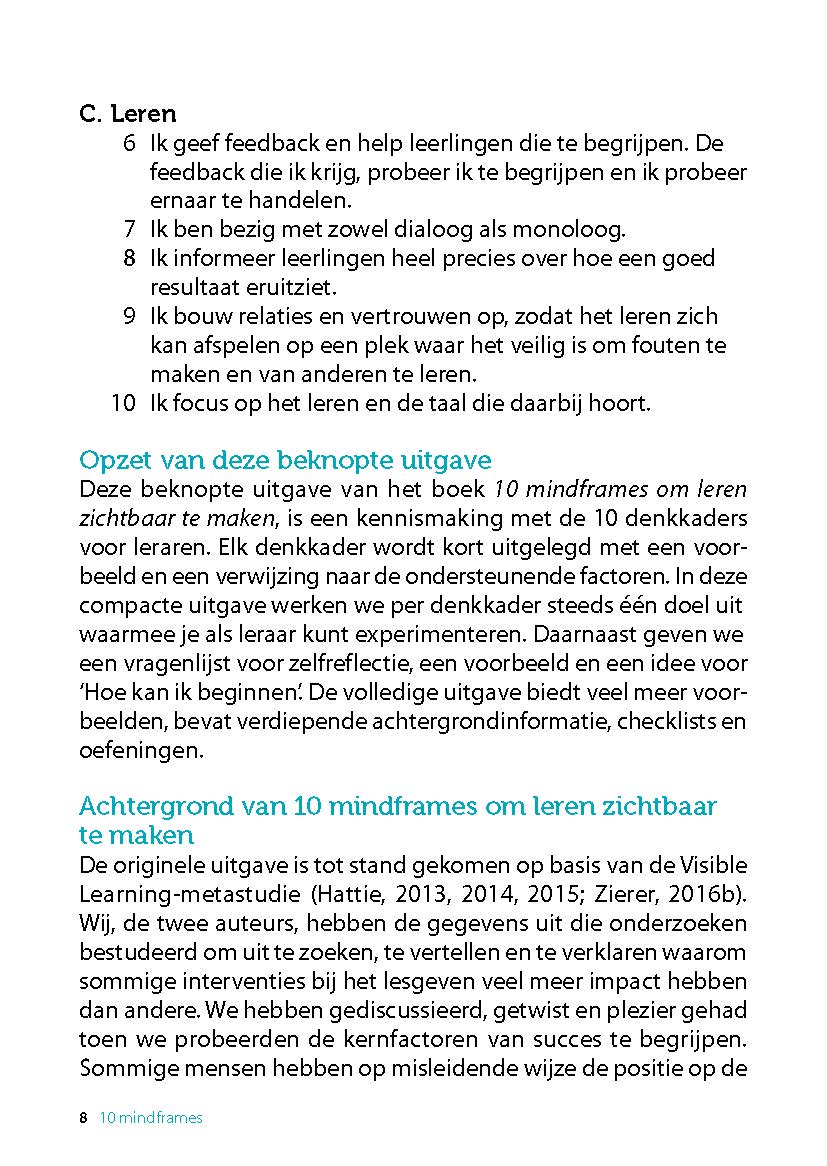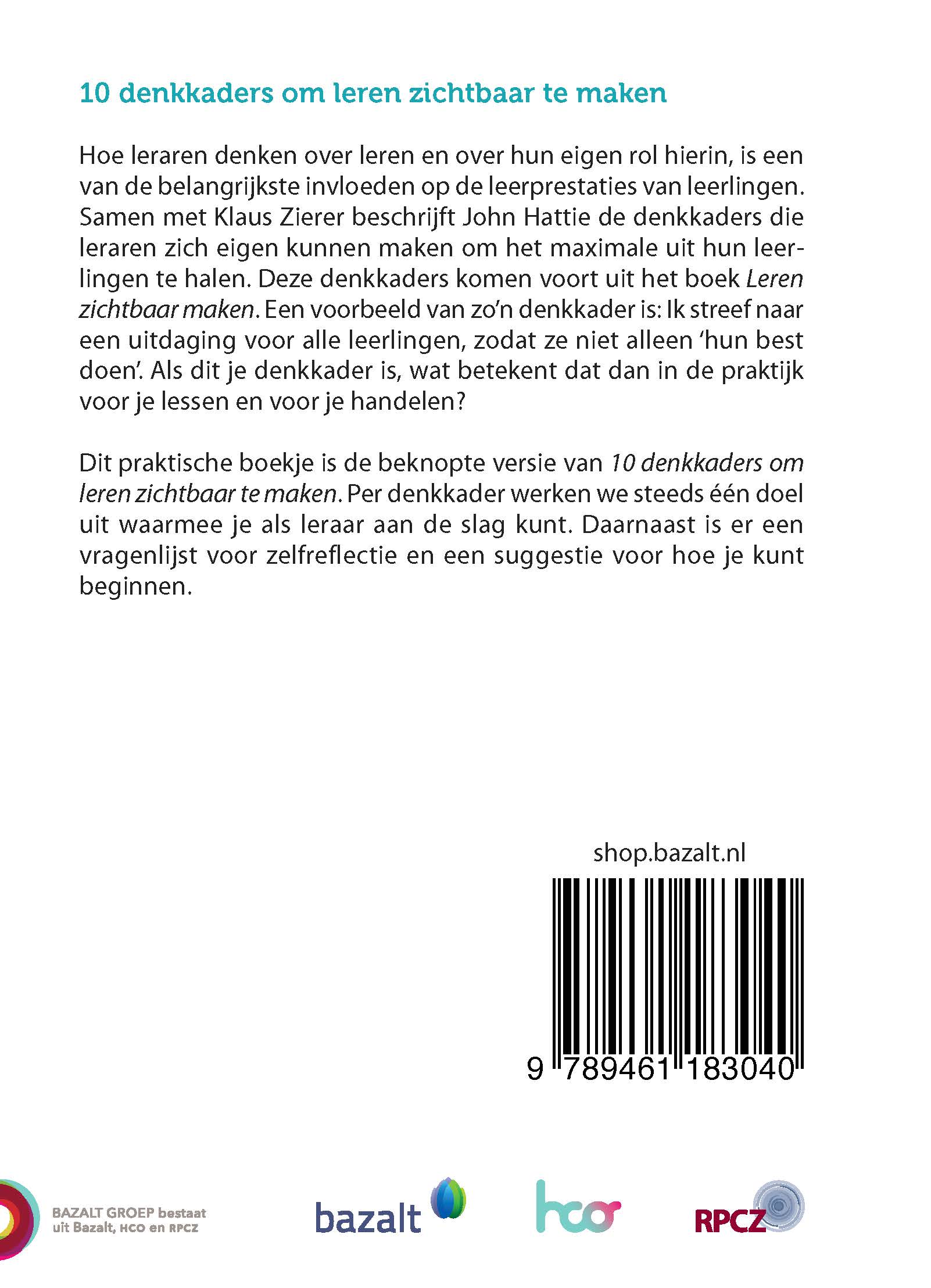 Dit praktische boekje is de beknopte versie van 10 denkkaders om leren zichtbaar te maken. Per denkkader werken we steeds één doel uit waarmee je als leraar aan de slag kunt. Daarnaast is er een vragenlijst voor zelfreflectie en een suggestie voor hoe je kunt beginnen. Elk hoofdstuk sluit af met een checklist en oefeningen die het betreffende denkkader ondersteunen.