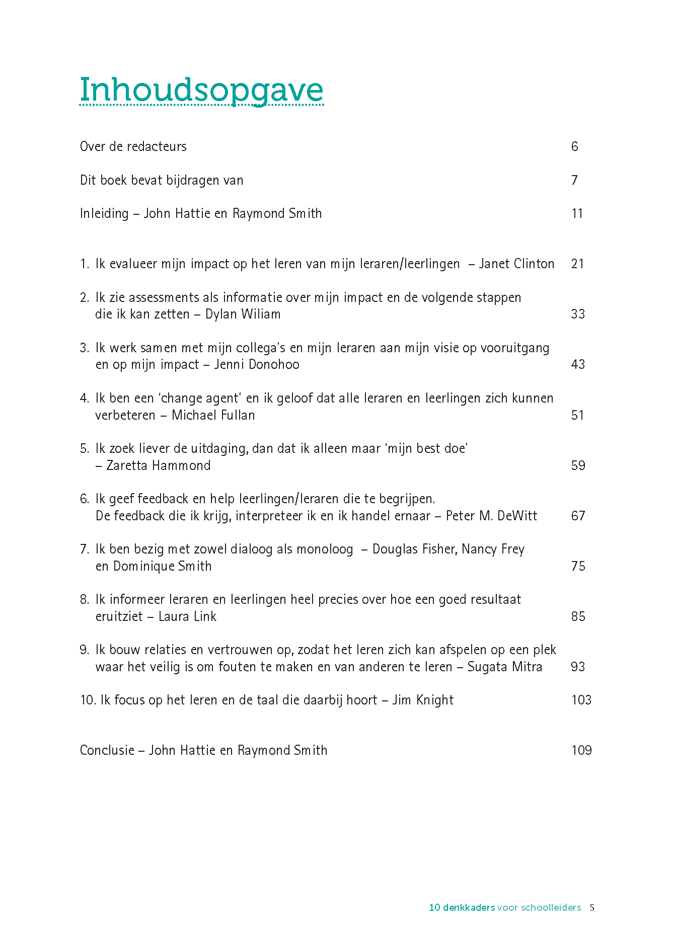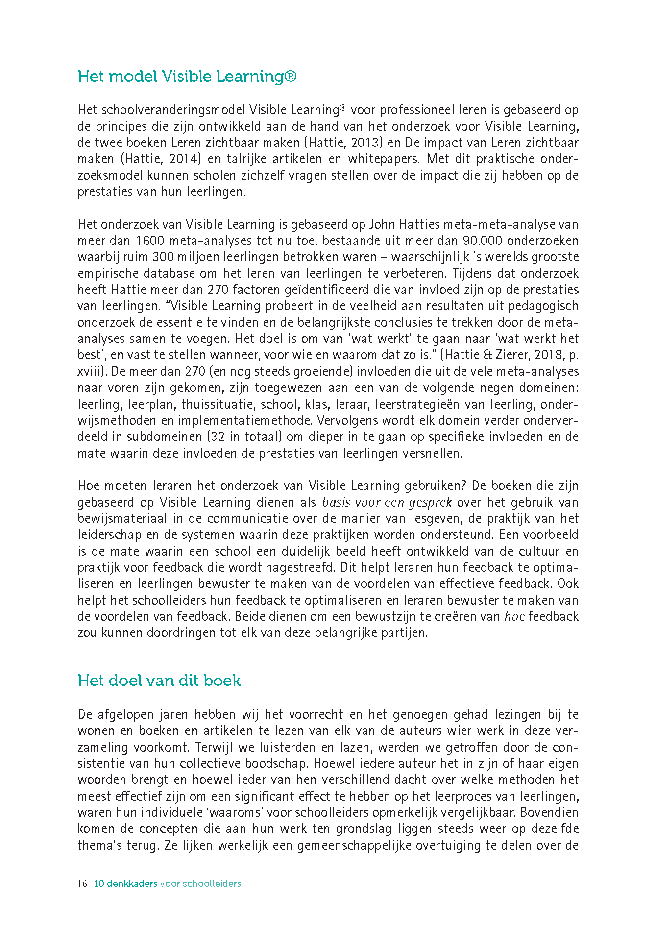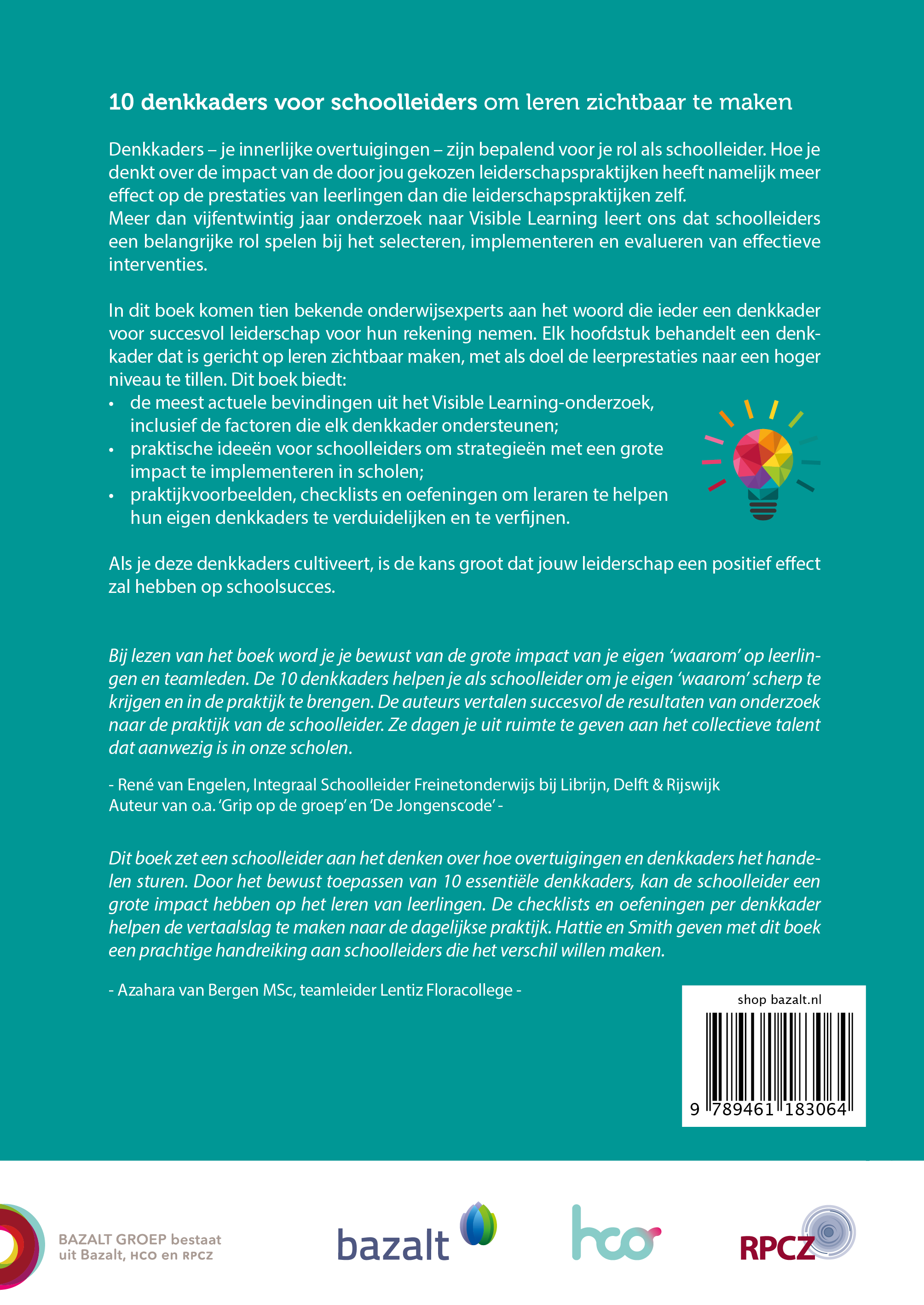 In dit boek komen tien bekende onderwijsexperts aan het woord die ieder een denkkader voor succesvol leiderschap voor hun rekening nemen. Elk hoofdstuk behandelt een denkkader dat is gericht op leren zichtbaar maken, met als doel de leerprestaties naar een hoger niveau te tillen. Dit boek biedt: