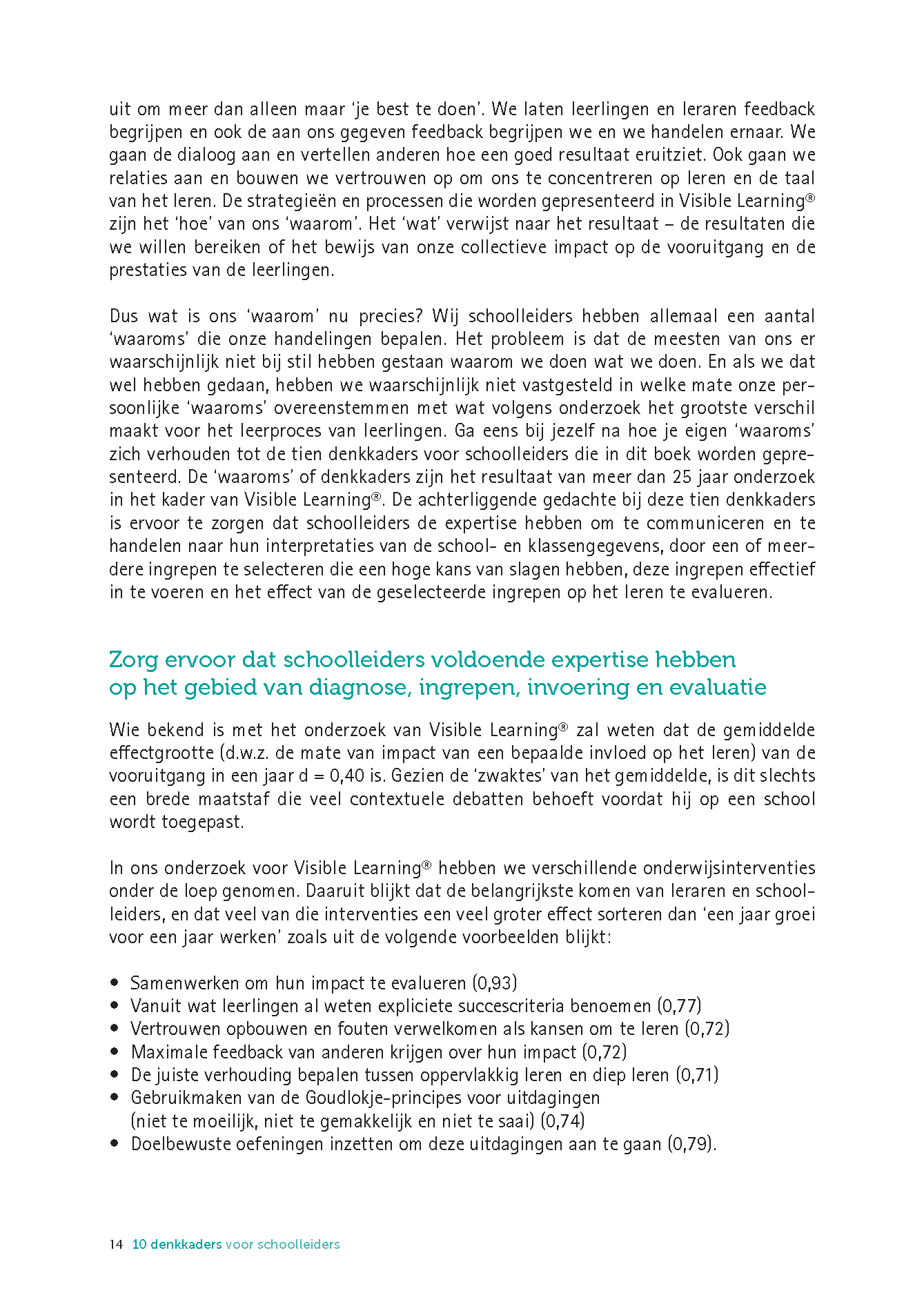 Denkkaders – je innerlijke overtuigingen – zijn bepalend voor je rol als schoolleider. Hoe je denkt over de impact van de door jou gekozen leiderschapspraktijken heeft namelijk meer effect op de prestaties van leerlingen dan die leiderschapspraktijken zelf. Meer dan vijfentwintig jaar onderzoek naar Visible Learning leert ons dat schoolleiders een belangrijke rol spelen bij het selecteren, implementeren en evalueren van effectieve interventies.