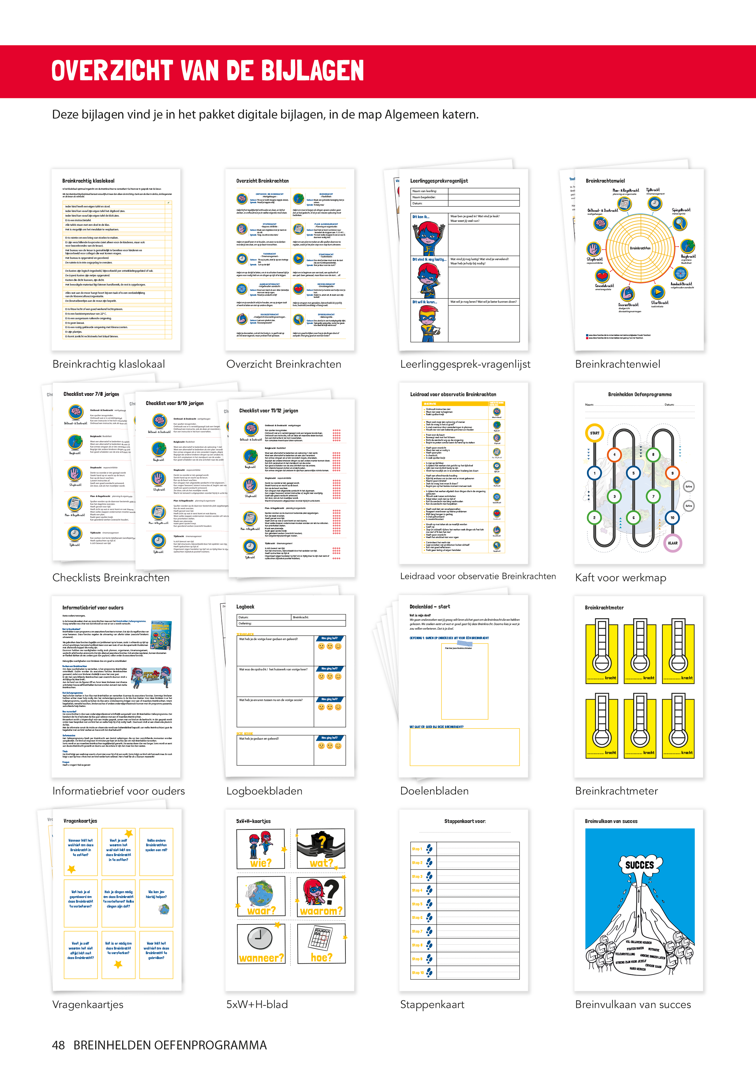 Deze uitgave bestaat uit een ringband met 11 katernen: een algemeen katern en tien losse katernen met aparte oefeningen voor de tien Breinkrachten en digitale bijlagen. Daarmee heb je alle informatie in handen om met een kind: