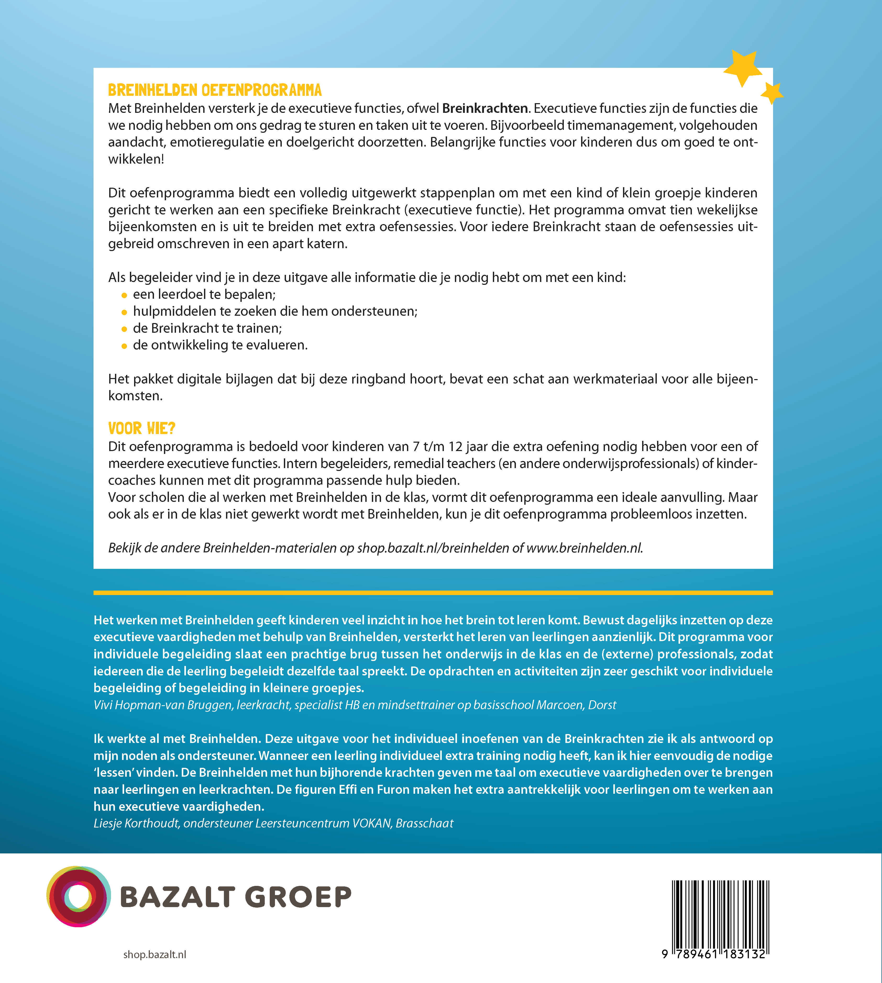 “Het werken met Breinhelden geeft kinderen veel inzicht in hoe het brein tot leren komt. Bewust dagelijks inzetten op deze executieve vaardigheden met behulp van Breinhelden, versterkt het leren van leerlingen aanzienlijk. Dit programma voor individuele begeleiding slaat een prachtige brug tussen het onderwijs in de klas en de (externe) professionals, zodat iedereen die de leerling begeleidt dezelfde taal spreekt. De opdrachten en activiteiten zijn zeer geschikt voor individuele begeleiding of begeleiding in kleinere groepjes.”