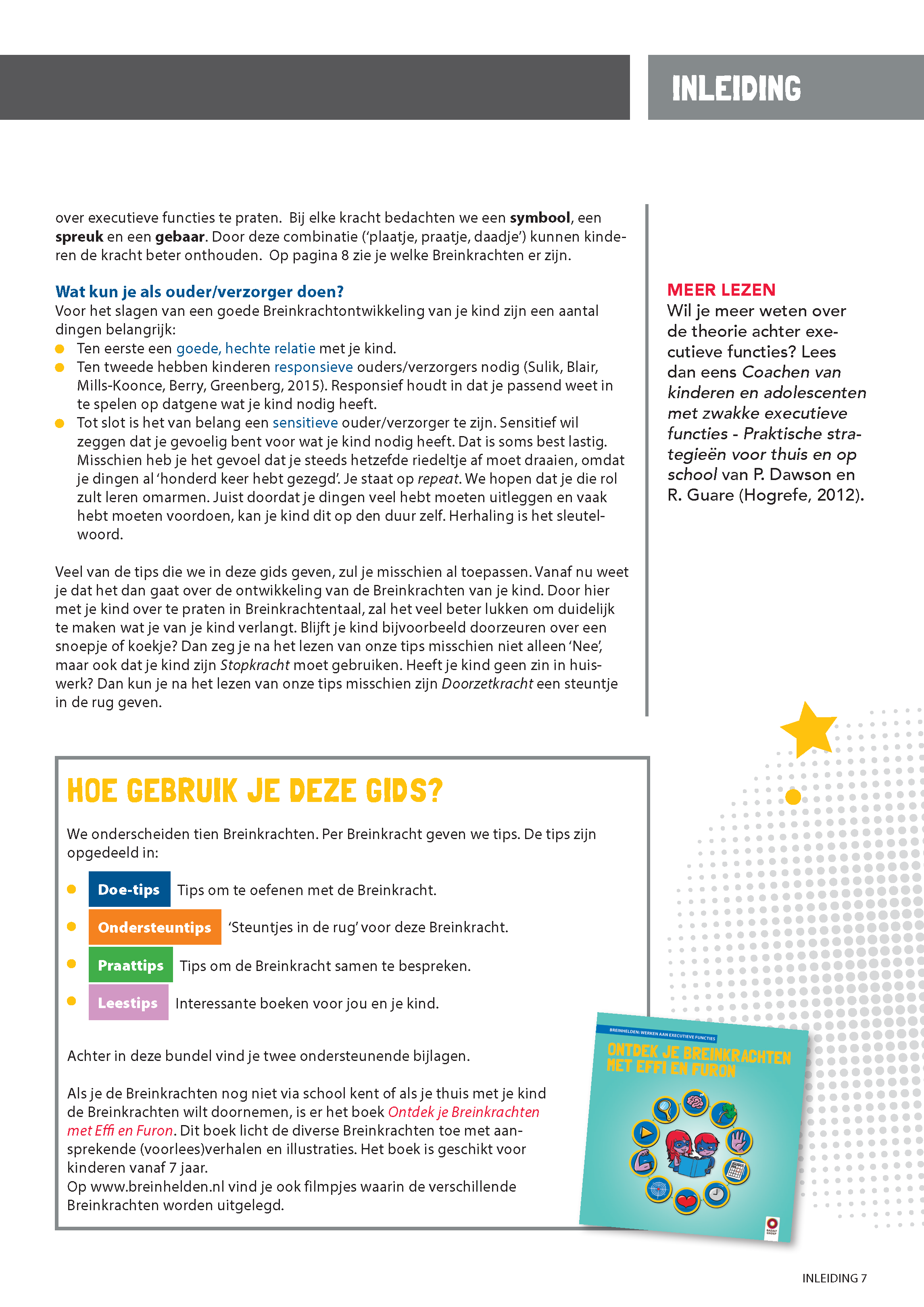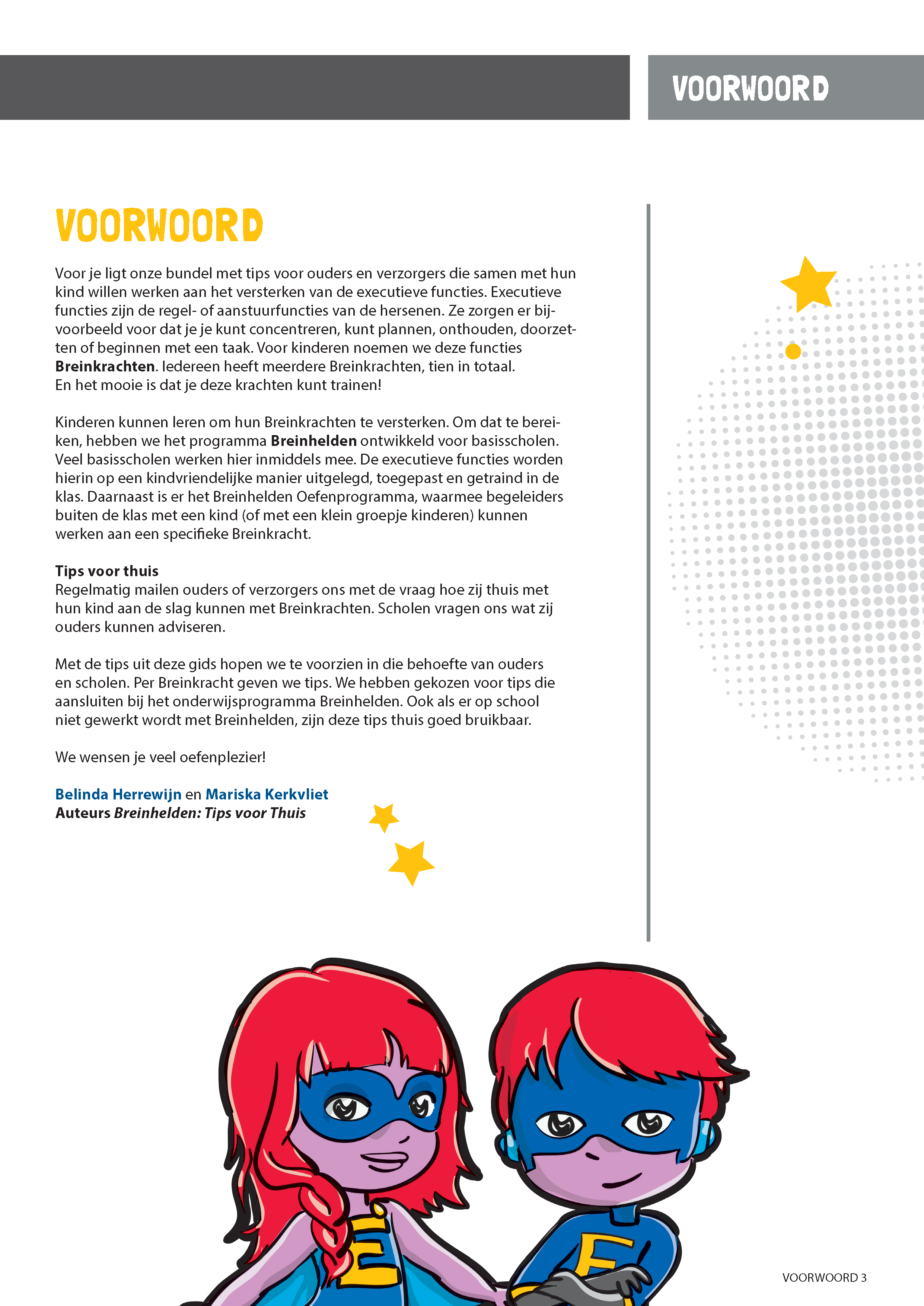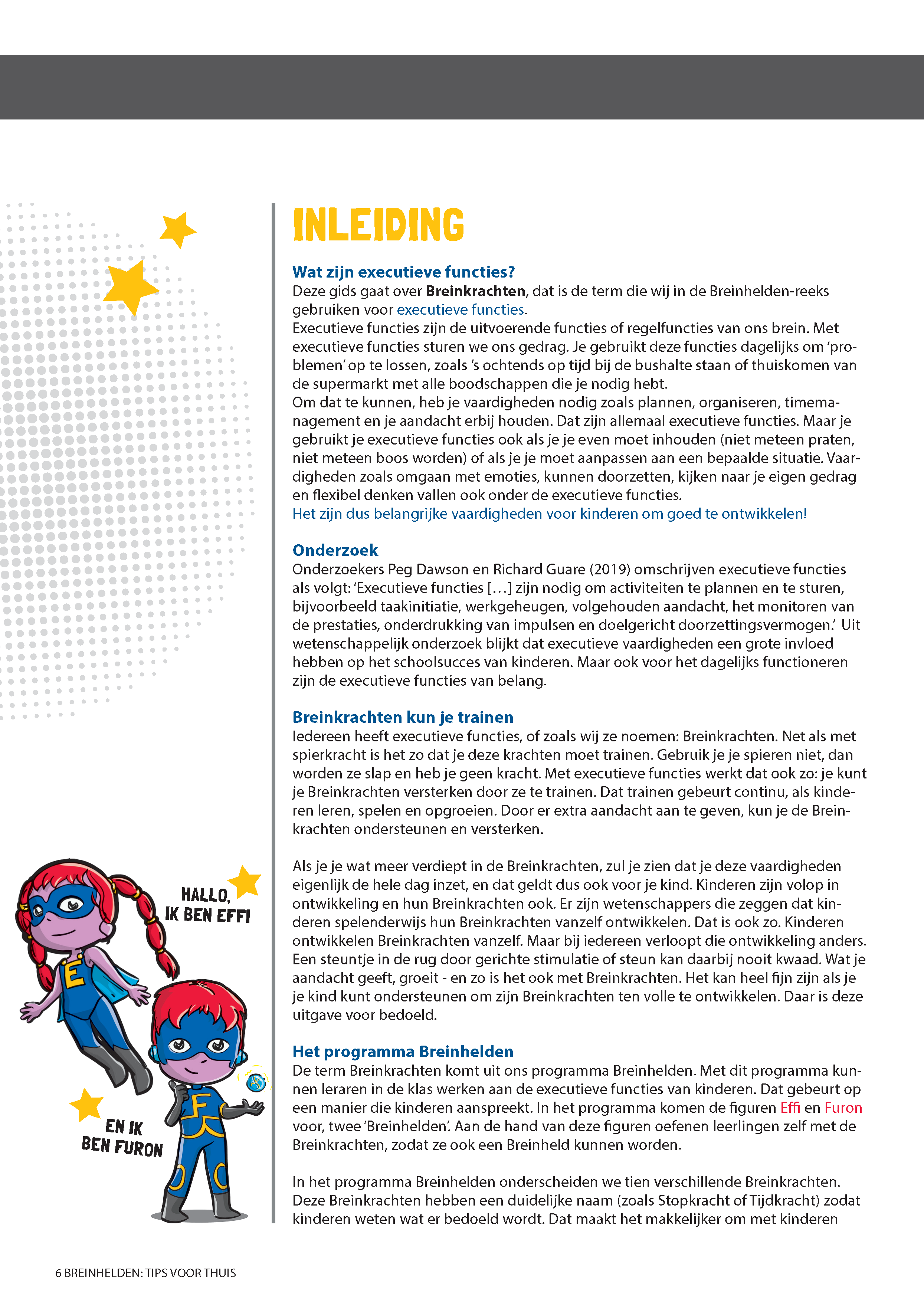Het programma Breinhelden vertaalt de executieve functies naar tien aansprekende Breinkrachten. En net zoals je spierkracht traint om sterker te worden, kun je ook je Breinkrachten trainen en versterken. Dat kan op school, maar ook thuis. Daarvoor is deze gids bedoeld. De gids geeft per Breinkracht tips