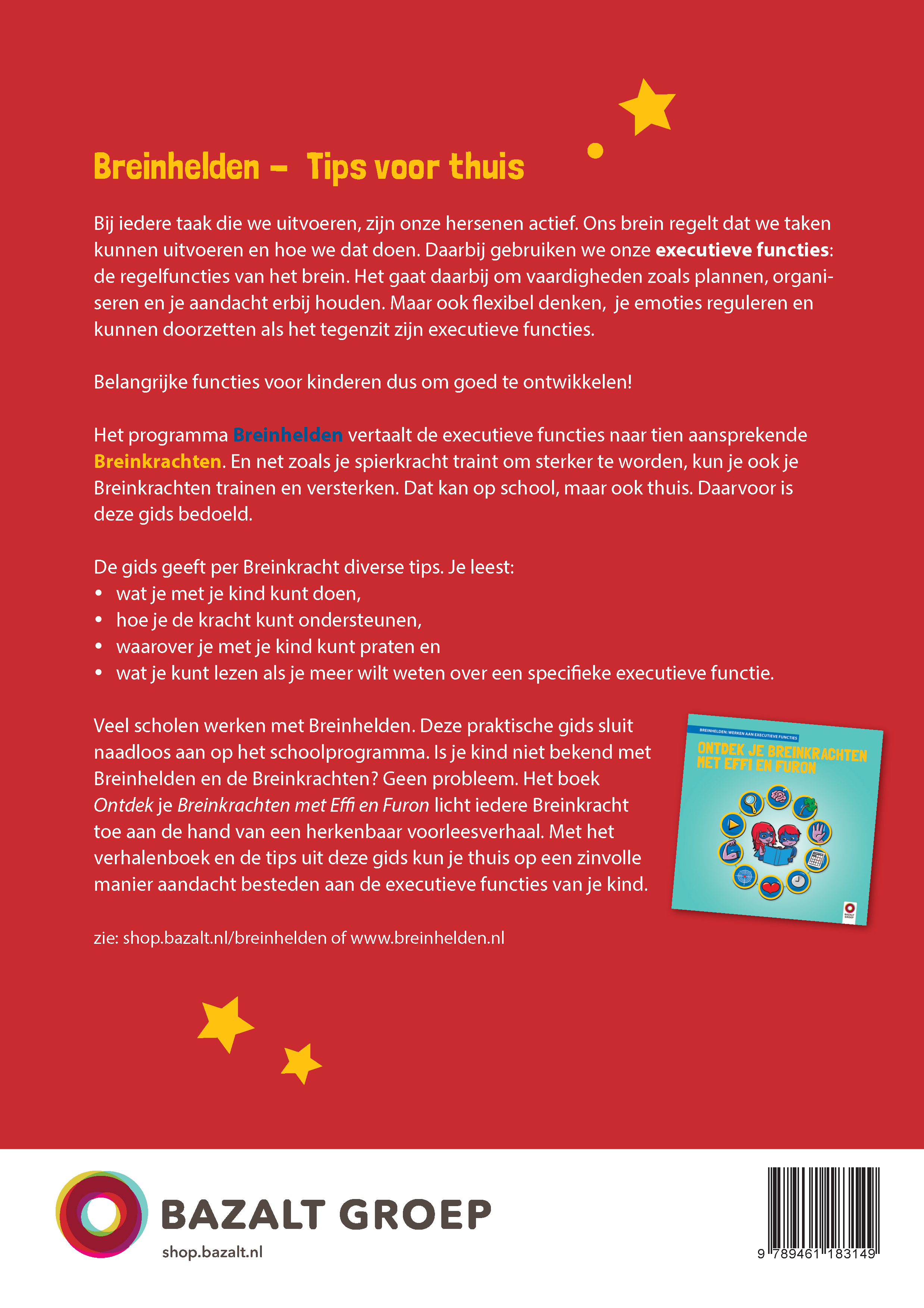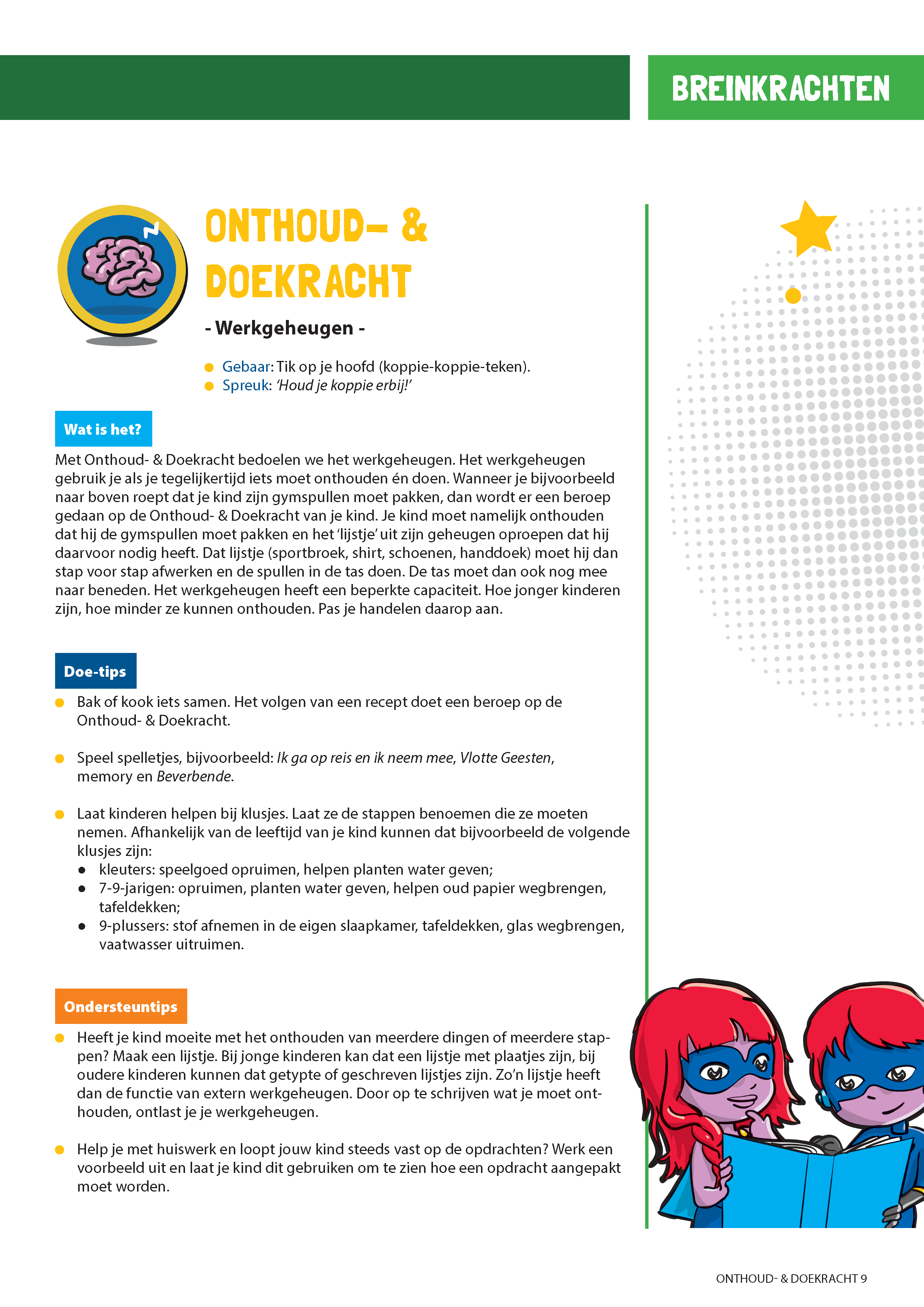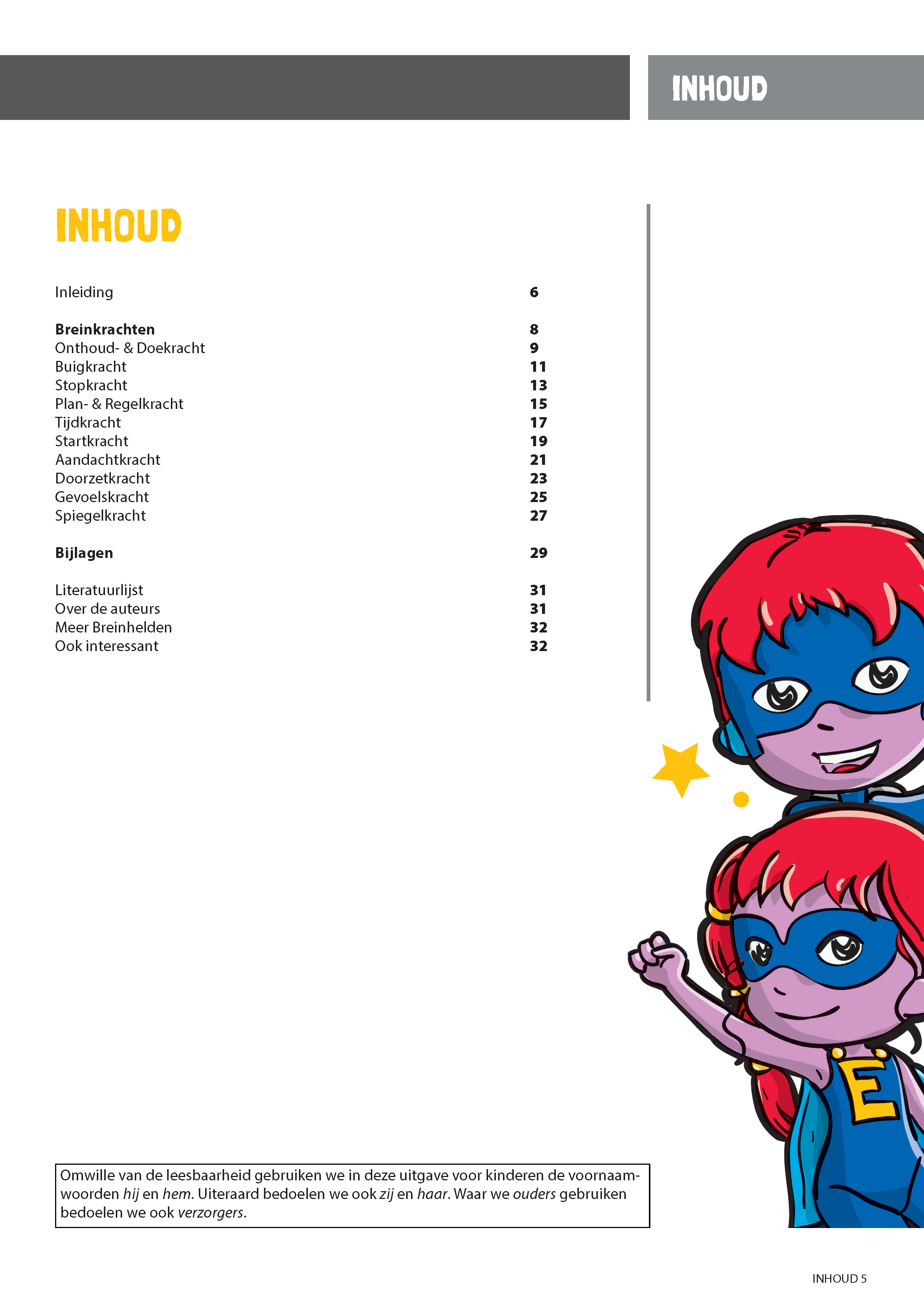 Het programma Breinhelden vertaalt de executieve functies naar tien aansprekende Breinkrachten. En net zoals je spierkracht traint om sterker te worden, kun je ook je Breinkrachten trainen en versterken. Dat kan op school, maar ook thuis. Daarvoor is deze gids bedoeld. De gids geeft per Breinkracht tips
