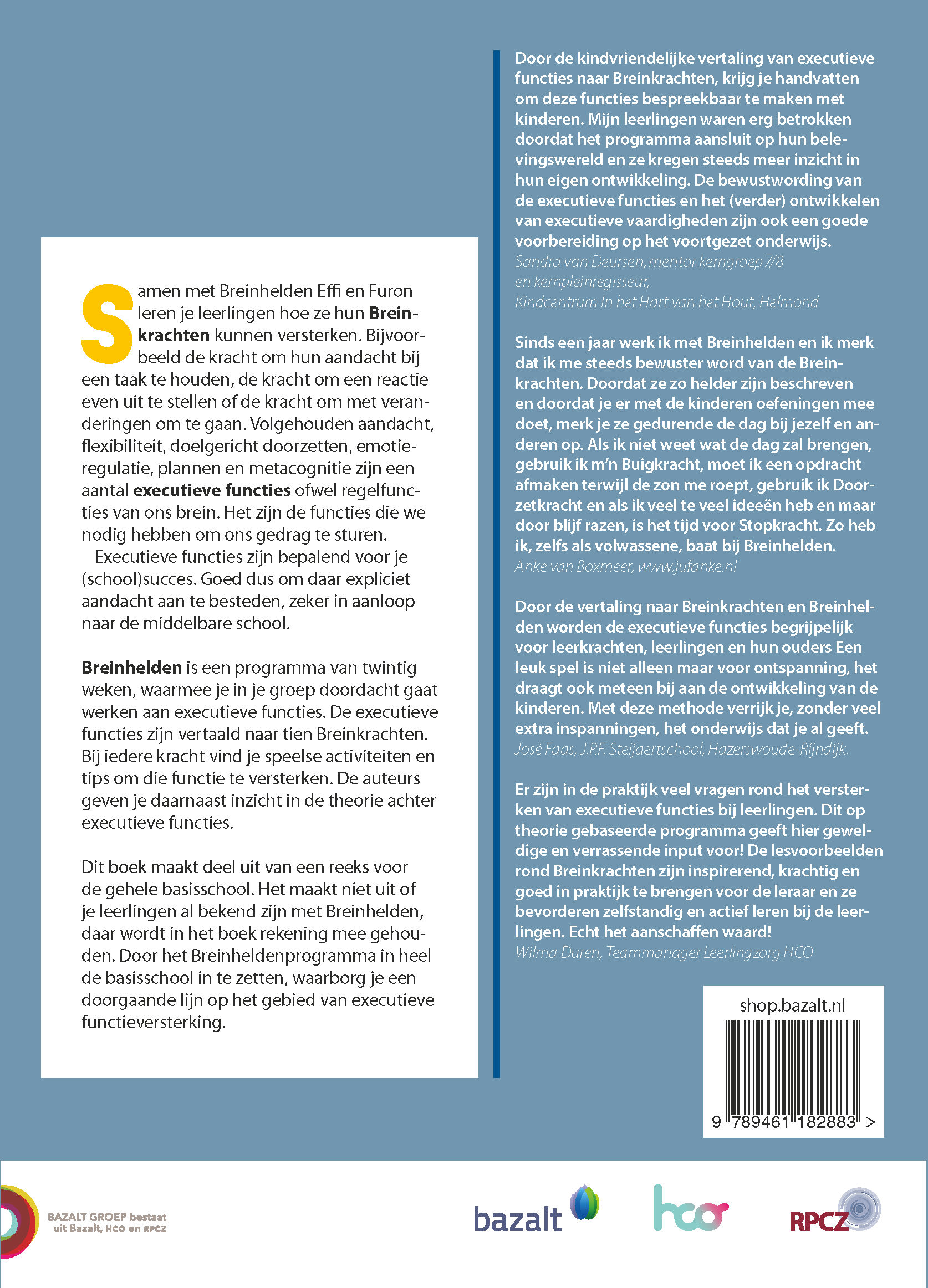 "Door de vertaling naar Breinkrachten en Breinhelden worden de executieve functies begrijpelijk voor leerkrachten, leerlingen en hun ouders Een leuk spel is niet alleen maar voor ontspanning, het draagt ook meteen bij aan de ontwikkeling van de kinderen. Met deze methode verrijk je, zonder veel extra inspanningen, het onderwijs dat je al geeft."