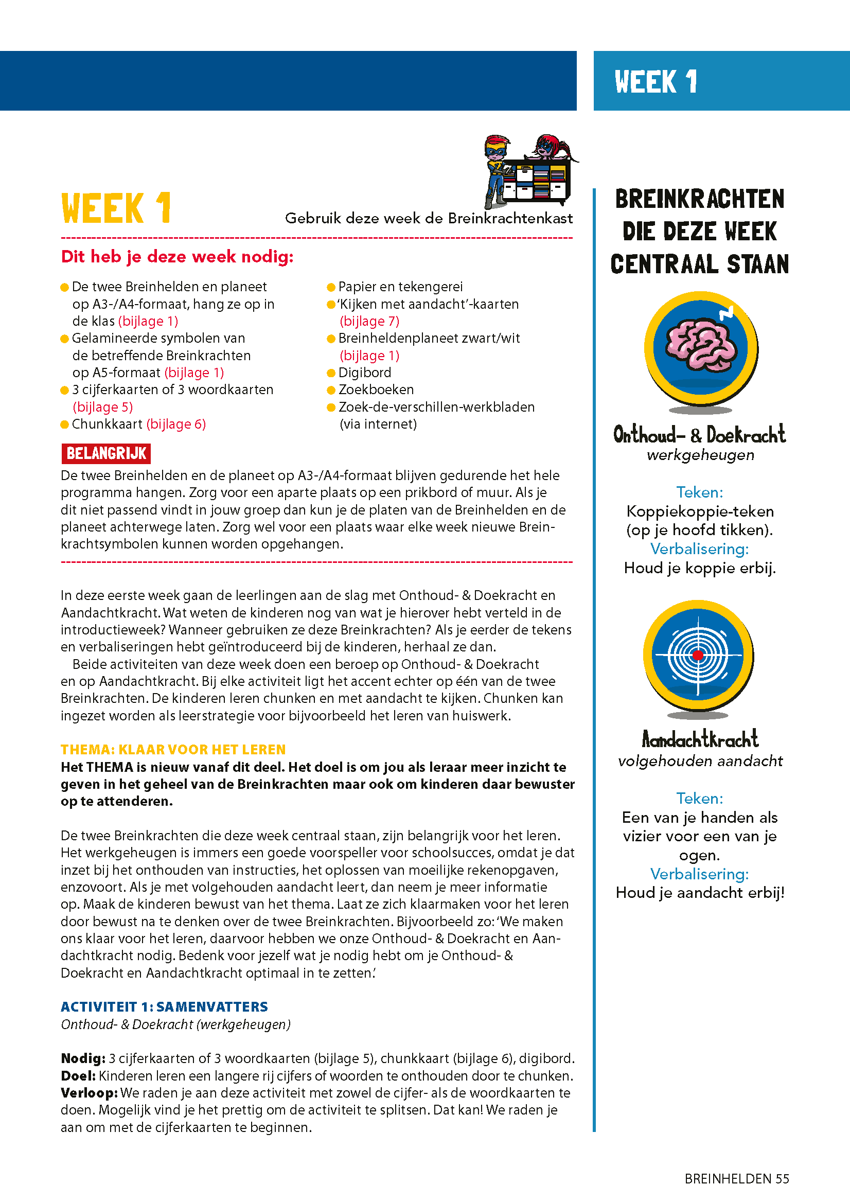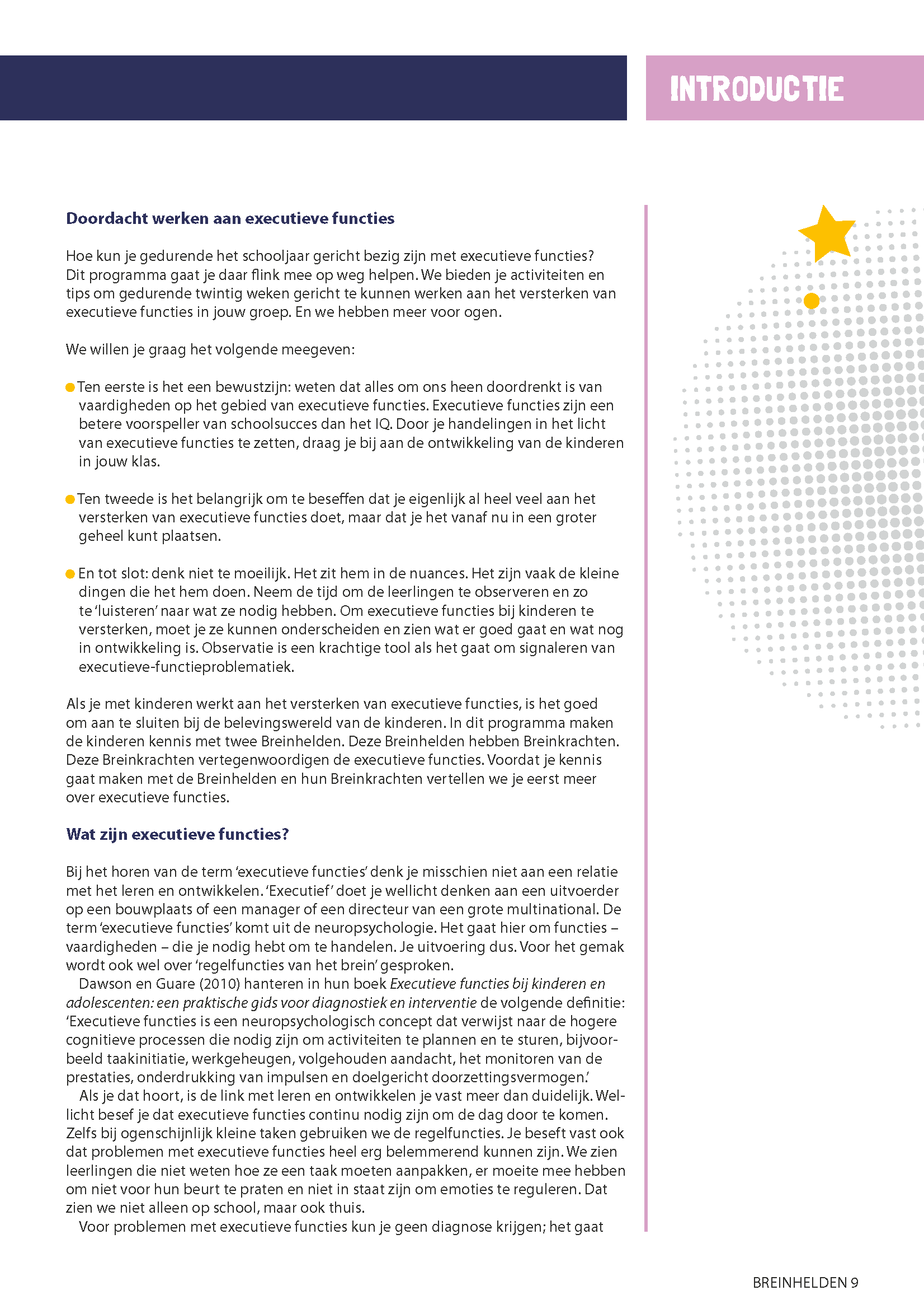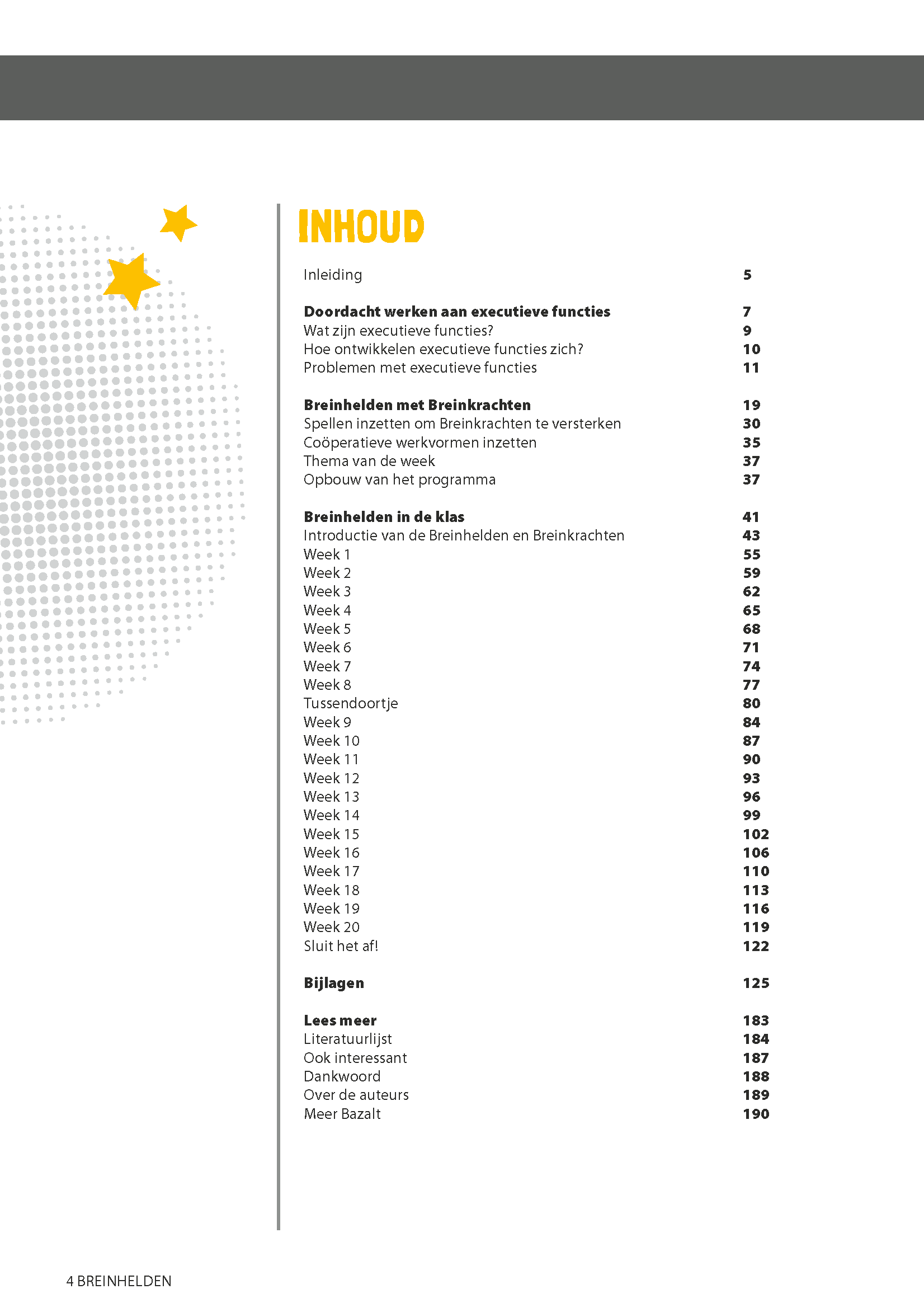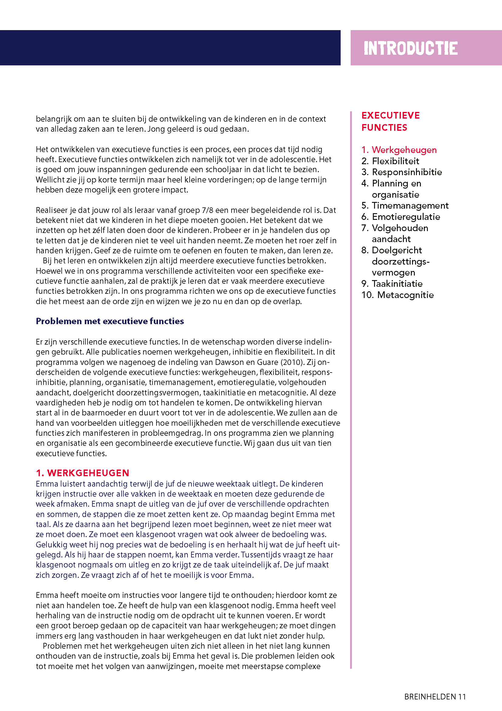 Breinhelden is een programma van twintig weken, waarmee je in je groep doordacht gaat werken aan executieve functies. De executieve functies zijn vertaald naar tien Breinkrachten. Bij iedere kracht vind je speelse activiteiten en tips om die functie te versterken. De auteurs geven je daarnaast inzicht in de theorie achter executieve functies.