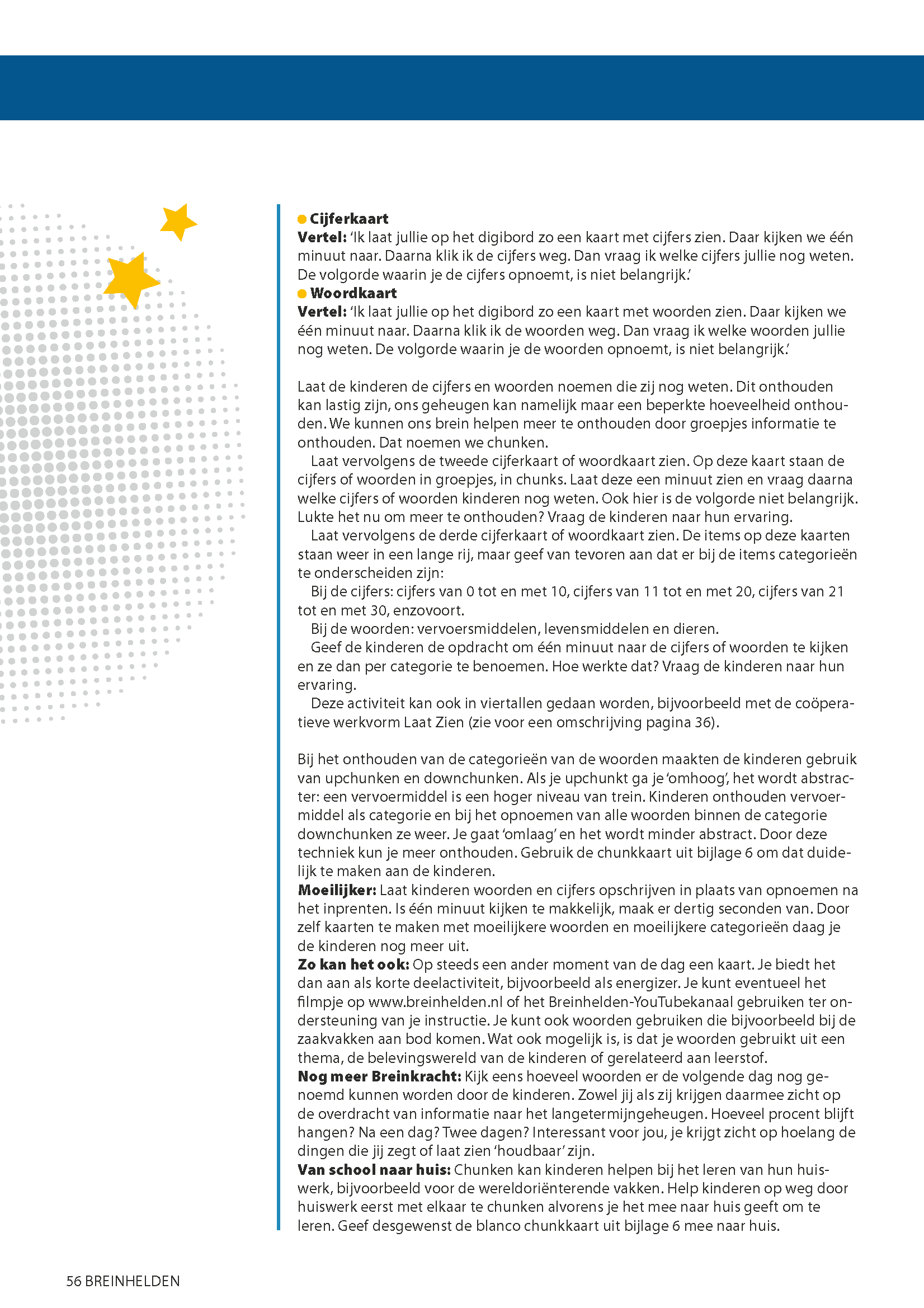 "Er zijn in de praktijk veel vragen rond het versterken van executieve functies bij leerlingen. Deze op theorie gebaseerde uitgave geeft hier geweldige en verrassende input voor! De lesvoorbeelden rond Breinkrachten zijn inspirerend, krachtig en goed in praktijk te brengen voor de leraar en ze bevorderen zelfstandig en actief leren bij de leerlingen. Deze kunnen met het portfolio zicht krijgen op de ontwikkeling van hun Breinkrachten. Pluspunt is dat ouders hier met tastbare, levendige tips voor thuis in meegenomen worden. Echt het aanschaffen waard!"
