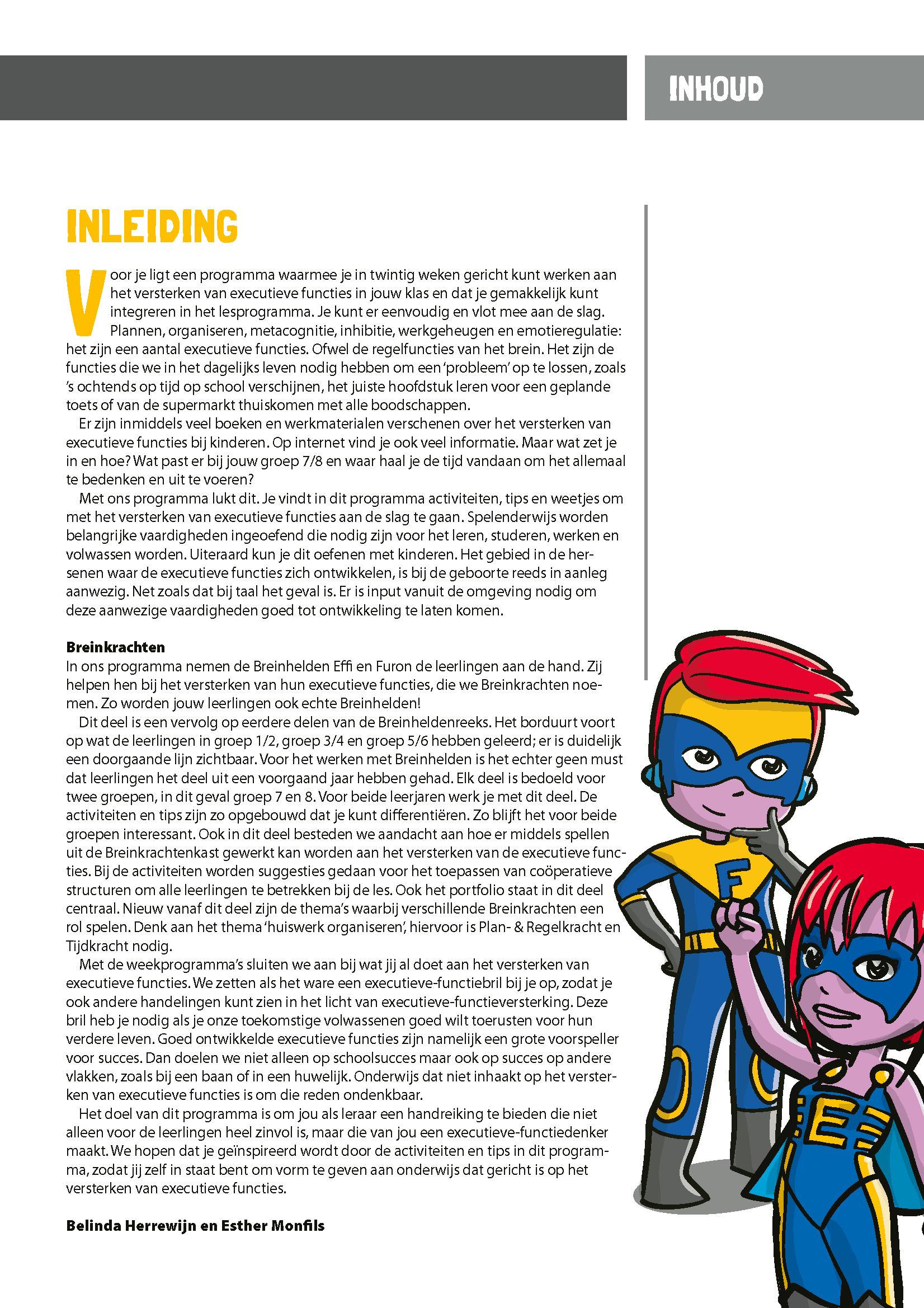 Samen met Breinhelden Effi en Furon leren je leerlingen hoe ze hun Breinkrachten kunnen versterken. Bijvoorbeeld de kracht om hun aandacht bij een taak te houden, de kracht om een reactie even uit te stellen of de kracht om met veranderingen om te gaan. Volgehouden aandacht, flexibiliteit, doelgericht doorzetten, emotie-regulatie, plannen en metacognitie zijn een aantal executieve functies ofwel regelfuncties van ons brein. Het zijn de functies die we nodig hebben om ons gedrag te sturen.