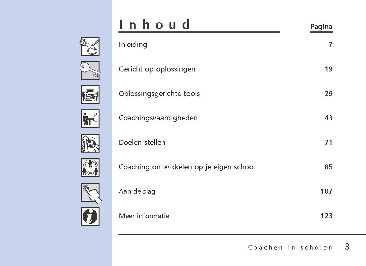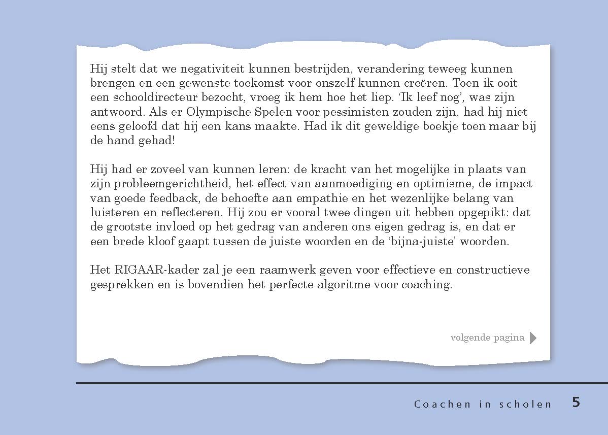 Dit praktische boekje gaat uit van de kracht van oplossingsgericht coachen, het effect van aanmoediging en optimisme, de impact van goede feedback en het wezenlijke belang van luisteren en reflecteren.