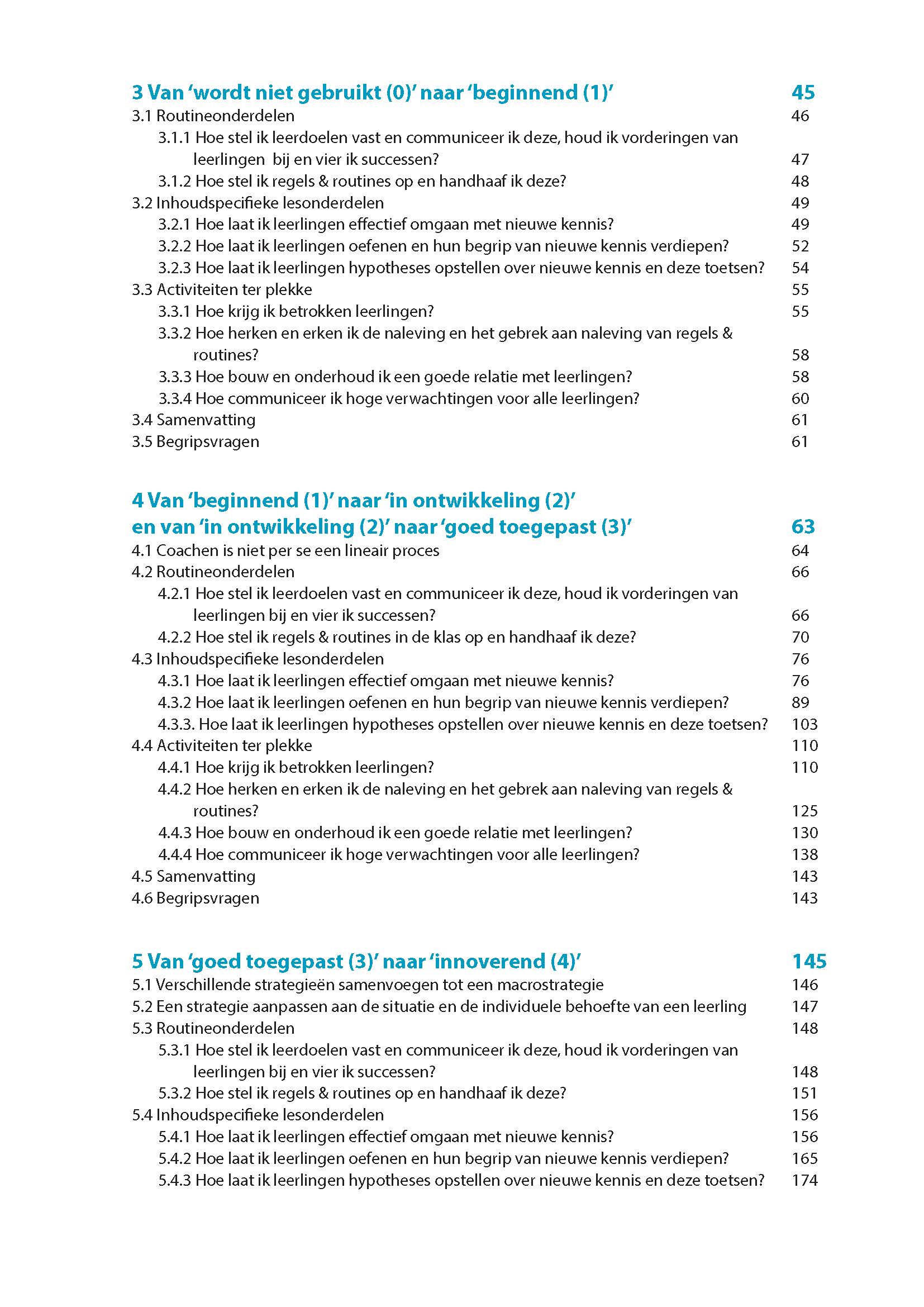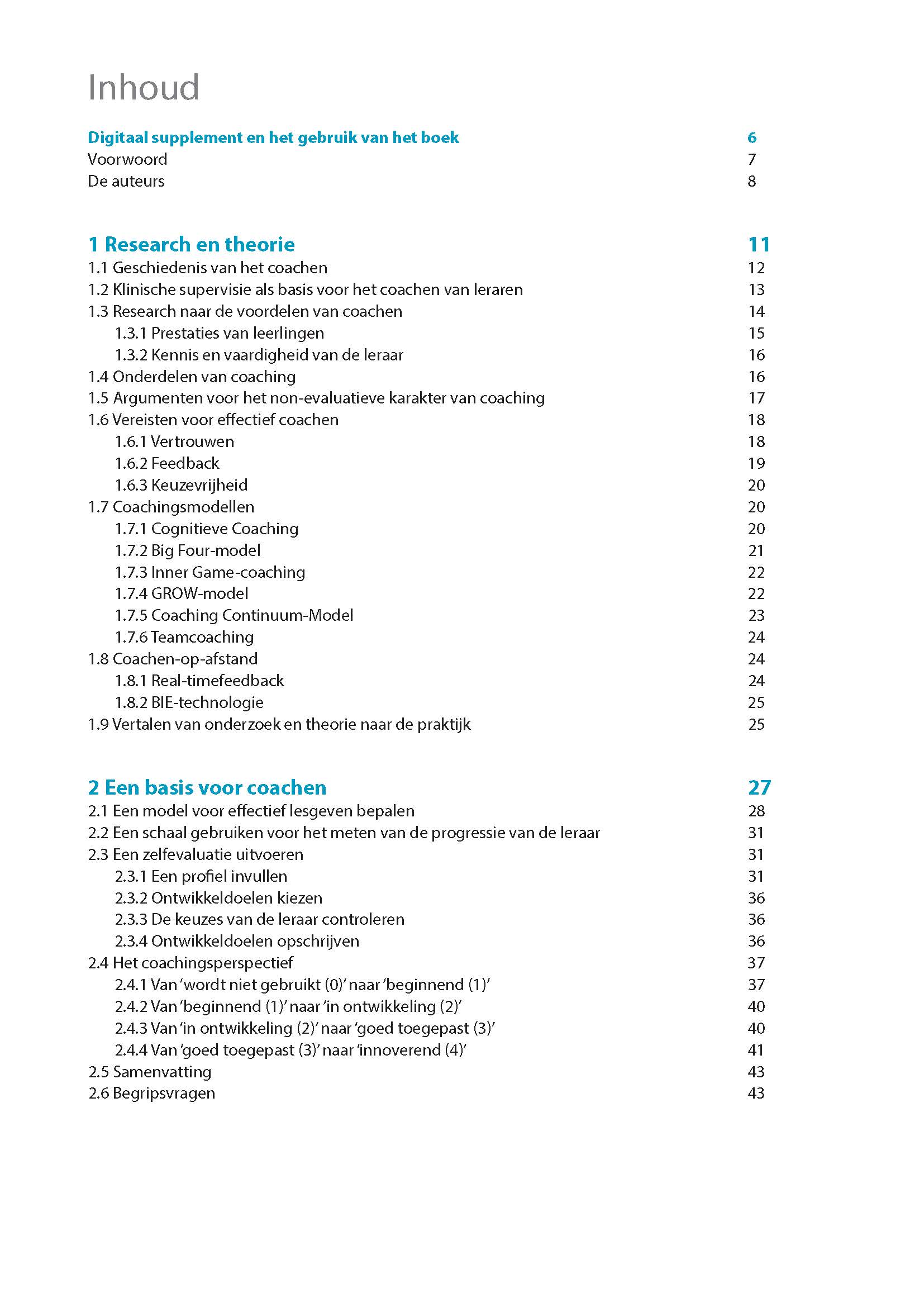 Reflectie is essentieel om een steeds betere leraar te worden. Leraren kunnen hun onderwijsvaardigheden verbeteren als ze kritisch kijken naar hun manier van werken, als ze zichzelf haalbare doelen stellen en als ze focussen op oefening en feedback om deze doelen te halen. Dat vergt veel van een leraar. Bij een complexe taak als lesgeven is het bijzonder moeilijk om zonder enige hulp het hoogste niveau te bereiken en vast te houden. Coaching is een zeer effectieve manier om leraren daarbij te helpen. Dit boek leert coaches gerichte feedback te geven en de precieze stappen te bepalen die leraren kunnen zetten om hun expertise in het lesgeven te vergroten. Het boek gaat uit van Robert Marzano’s model voor goed onderwijs.