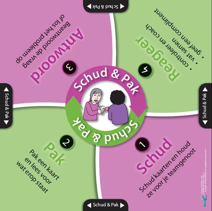 De LeerlingKiezer is een stevige, geplastificeerde kaart met een draaibare wijzer. Bijvoorbeeld in te zetten op het moment dat bepaald moet worden wie van een team leerlingen begint.