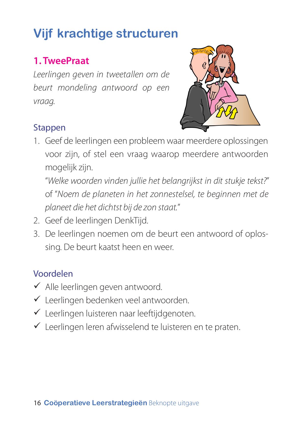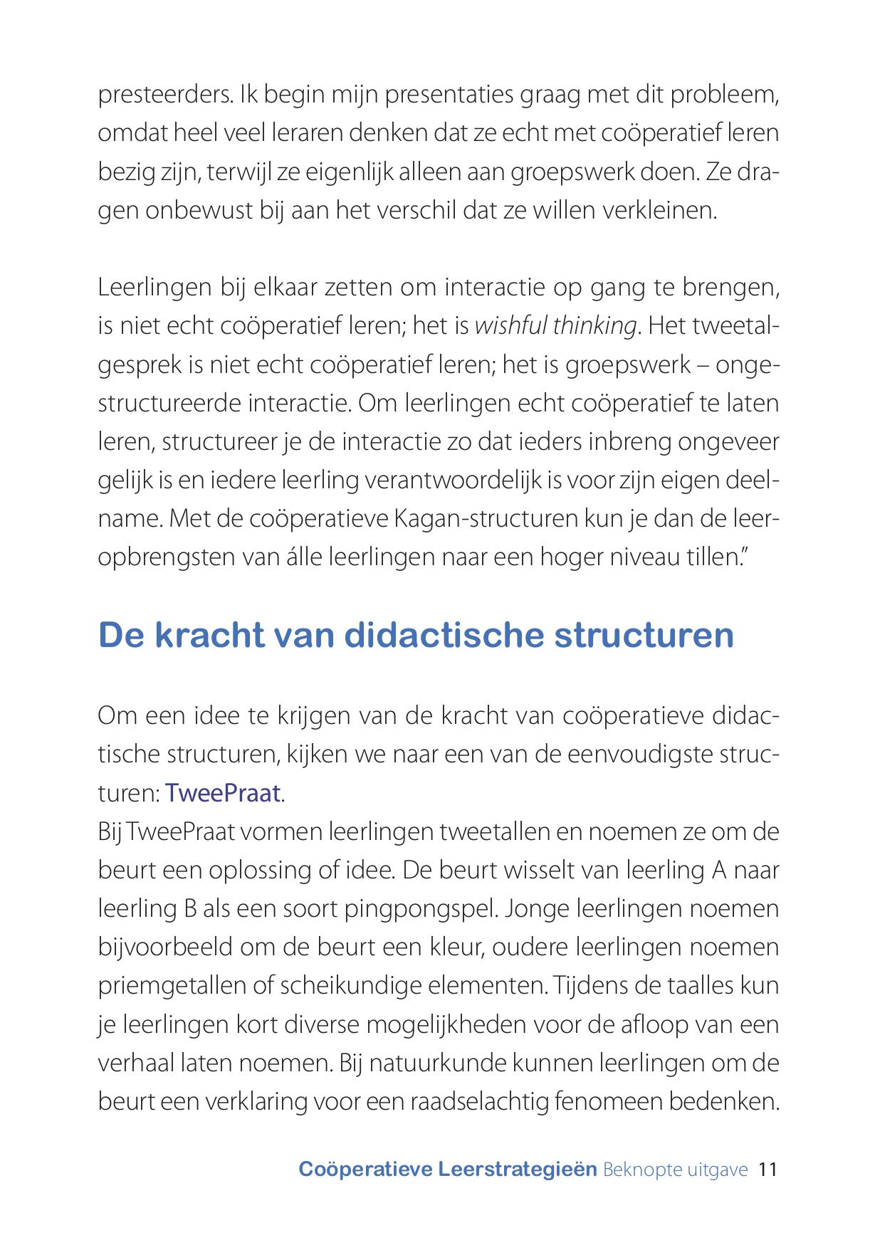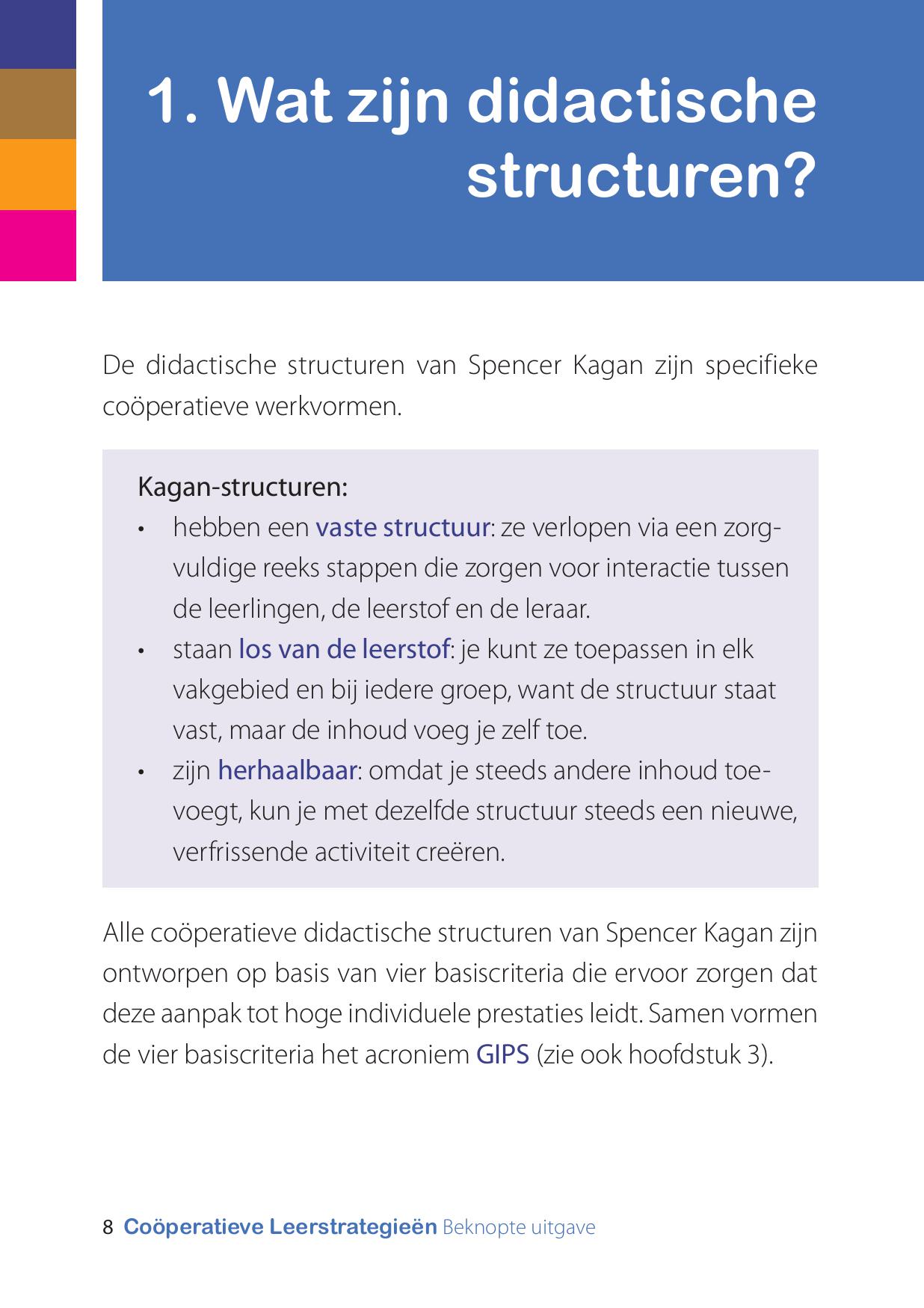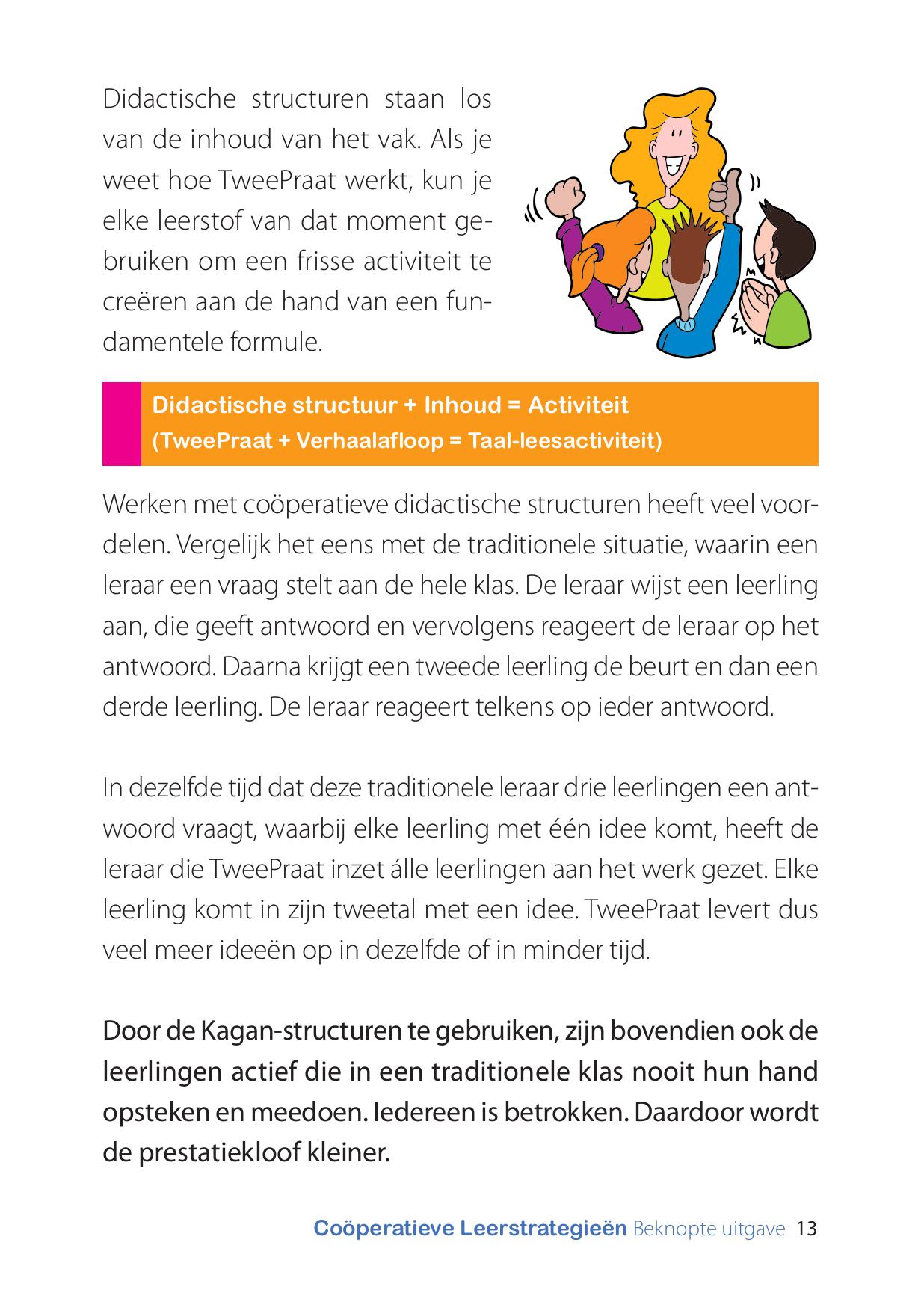 De didactische structuren in dit boekje zijn meteen in te zetten in je eigen situatie. Ook vind je in vogelvlucht de principes van de werkwijze Coöperatieve Leerstrategieën van Spencer Kagan.