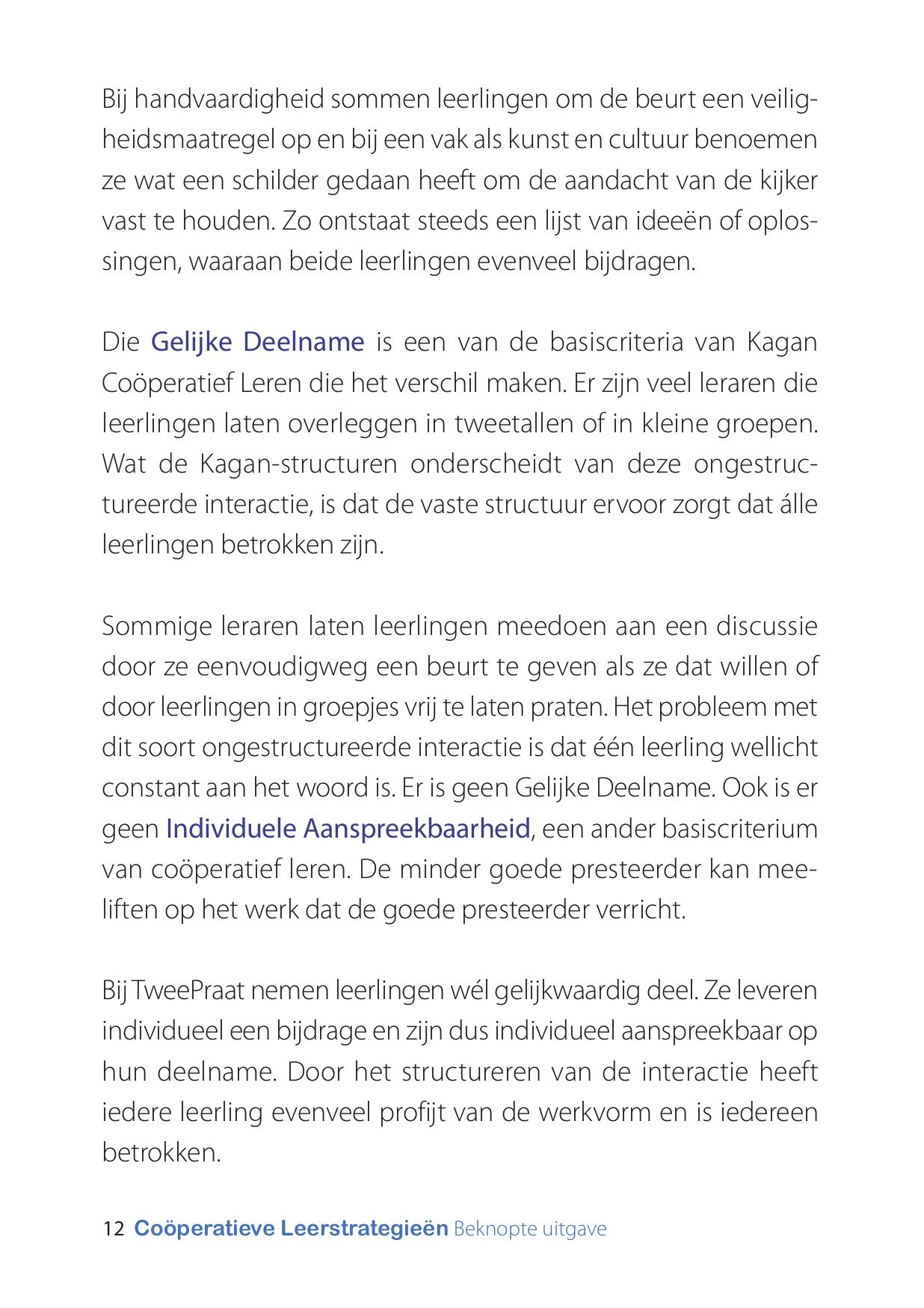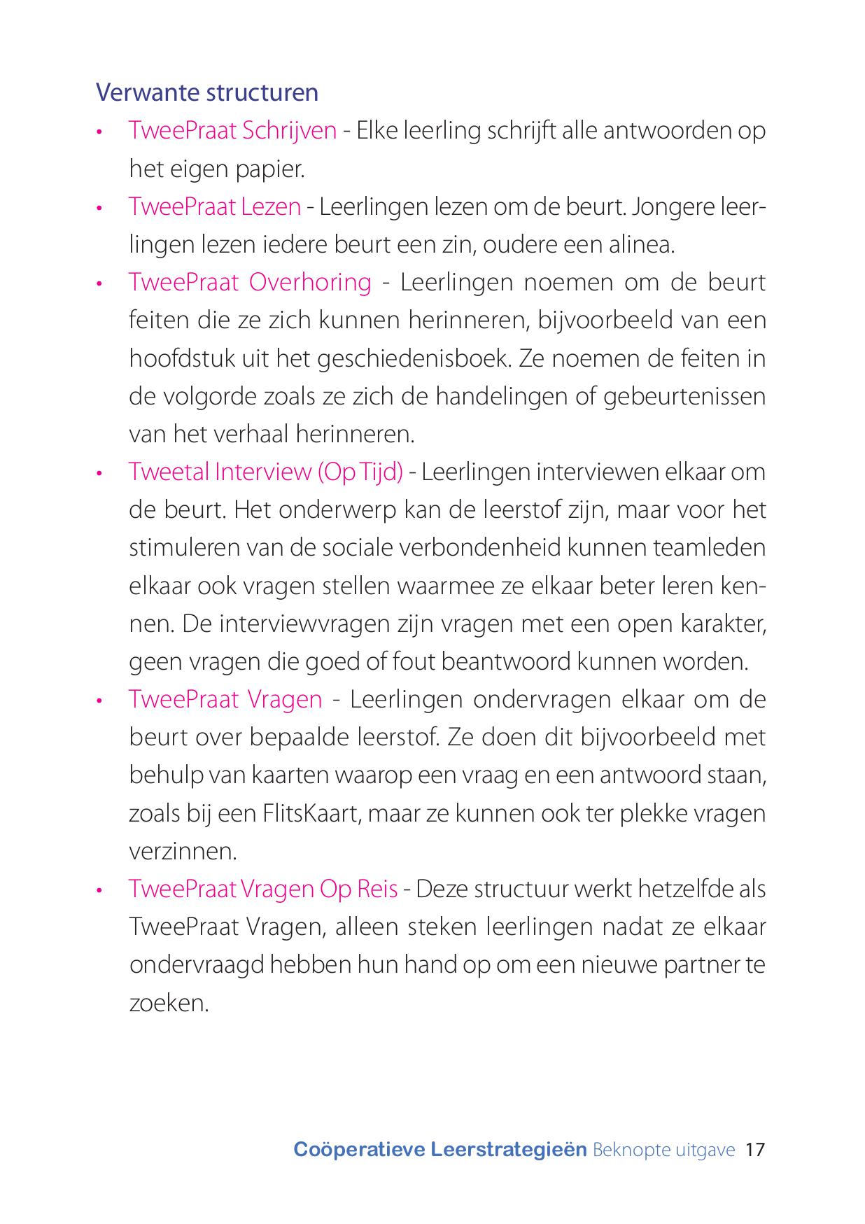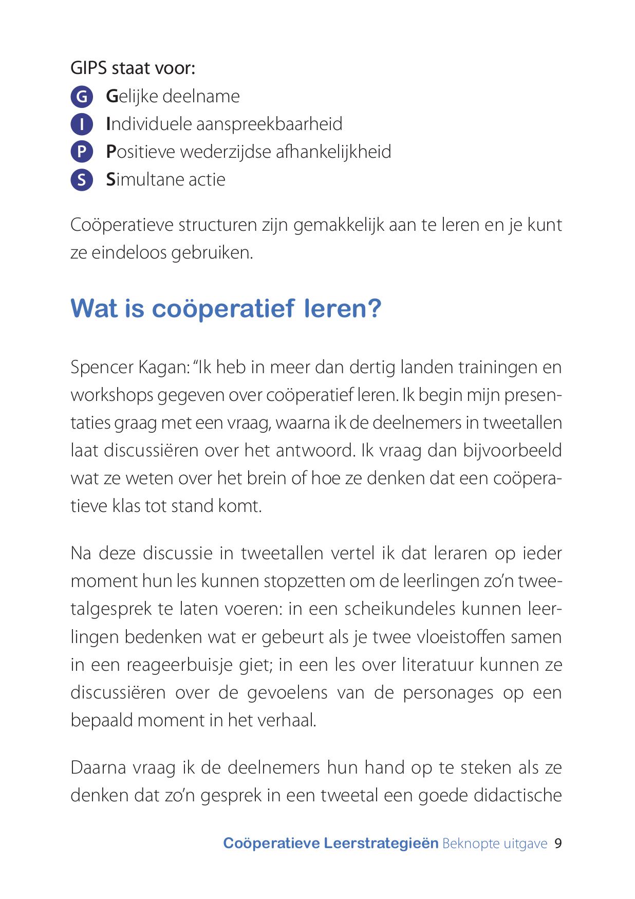 Gebruik je zijn werkwijze en de uitgave Coöperatieve Leerstrategieën, dan heb je met deze beknopte versie de hoofdpunten van de werkwijze en enkele structuren voor een snelle impuls op de actieve deelname en betrokkenheid, bij de hand.