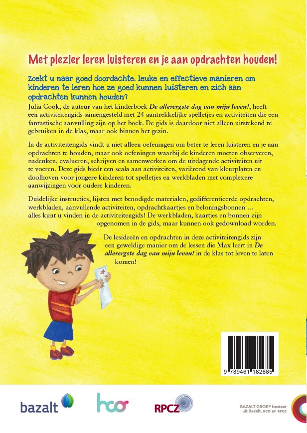 Julia Cook, de auteur van het kinderboek De allerergste dag van mijn leven!, heeft een activiteitengids samengesteld met 24 aantrekkelijke spelletjes en activiteiten die een fantastische aanvulling zijn op het boek. De gids is daardoor niet alleen uitstekend te gebruiken in de klas, maar ook binnen het gezin.