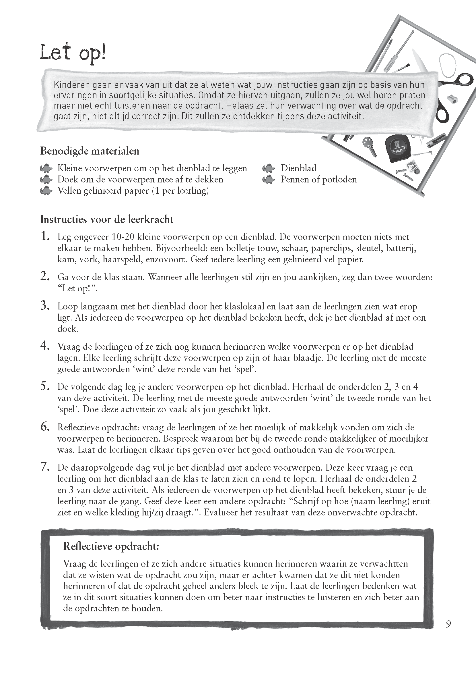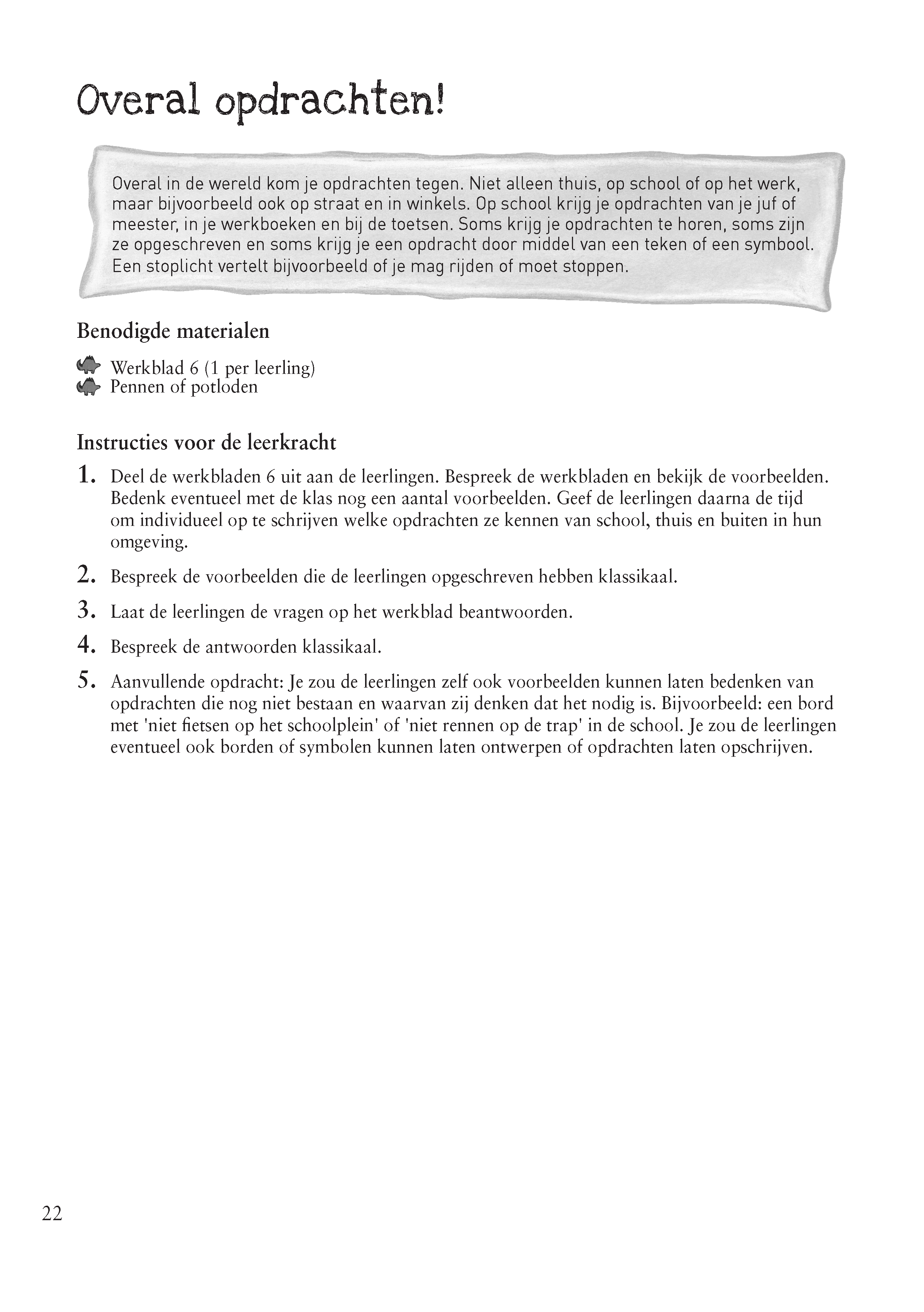 Duidelijke instructies, lijsten met benodigde materialen, gedifferentieerde opdrachten, werkbladen, aanvullende activiteiten, opdrachtkaartjes en beloningsbonnen … alles kunt u vinden in de activiteitengids! De werkbladen, kaartjes en bonnen zijn opgenomen in de gids, maar kunnen ook gedownload worden.