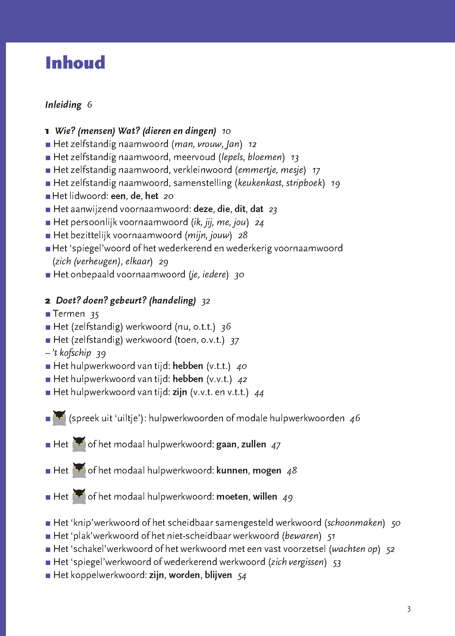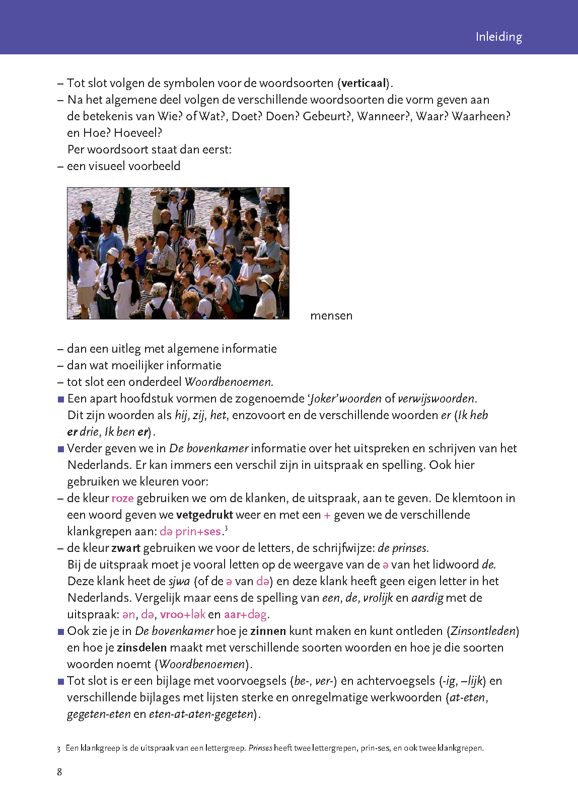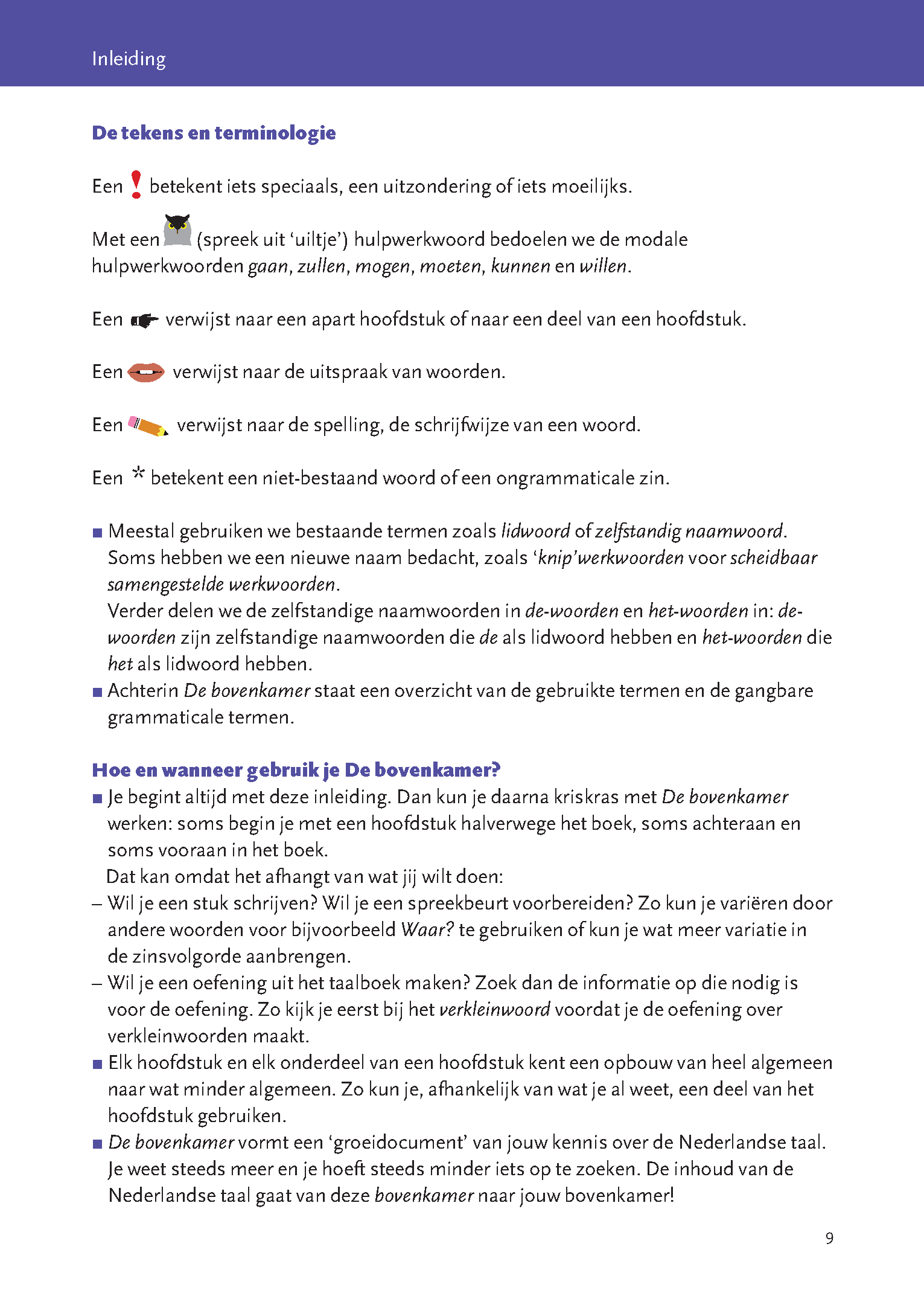 De bovenkamer is een opzoekboek voor leerlingen vanaf 8 jaar. Het legt de grammatica uit met behulp van foto’s, symbolen en kleuren. De visuele uitleg is een handige steun in de rug voor iedere leerling, maar zeker voor leerlingen die het Nederlands niet als moedertaal hebben. Voor hen zijn ‘vanzelfsprekendheden’ in de taal immers niet zo vanzelfsprekend.