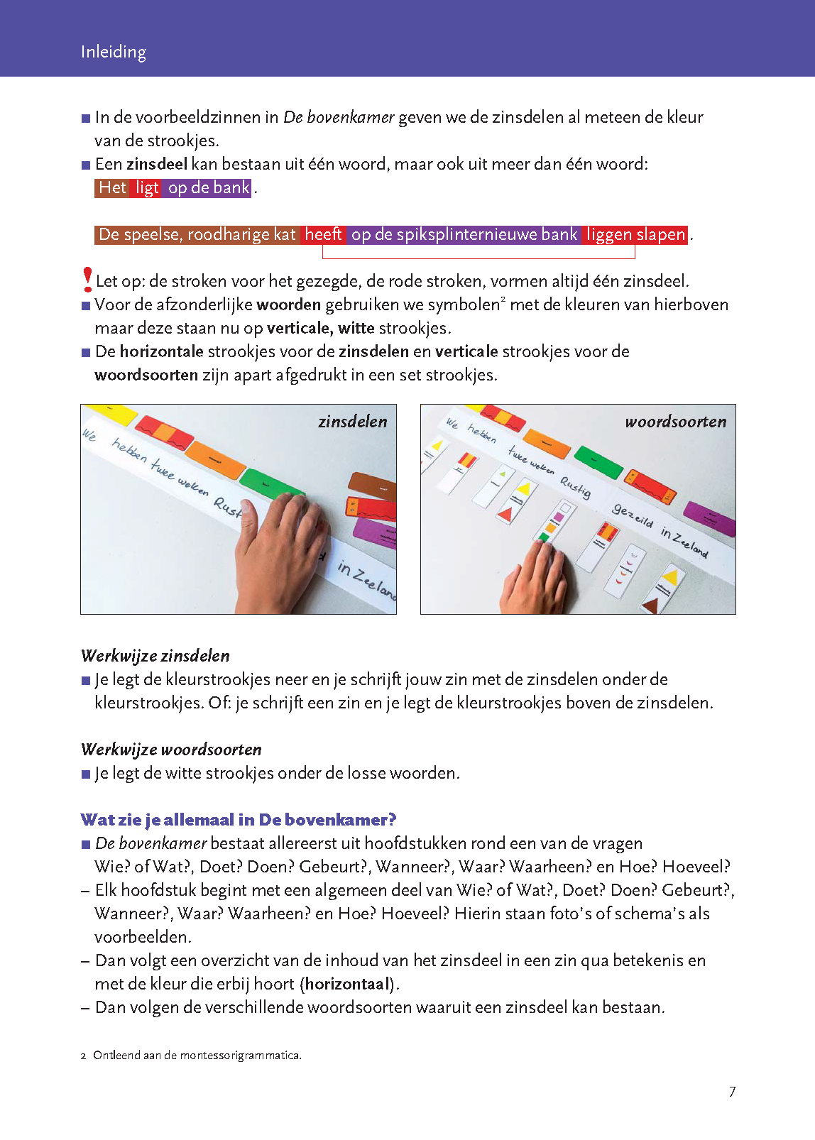 Met gekleurde strookjes leren leerlingen hoe ze zinnen kunnen opdelen in zinsdelen, en hoe ze woorden in een zin kunnen benoemen. Zo zien ze duidelijk hoe een zin in elkaar zit.