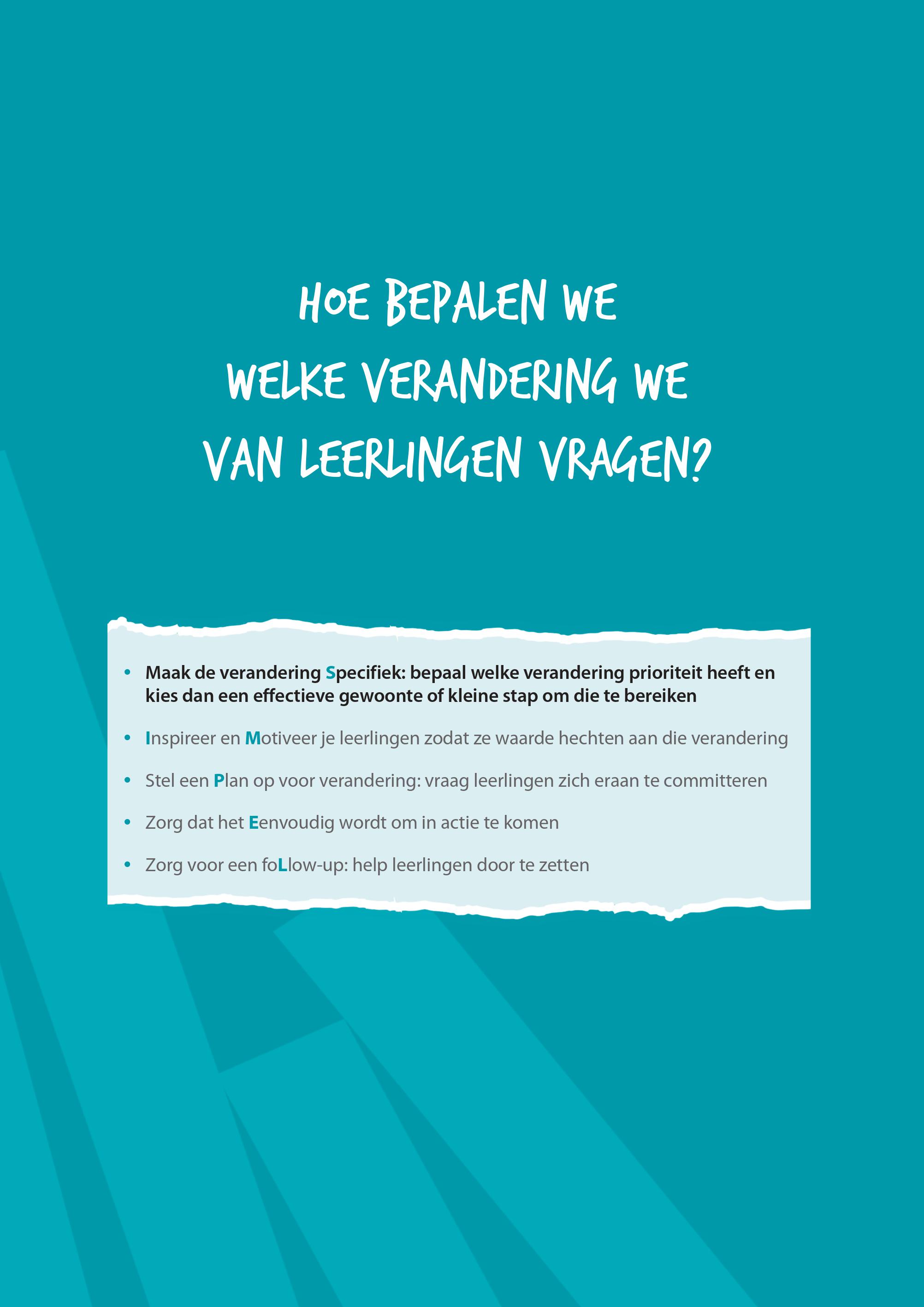In het onderwijs is een veelbesproken term ‘eigenaarschap’. We weten namelijk vanuit onderzoeksliteratuur, dat wanneer leerlingen (mede)eigenaar zijn van hun leerproces, dit hun leerontwikkeling ten goede komt. Op de term eigenaarschap volgt dan de vraag: "En hoe gaan we dat doen als een leerling dit niet aan lijkt te kunnen of niet intrinsiek gemotiveerd is?" Dit boek geeft daarop een wetenschappelijk onderbouwd antwoord. Slijp gewoontes in bij leerlingen, dan hoeven ze bij een opdracht niet eerst te bedenken hoe zij het aan moeten gaan pakken en of ze dit eigenlijk wel willen, maar dan gaan ze het volgens hun vaste patroon gewoon doen. Dat dit lukt, blijkt uit alle zeer herkenbare, concrete voorbeelden uit dit boek. Zelfs in zeer ingewikkelde situaties biedt deze aanpak weer nieuw perspectief.