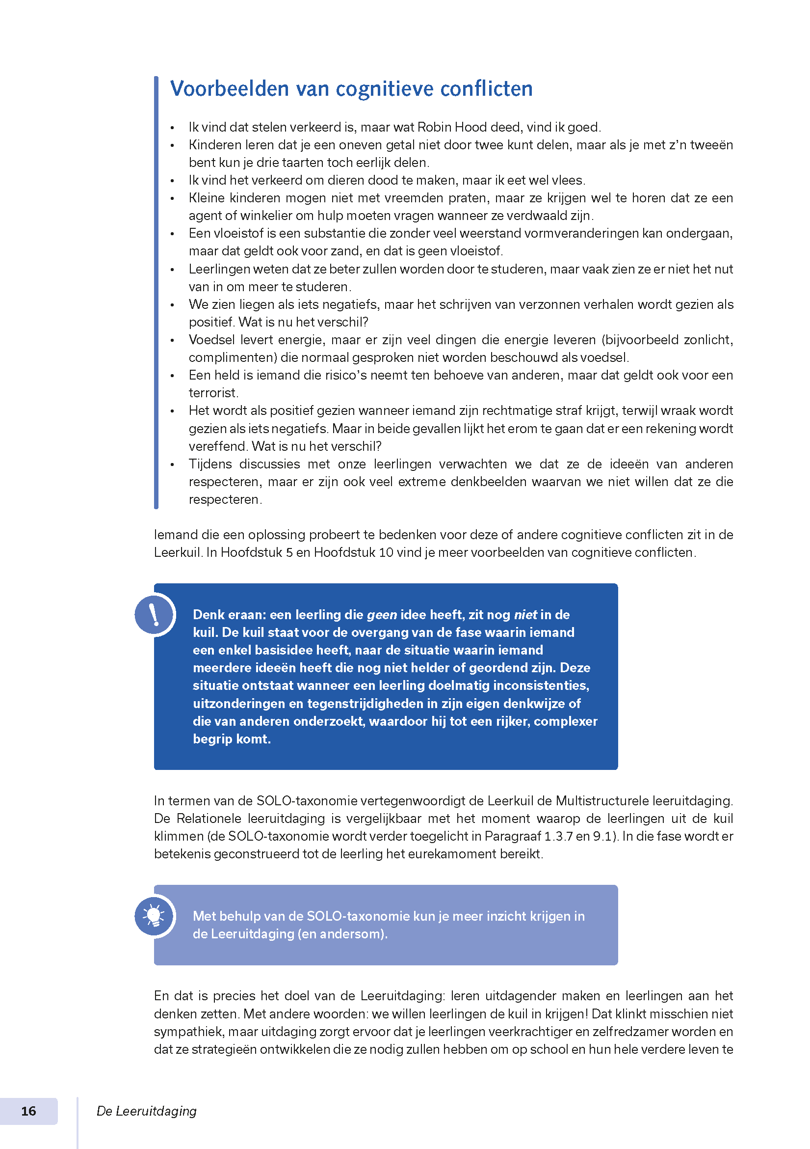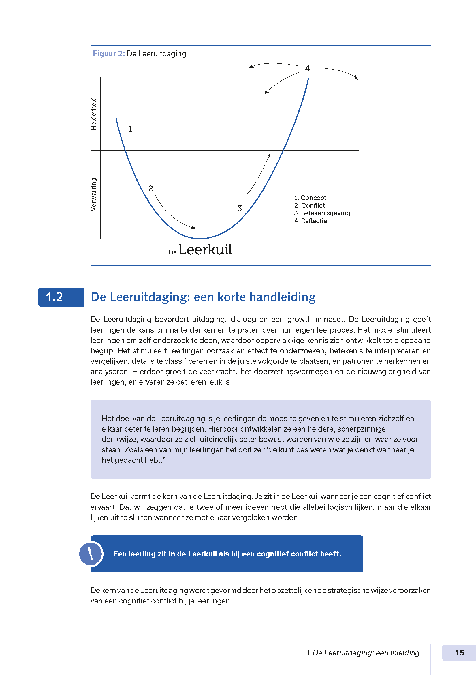 Daarom dien je als leraar situaties te creëren waarin leerlingen die onbalans ervaren. Je wilt twijfel zaaien, en de manier waarop leerlingen nadenken uitdagen met andere of betere ideeën. Dat doe je met de Leeruitdaging. Daarmee wordt leren een prikkelende en gezamenlijke inspanning van leerling en leraar. De Leerkuil vormt de kern van de Leeruitdaging. Je zit in de Leerkuil als je onopgeloste of tegenstrijdige ideeën hebt over datgene wat je probeert te begrijpen. Je maakt dan een cognitief conflict door. Door leerlingen uit te nodigen in de Leerkuil te stappen, daag je ze uit om te komen tot diep leren, met als doel het ontwikkelen van betekenisvolle, blijvende inzichten.