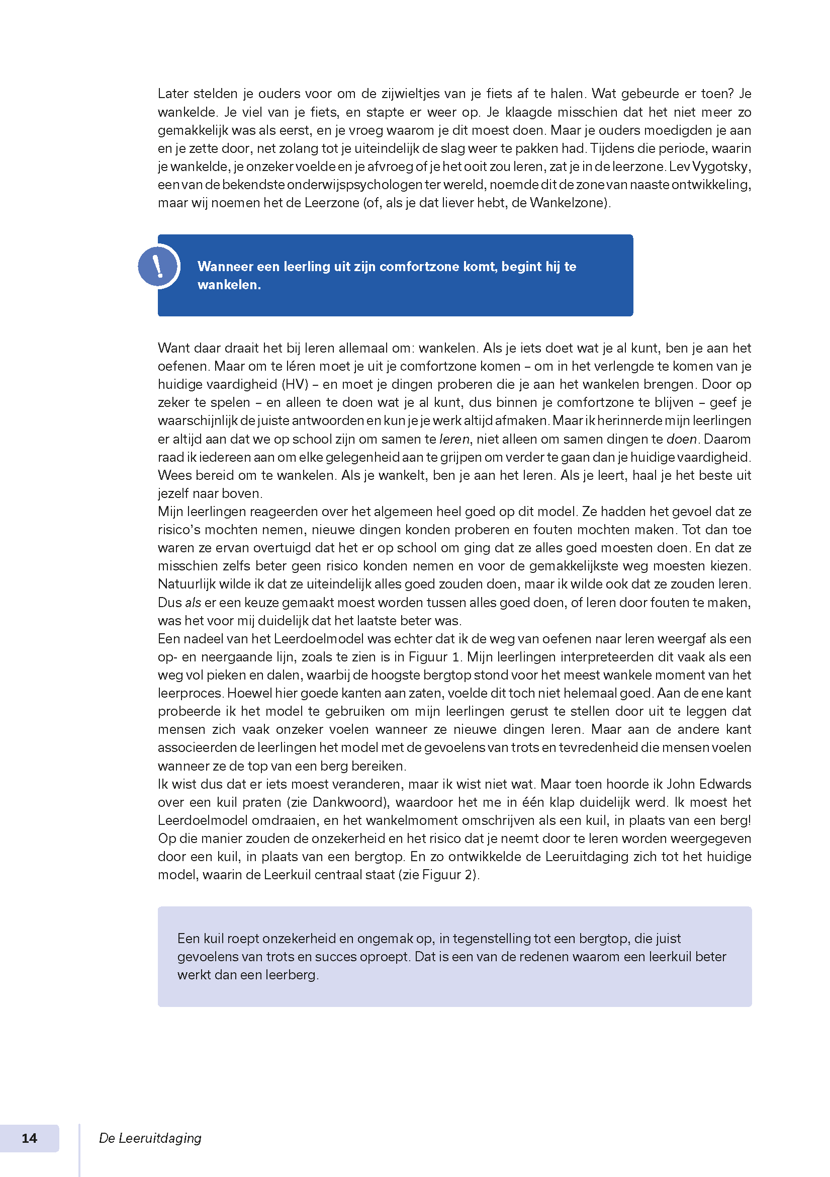 “In De Leeruitdaging laat James Nottingham op overtuigende wijze zien hoe belangrijk het is om leerlingen te laten wankelen. Zo komen ze zelf tot diepere inzichten van concepten en krijgen ze grip op hun eigen leerproces. Alle stappen in dit boek zijn door James en zijn collega’s uitvoerig toegepast in de praktijk en verbonden aan recente wetenschappelijke inzichten.Dit boek is een aanwinst voor iedere leraar.”