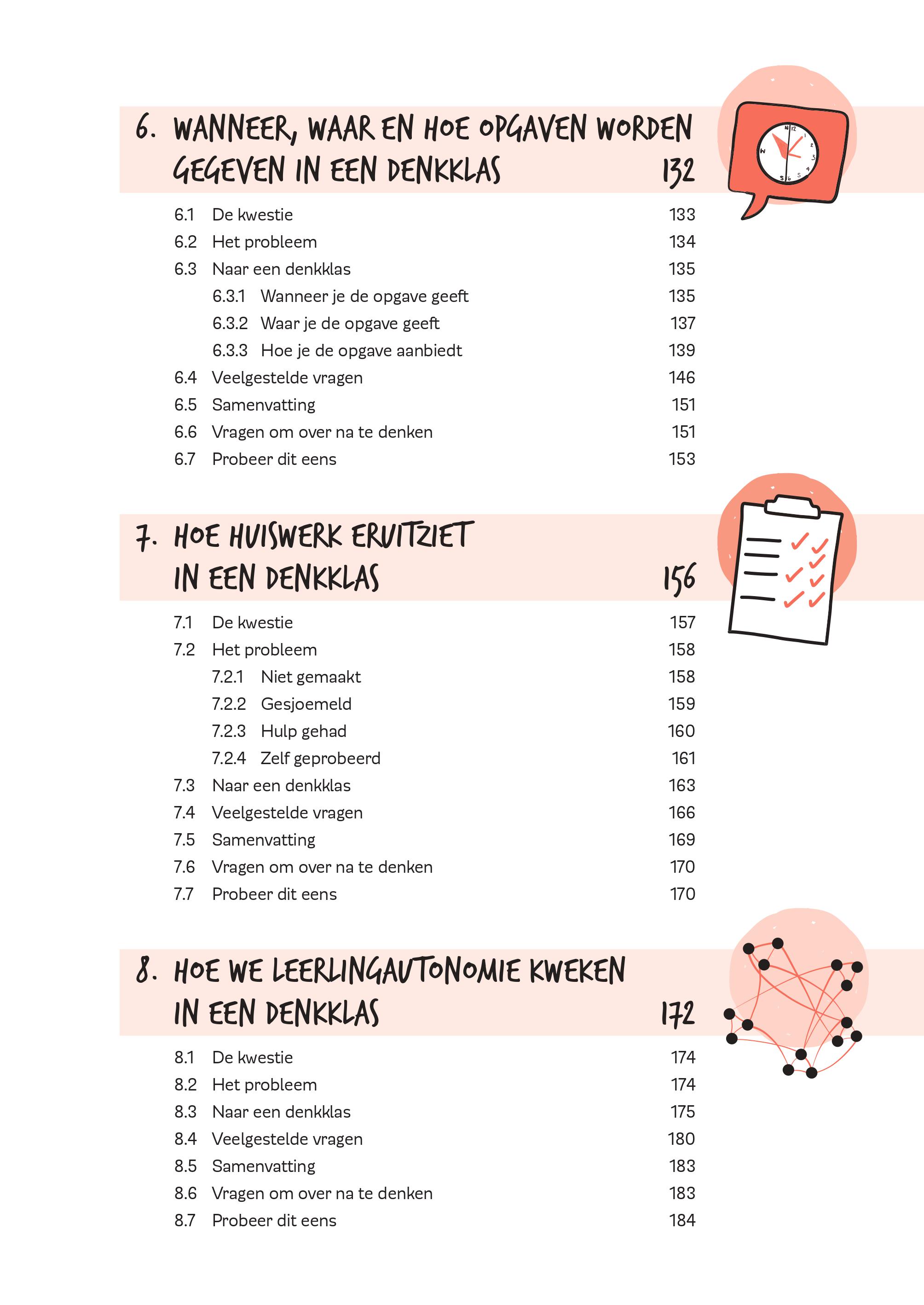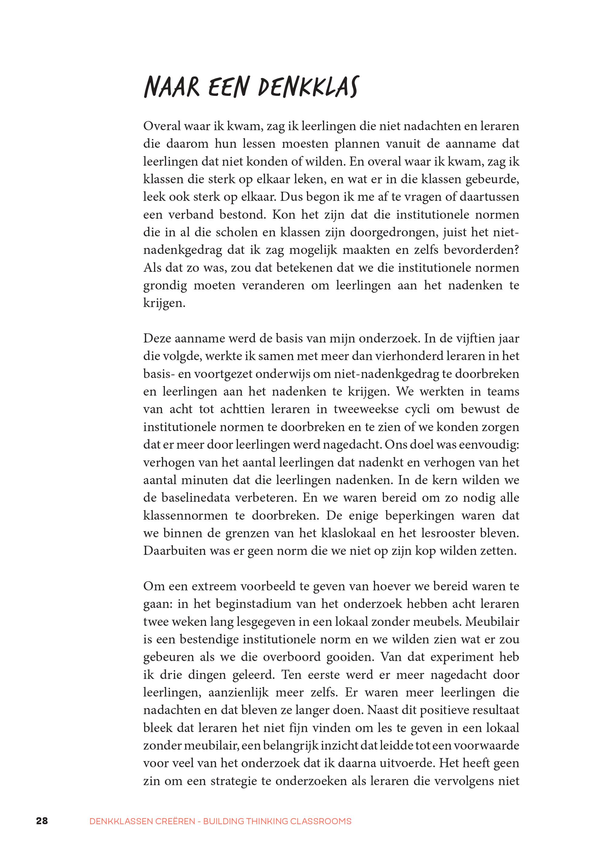 Wat een prachtig boek, mooi en degelijk uitgevoerd en erg praktisch. De auteur neemt je mee in zijn praktijkonderzoek naar de vraag: hoe krijg ik mijn leerlingen aan het denken? Verwacht hier geen theoretische uiteenzetting. Het boek is heel praktisch en in prettig leesbare taal geschreven. Alles gebaseerd op directe waarneming en in (omvangrijke en verschillende) praktijken uitgevoerd. Ik genoot van de stijl: licht en praktisch. Gniffelend zag ik voor mijn geestesoog leerlingen van mij aan het werk. Wat een feest der herkenning! De opbouw van het boek na de korte inleiding is direct heel praktisch: in 14 hoofdstukken worden alle onderzochte en hun waarde bewezen hebbende onderdelen van hoe leerlingen echt meer bij de les te betrekken en hun denken aan te zetten, praktisch doorgenomen. Alles gebaseerd op 15 jaar onderzoek. De toon en beschrijvingen zijn zó praktisch dat mijn handen jeukten om direct met de aanwijzingen aan de slag te gaan... Vrees niet: het kan in kleine, praktische stappen! Mijn advies voor elke leerkracht vanaf groep 5 basisonderwijs tot in de hoogste groepen van het voortgezet en waarschijnlijk ook hoger onderwijs: aanschaffen dit boek en laat je inspireren! Je zult versteld staan van de praktische waarde en genieten van de prettige opmaak van dit boek. Aanbevolen (met tips al vanaf het kleuteronderwijs!). Duur boek, maar het geld dubbel en dwars waard! Ik ben een senior leerkracht met jarenlange ervaring in verschillende vormen van basis- en speciaalonderwijs. Was dit boek graag jaren eerder tegengekomen. Een waardige en goed gedocumenteerde tegenhanger van het directe instructie model. Geeft de leerlingen het onderwijs weer terug en neemt ze serieus! Doen!