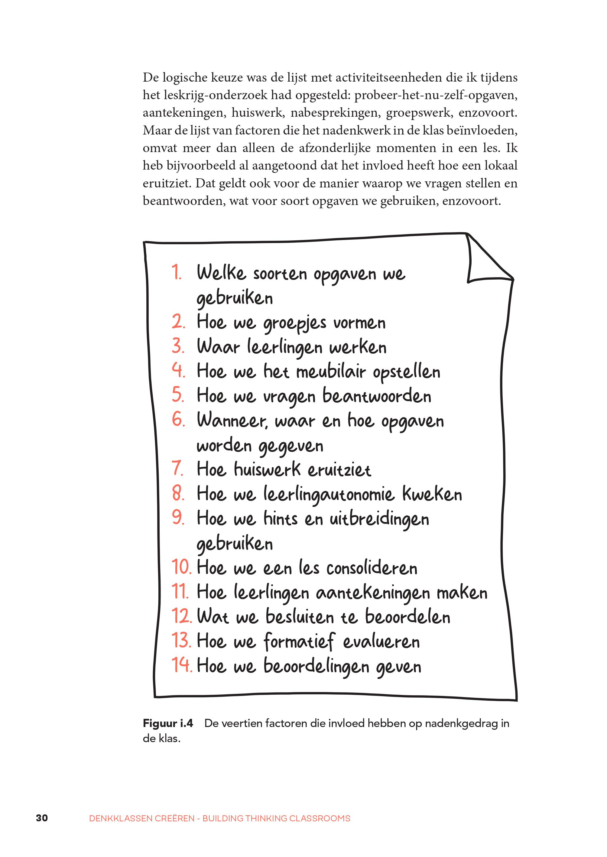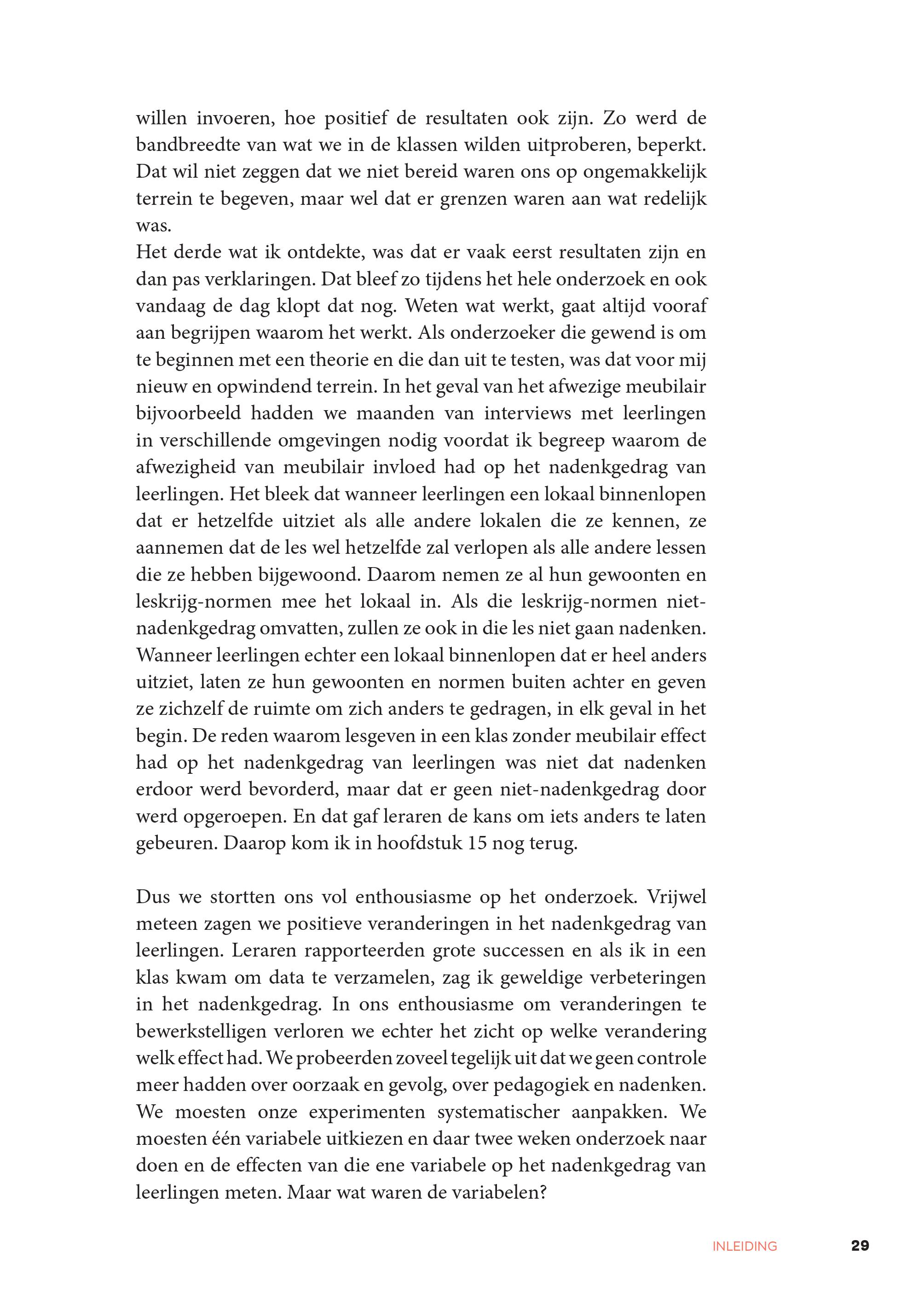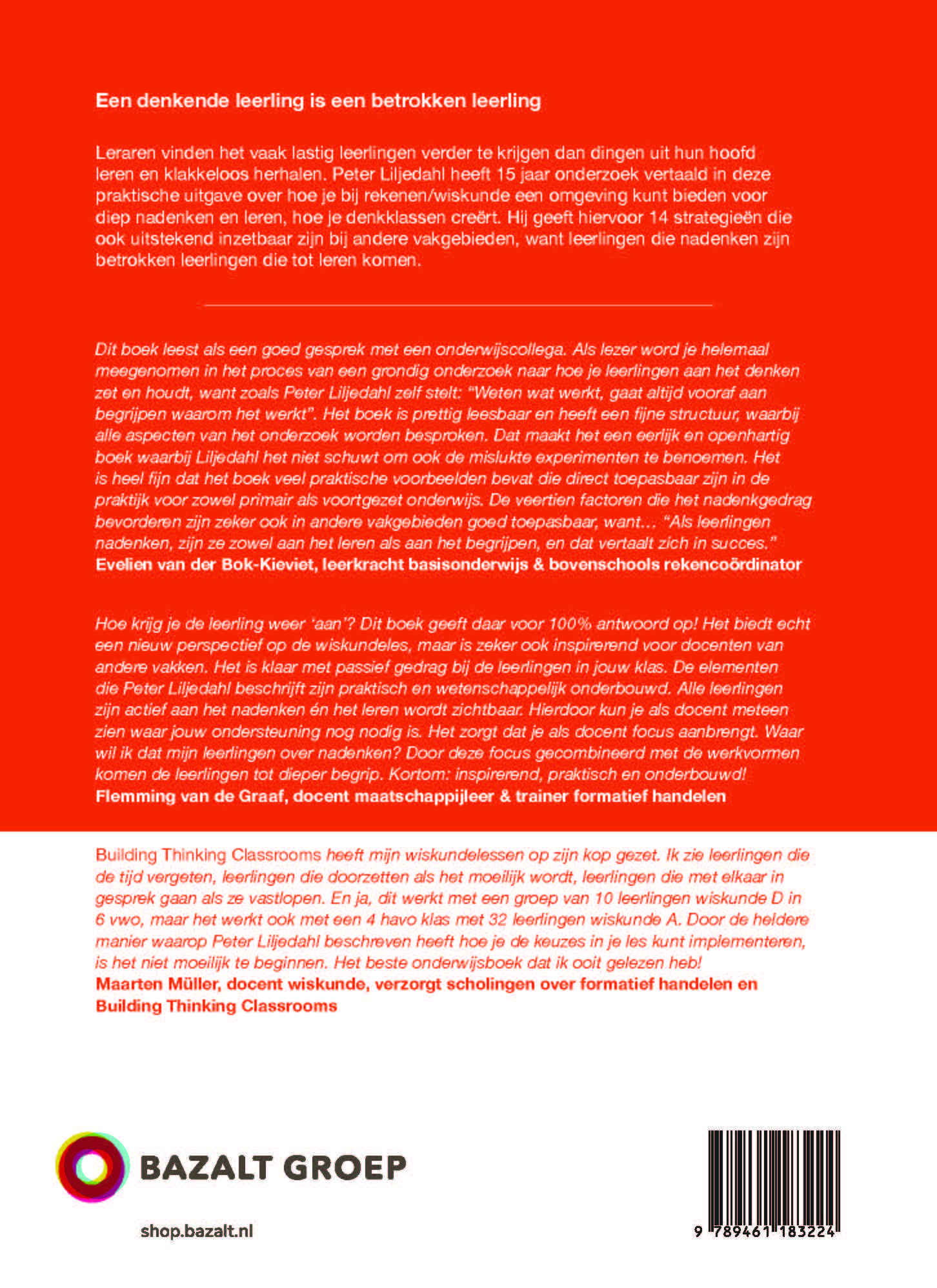 Dit boek leest als een goed gesprek met een onderwijscollega. Als lezer word je helemaal meegenomen in het proces van een grondig onderzoek naar hoe je leerlingen aan het denken zet en houdt, want zoals Peter Liljedahl zelf stelt: "Weten wat werkt, gaat altijd vooraf aan begrijpen waarom het werkt". Het boek is prettig leesbaar en heeft een fijne structuur, waarbij alle aspecten van het onderzoek worden besproken. Dat maakt het een eerlijk en openhartig boek waarbij Liljedahl het niet schuwt om ook de mislukte expirimenten te benoemen. Het is heel fijn dat het boek veel praktische voorbeelden bevat die direct toepasbaar zijn in de praktijk voor zowel primair als voortgezet onderwijs. De veertien factoren die het nadenkgedrag bevorderen zijn zeker ook in andere vakgebieden goed toepasbaar, want... "Als leerlingen nadenken, zijn ze zowel aan het leren als aan het begrijpen, en dat vertaalt zich in succes."