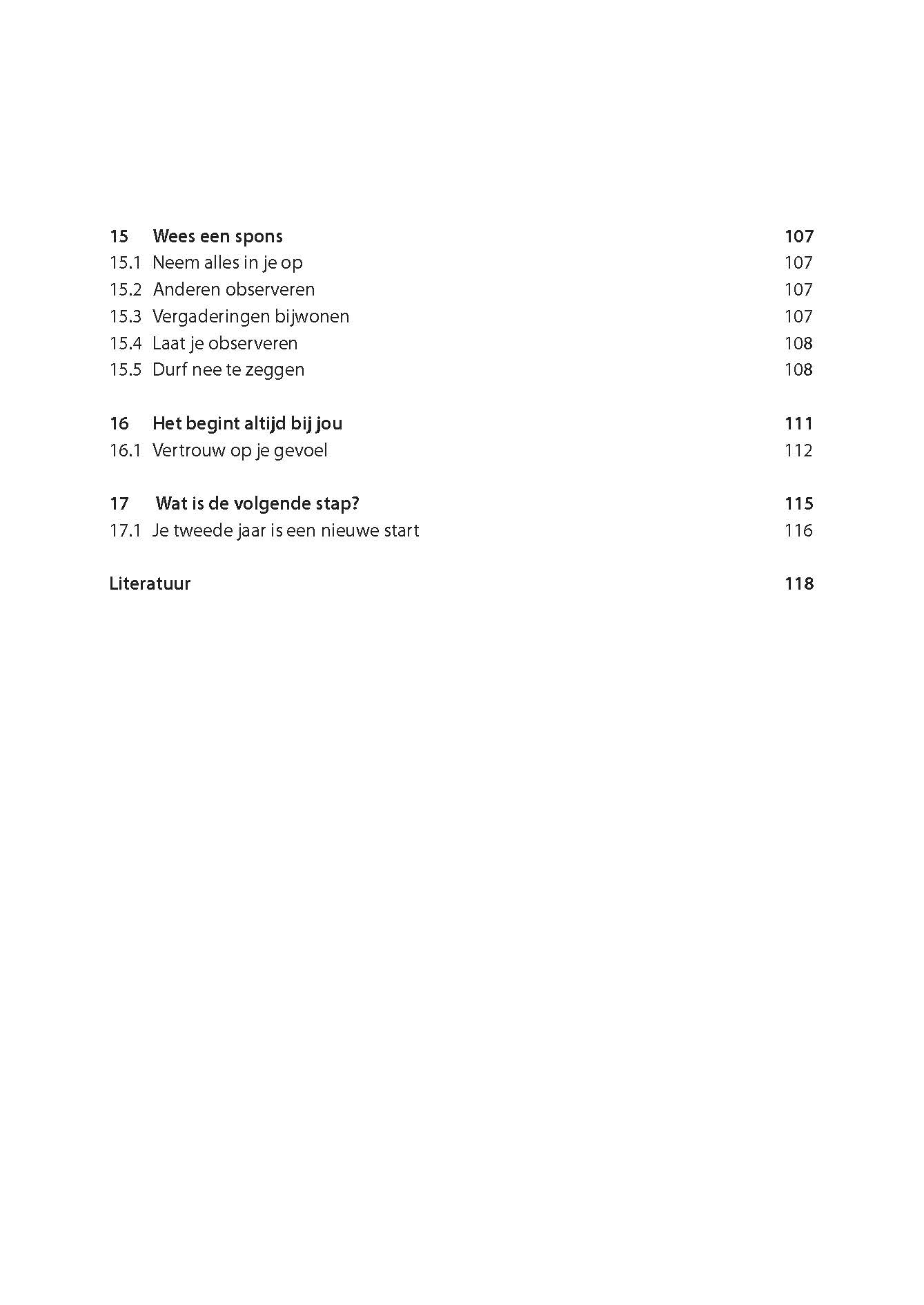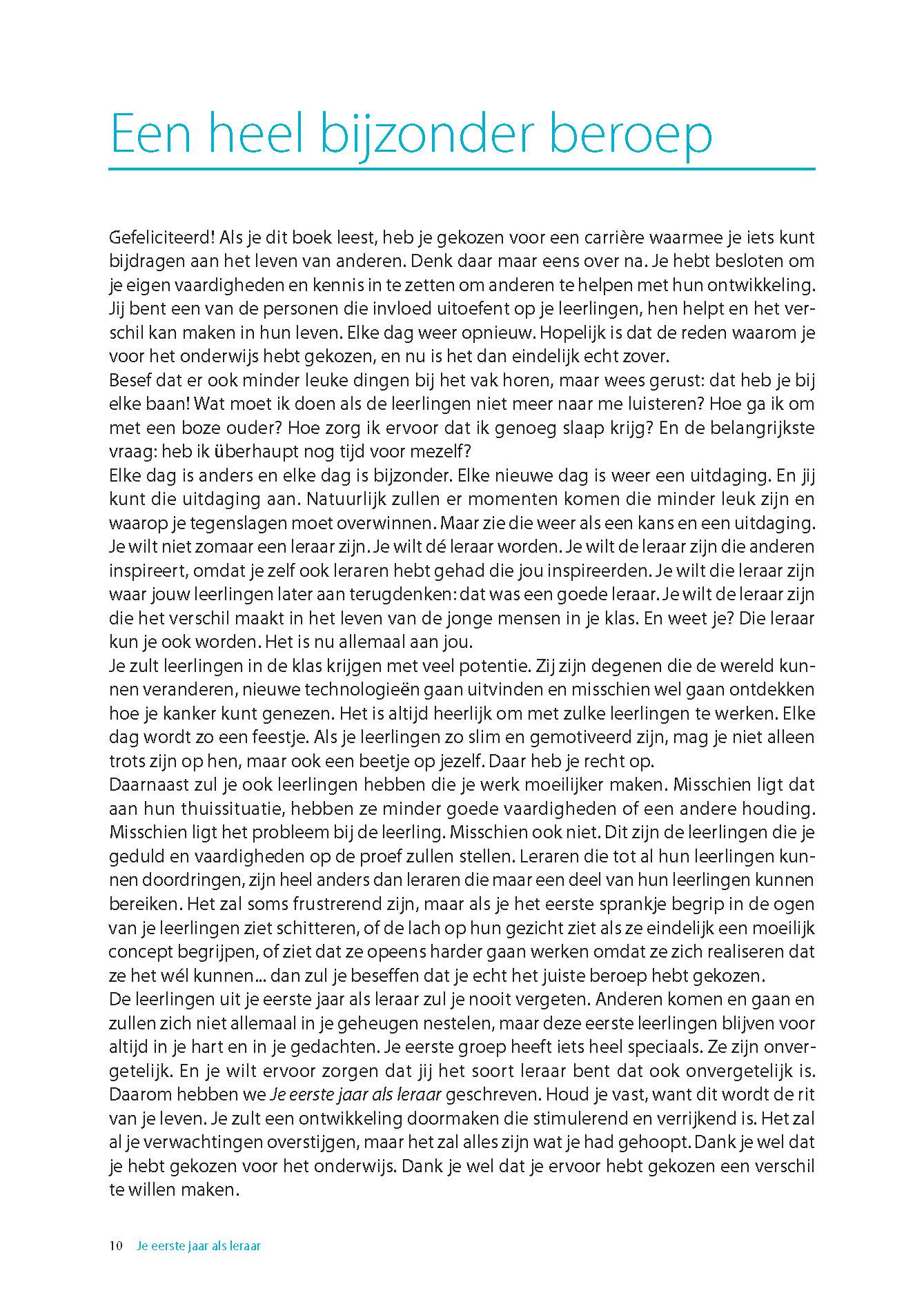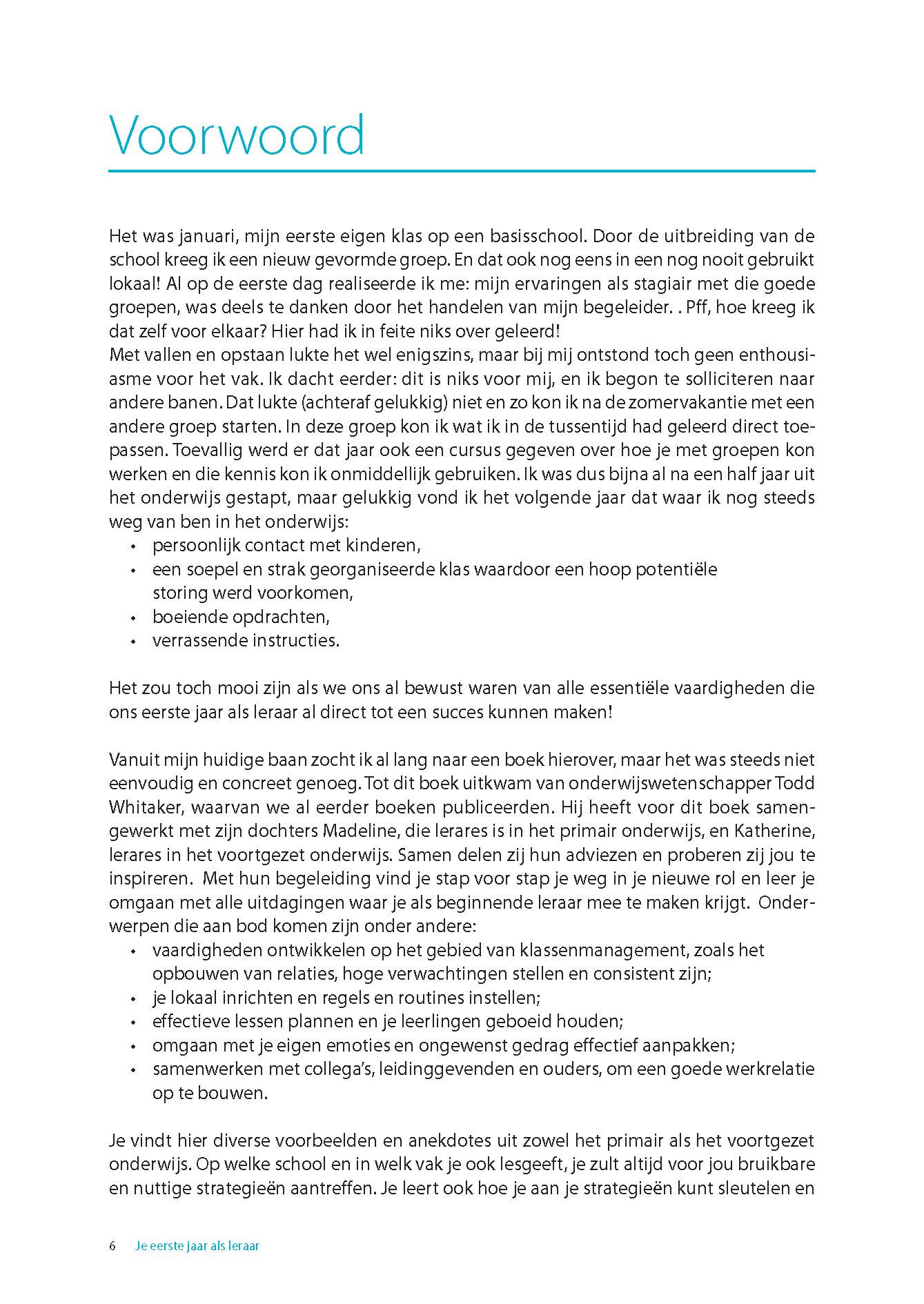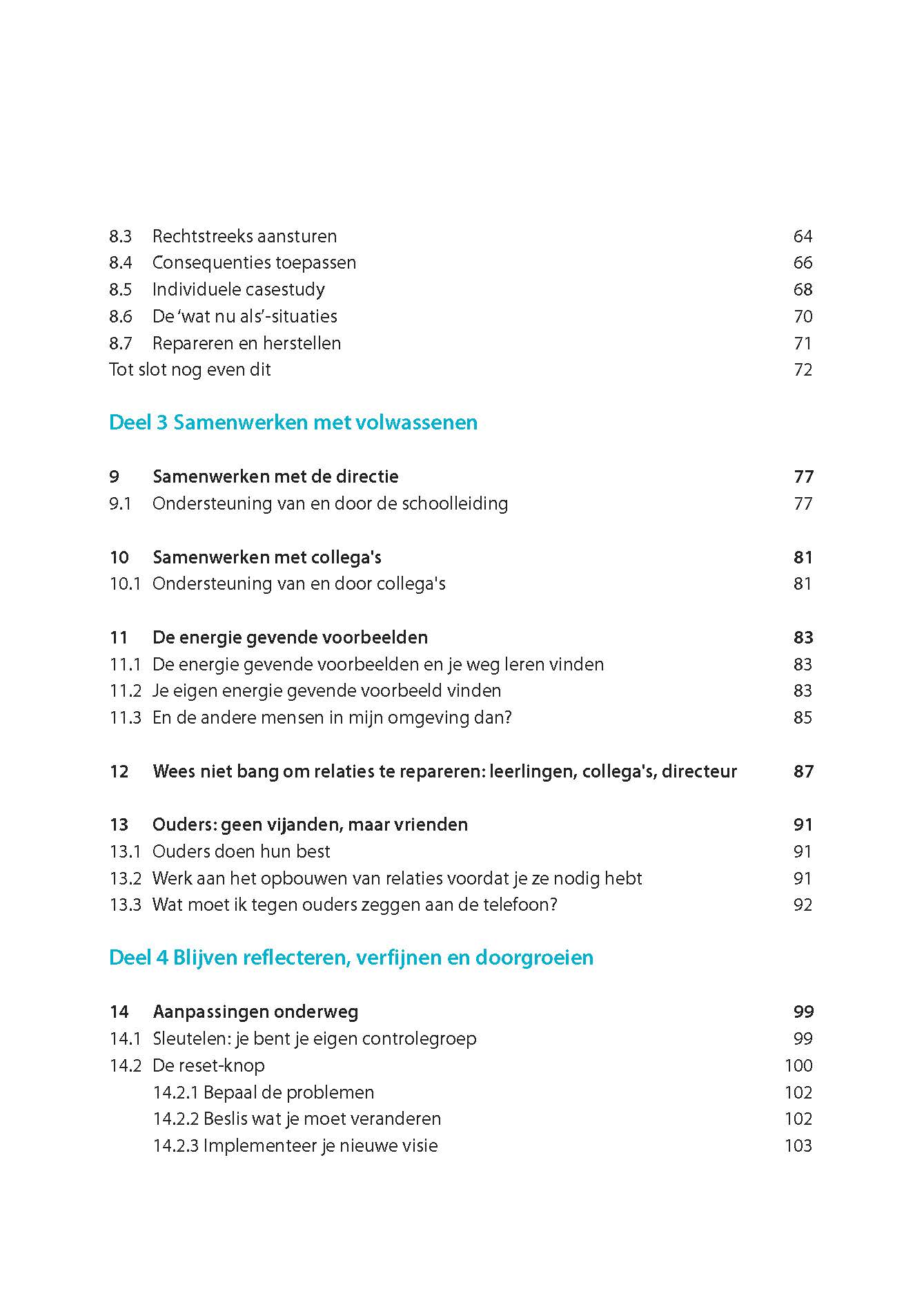 Het boek bevat diverse voorbeelden en anekdotes uit zowel het primair als het voortgezet onderwijs. Op welke school en in welk vak je ook lesgeeft, je zult altijd voor jou bruikbare en nuttige strategieën aantreffen. Je leert ook hoe je aan je strategieën kunt sleutelen en hoe je de reset-knop kunt gebruiken als er toch iets niet helemaal volgens plan loopt. In je eerste jaar gaat misschien niet alles altijd perfect, maar met behulp van de praktische adviezen in dit boek blijf je gemotiveerd werken aan je ontwikkeling tot succesvolle leraar!