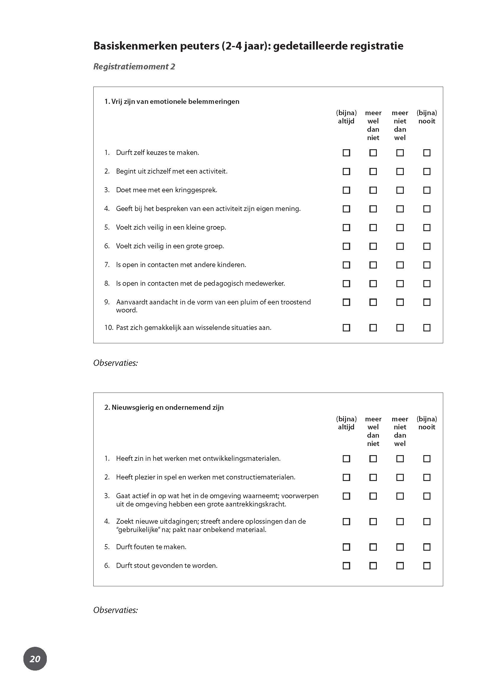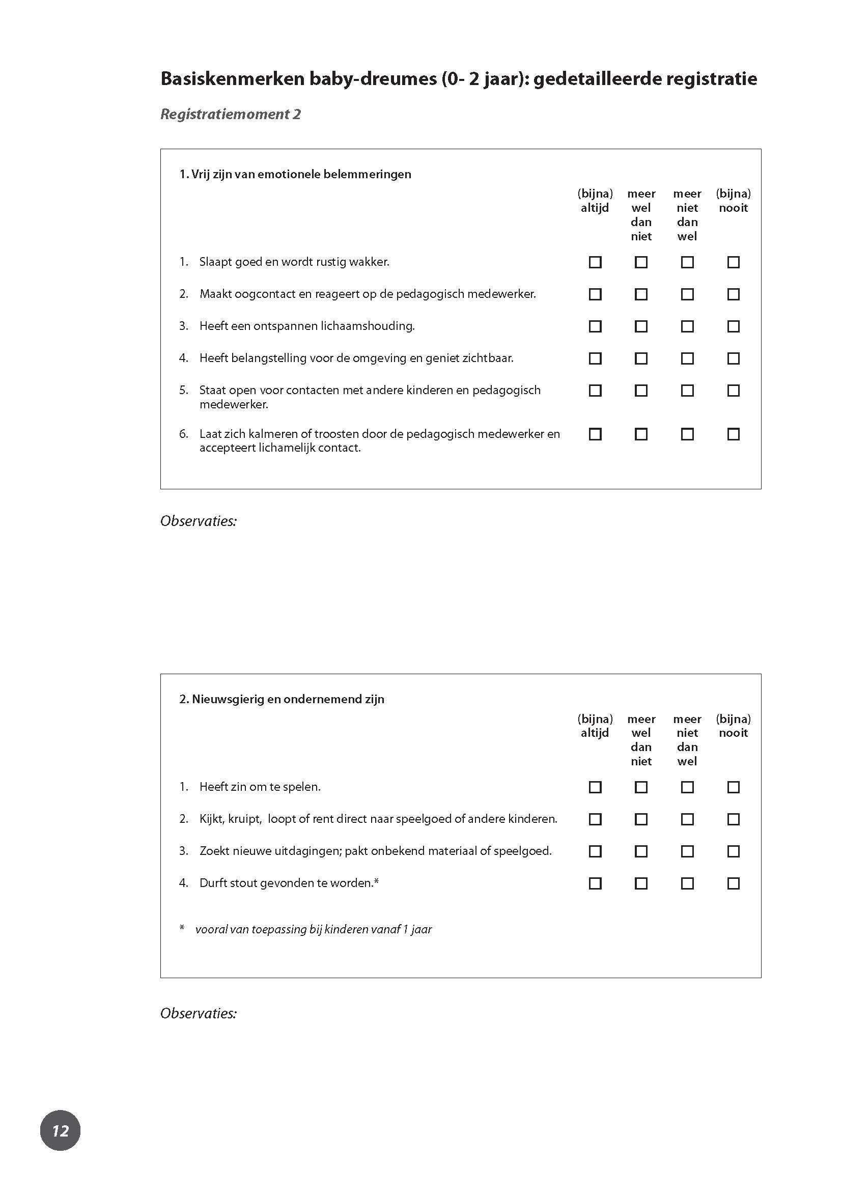Je kijkt naar basiskenmerken, betrokkenheid en aanwezigheid van factoren die een risico kunnen vormen voor de ontwikkeling. Daarnaast kijk je naar een groot aantal aspecten van de vroegkinderlijke ontwikkeling. Dit doe je met behulp van een aantal ontwikkelingslijnen.
