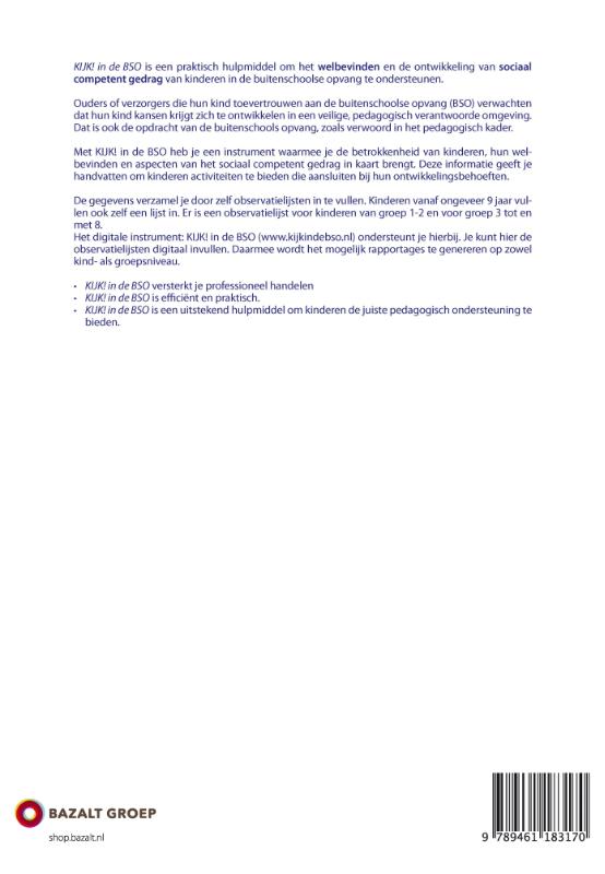 KIJK! in de BSO is een instrument waarmee je op de BSO de betrokkenheid van kinderen, hun welbevinden en aspecten van sociaal competent gedrag observeert en registreert. Het helpt je om op een systematische wijze zicht te krijgen op de sociaal-emotionele ontwikkeling. De gegevens die je verzamelt zijn afkomstig uit twee bronnen: de pedagogisch medewerker en (vanaf dat het ongeveer 9 jaar oud is) het kind. Door deze twee bronnen bij elkaar te brengen, ontstaat een nauwkeurig en betrouwbaar beeld. Op basis van deze informatie is het mogelijk om in te spelen op de ontwikkelingsbehoeften en ontwikkelingsmogelijkheden van het kind. Aanpassen van de (speel)omgeving en een bewuste keuze van activiteiten vraagt veel van pedagogisch medewerkers. KIJK! in de BSO geeft een duidelijke sturing aan dit proces. Met inschakeling van professionele ondersteuning op de werkvloer kun je het werken met KIJK! in de BSO tot een vast en herkenbaar onderdeel van je werkwijze maken.