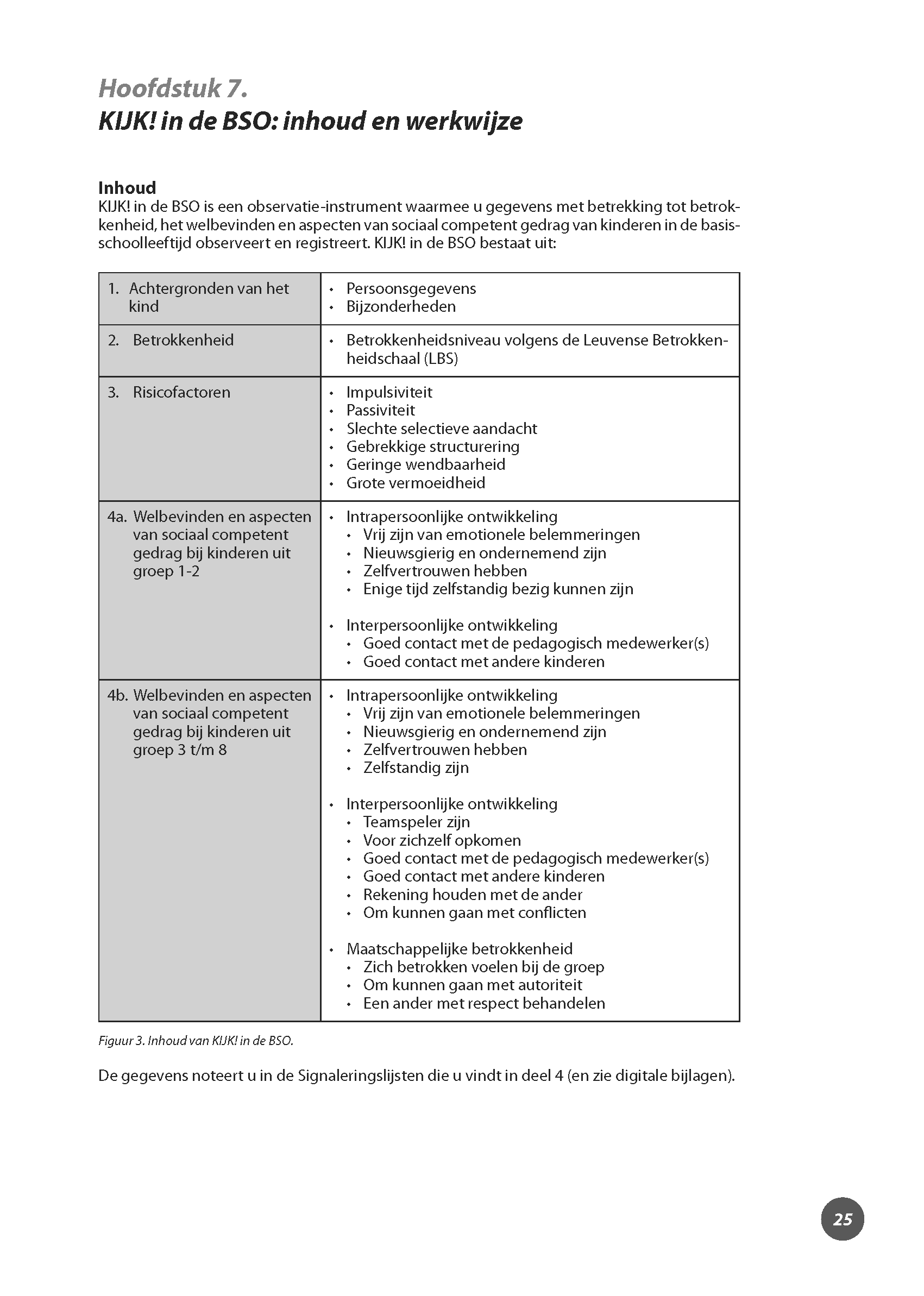 KIJK! in de BSO bestaat uit een handleiding en een kopieerboekje. In de handleiding zijn ontwikkelschetsen opgenomen voor kinderen in groep 1-2 en voor kinderen uit groep 3 t/m 8. Deze schetsen geven je een beeld van hoe de sociaal-emotionele ontwikkeling bij kinderen uit deze leeftijdsgroepen in grote lijnen verloopt. Ze geven aan wat je van de kinderen in deze periode normaal gesproken mag verwachten. Bij het registreren van observatiegegevens maak je gebruik van Signaleringslijsten. Voor kinderen van vanaf ongeveer 9 jaar is een Kindlijst ontwikkeld. Beide lijsten zijn opgenomen in het kopieerboekje.
