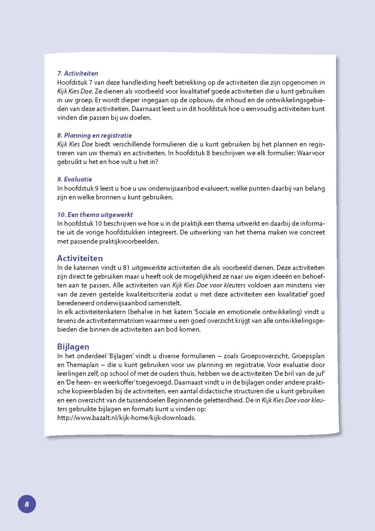 Bij alle ontwikkelingsgebieden zijn activiteiten beschreven die als voorbeeld en als inspiratie kunnen dienen voor je eigen aanbod. Alle activiteiten voldoen aan de kwaliteitscriteria voor goede activiteiten zoals die zijn beschreven in KIJK! Kies Doe. Ook zijn in de activiteiten veel aanpakstrategieën van Marzano verwerkt. Denk hierbij bijvoorbeeld aan coöperatieve werkvormen en aan non-verbale representaties.