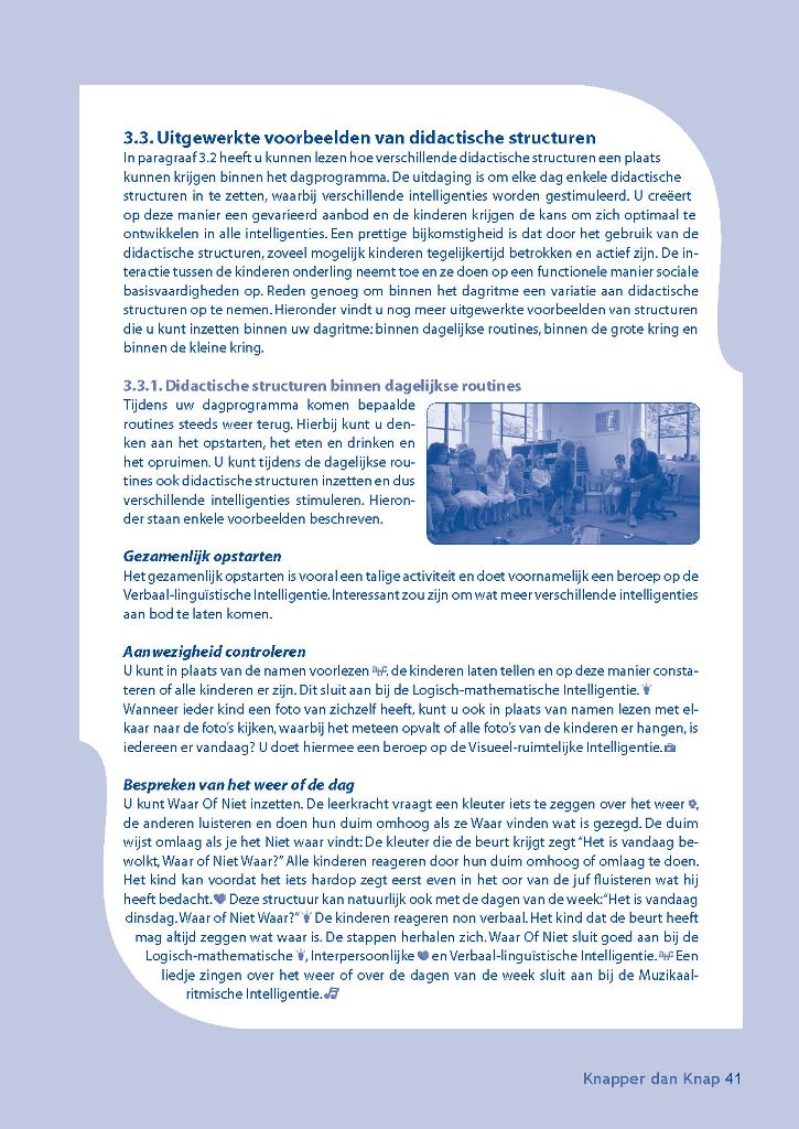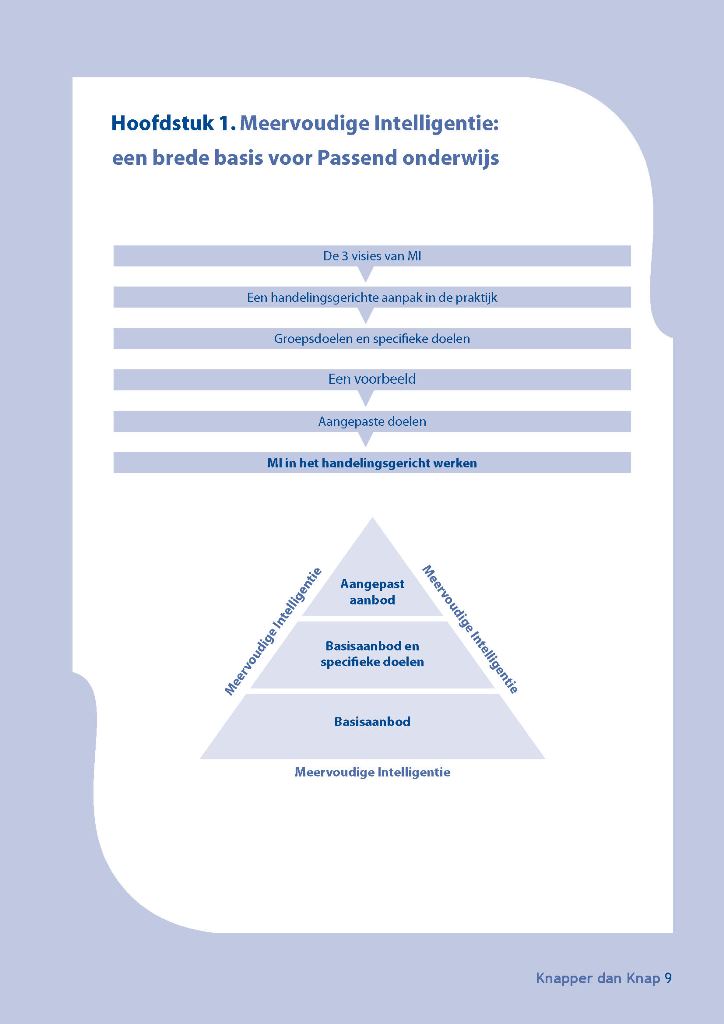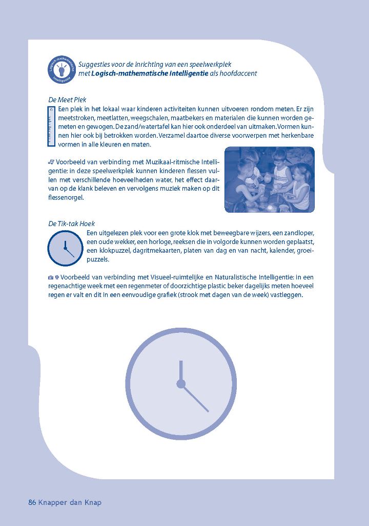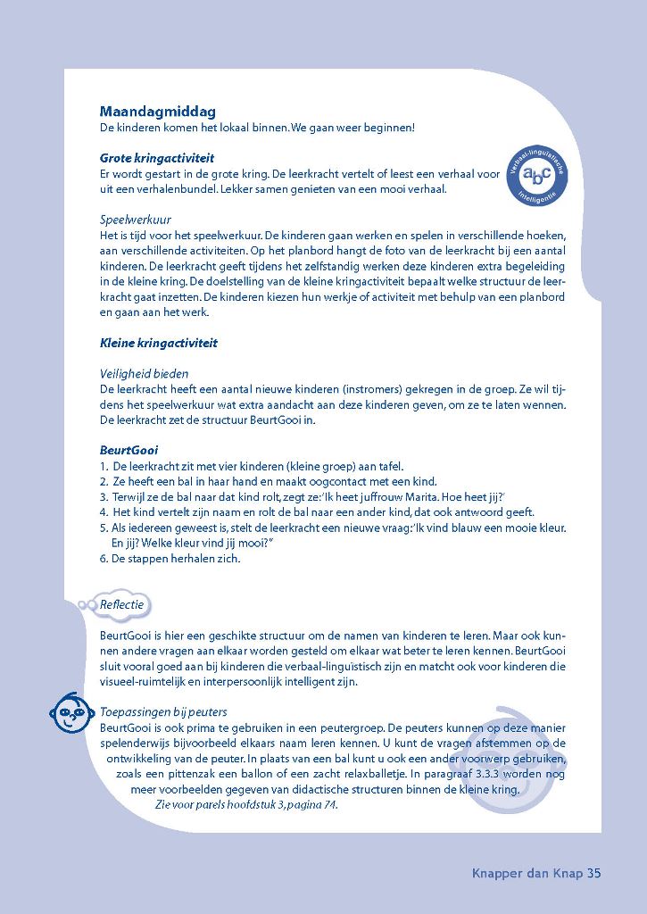 Het boek Knapper dan Knap laat je met een andere bril kijken naar de ontwikkeling van peuters en kleuters. Dit gebeurt vanuit de uitgangspunten van Meervoudige Intelligentie. Door meerdere intelligentiegebieden aan te spreken binnen een activiteit, verhoog je de kwaliteit ervan. Je maakt o.a. gebruik van de volgende werkvormen: kringactiviteiten, namen lezen, vertelkring, het speelwerken en meer van die terugkerende activiteiten.