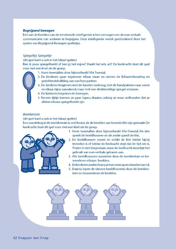 In Knapper dan Knap vind je ook: bewegingsspelletjes voor peuters en kleuters suggesties voor de speelleeromgeving en de speelwerkplekken ideeën voor de groepsorganisatie en voorbeelden voor het voorbereiden van een thema. Knapper dan Knap biedt volop mogelijkheden om meteen te beginnen in de praktijk. Het maakt je aanbod veelzijdiger en rijker.