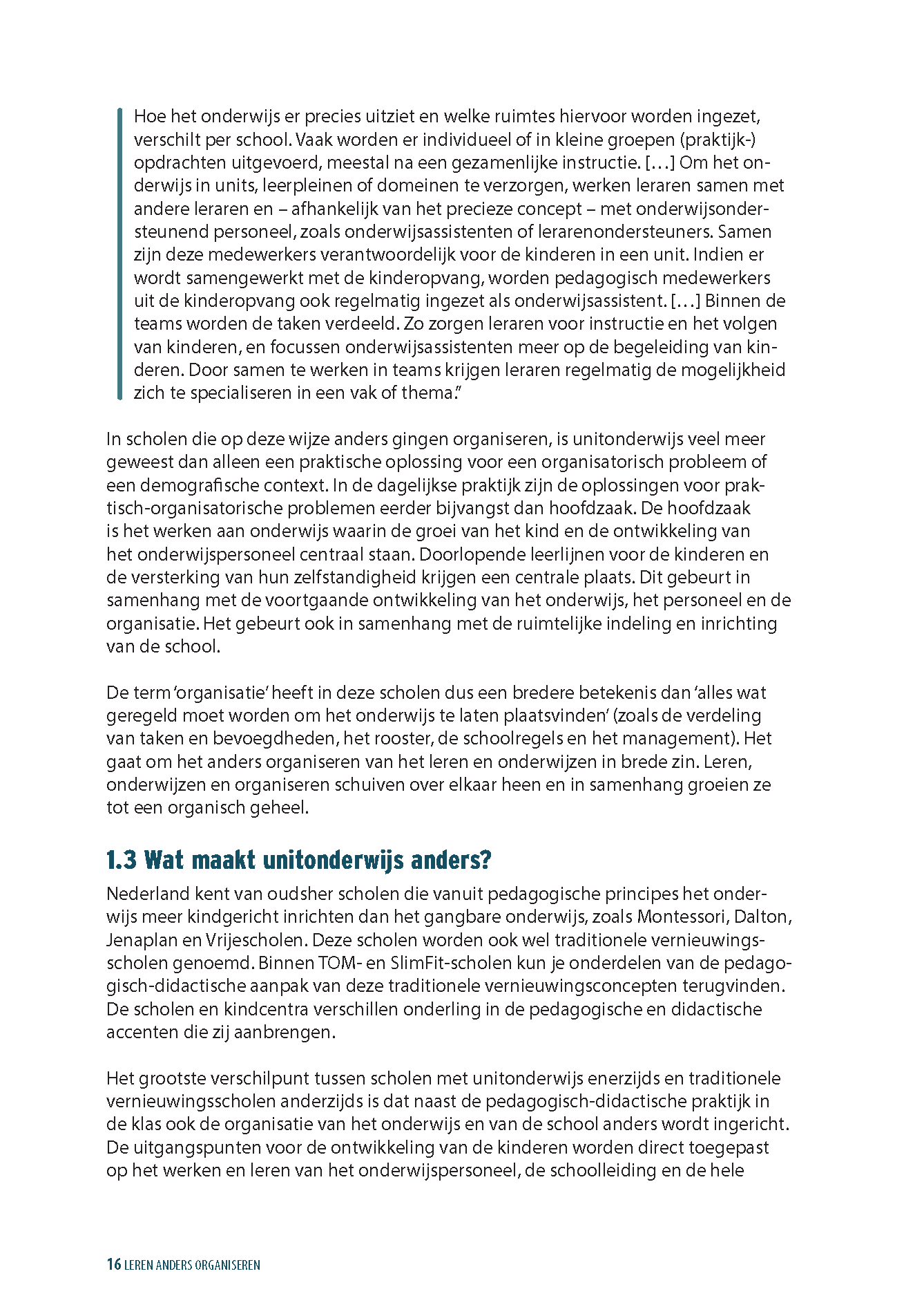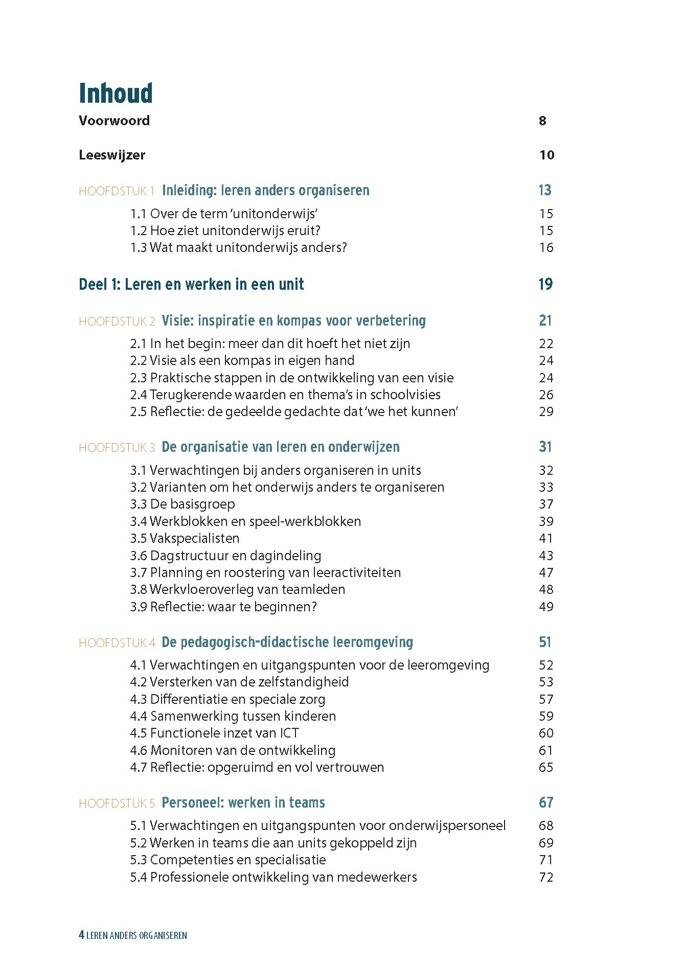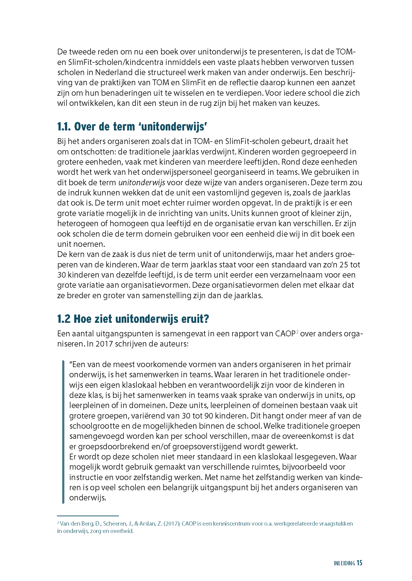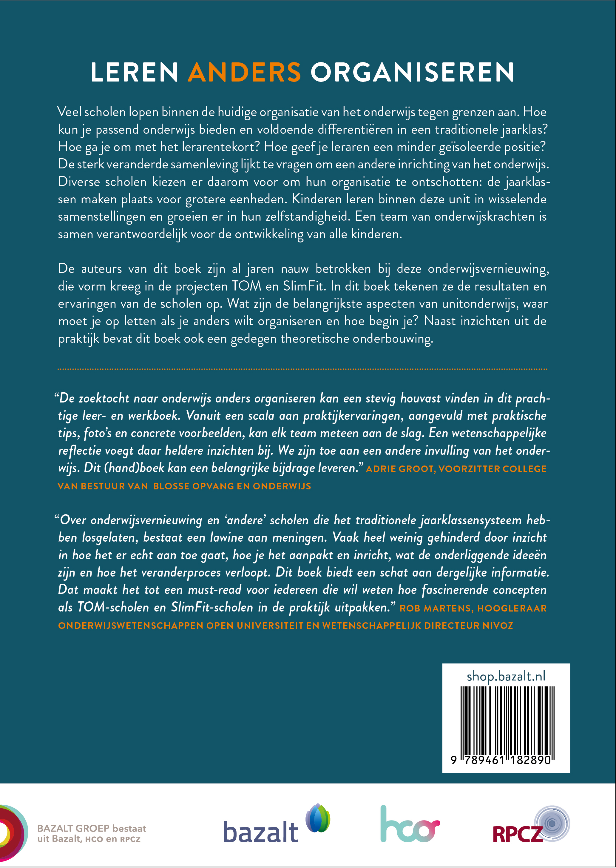 De auteurs van dit boek zijn al jaren nauw betrokken bij deze onderwijsvernieuwing, die vorm kreeg in de projecten TOM en SlimFit. In dit boek tekenen ze de resultaten en ervaringen van de scholen op. Wat zijn de belangrijkste aspecten van unitonderwijs, waar moet je op letten als je anders wilt organiseren en hoe begin je? Naast inzichten uit de praktijk bevat dit boek ook praktische tips en een gedegen theoretische onderbouwing.