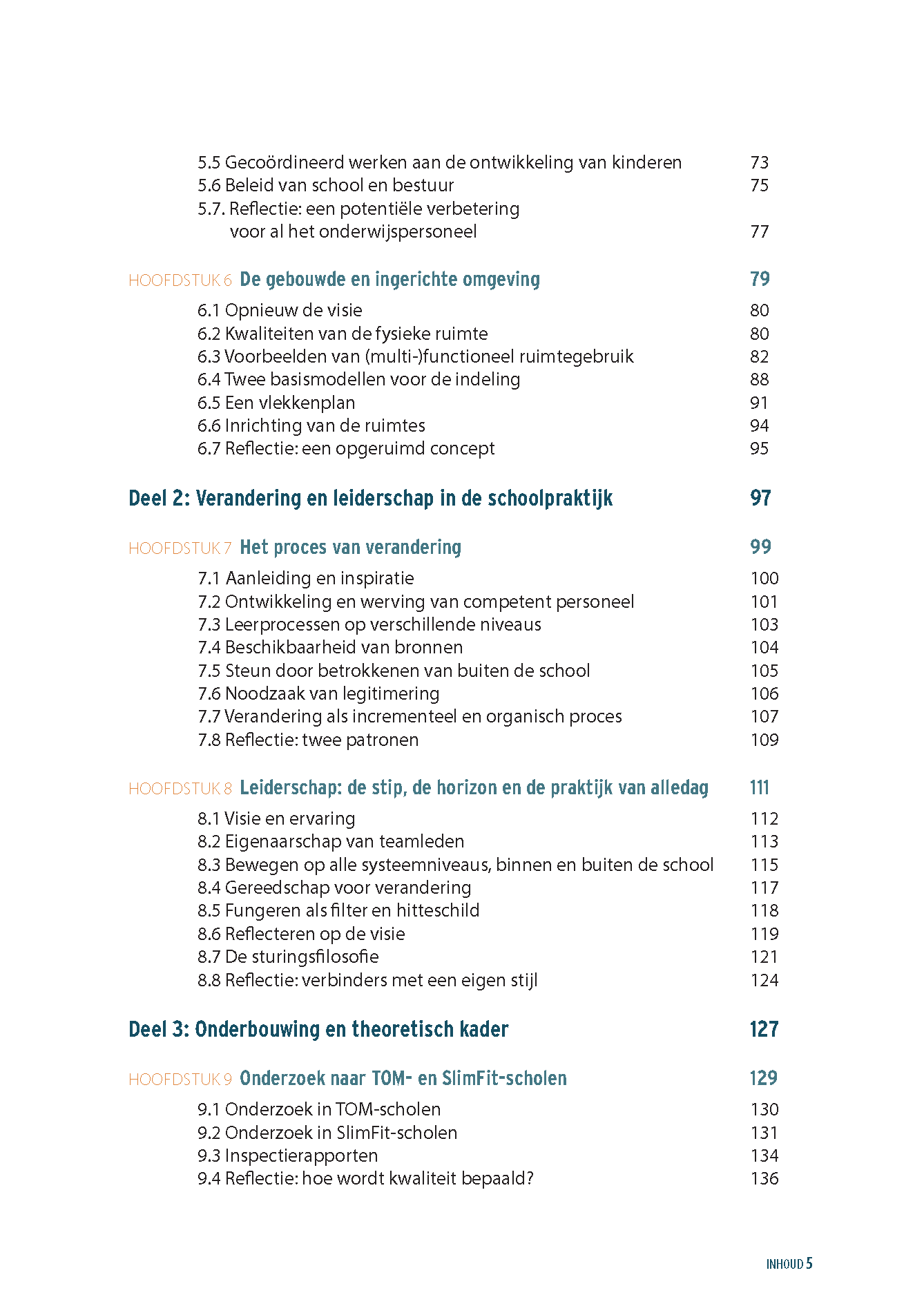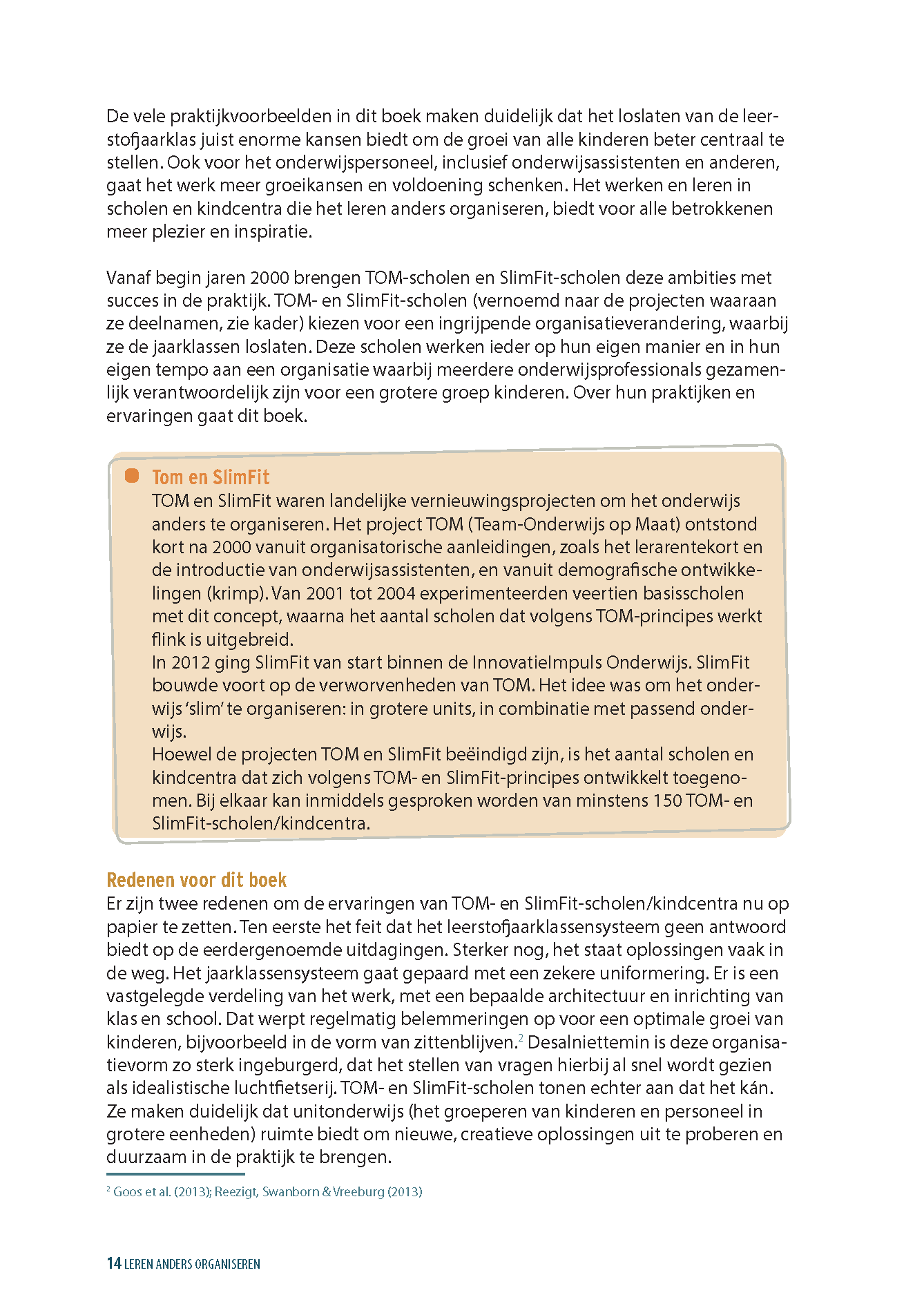 "Over onderwijsvernieuwing en ‘andere’ scholen die het traditionele jaarklassensysteem hebben losgelaten, bestaat een lawine aan meningen. Vaak heel weinig gehinderd door inzicht in hoe het er echt aan toe gaat, hoe je het aanpakt en inricht, wat de onderliggende ideeën zijn en hoe het veranderproces verloopt. Dit boek biedt een schat aan dergelijke informatie. Dat maakt het tot een must-read voor iedereen die wil weten hoe fascinerende concepten als TOM-scholen en SlimFit-scholen in de praktijk uitpakken.”