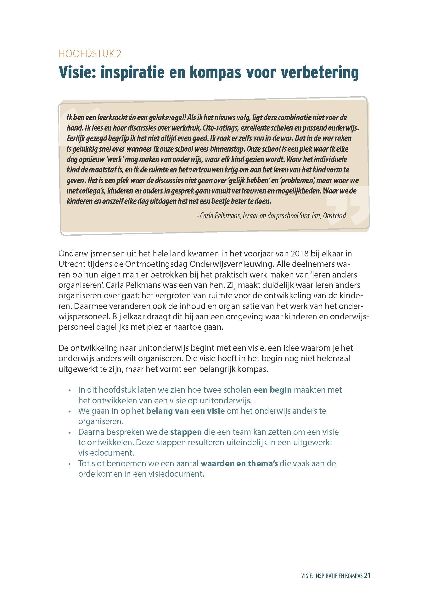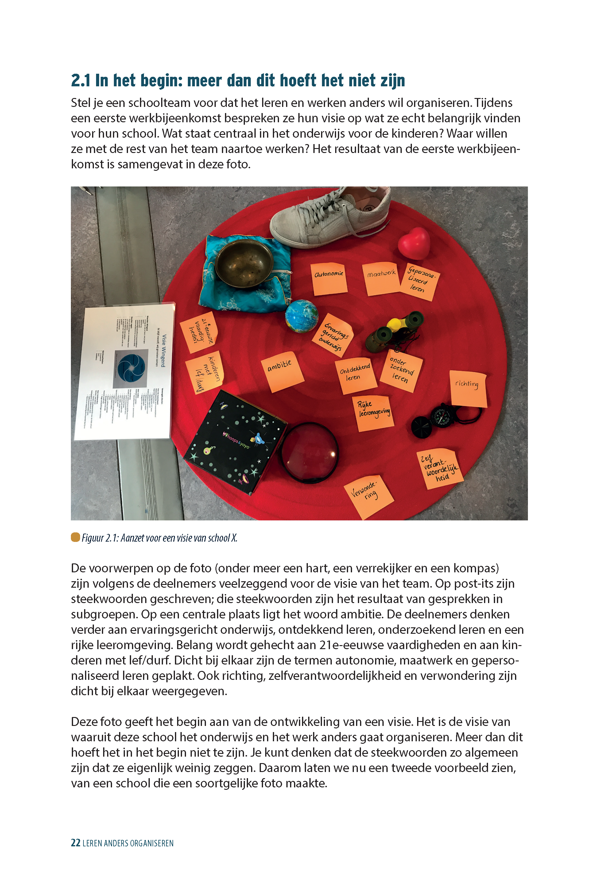 “De zoektocht naar onderwijs anders organiseren kan een stevig houvast vinden in dit prachtige leer- en werkboek. Vanuit een scala aan praktijkervaringen, aangevuld met praktische tips, foto’s en concrete voorbeelden, kan elk team meteen aan de slag. Een wetenschappelijke reflectie voegt daar heldere inzichten bij. We zijn toe aan andere invulling van het onderwijs. Dit (hand)boek kan een belangrijke bijdrage leveren.”