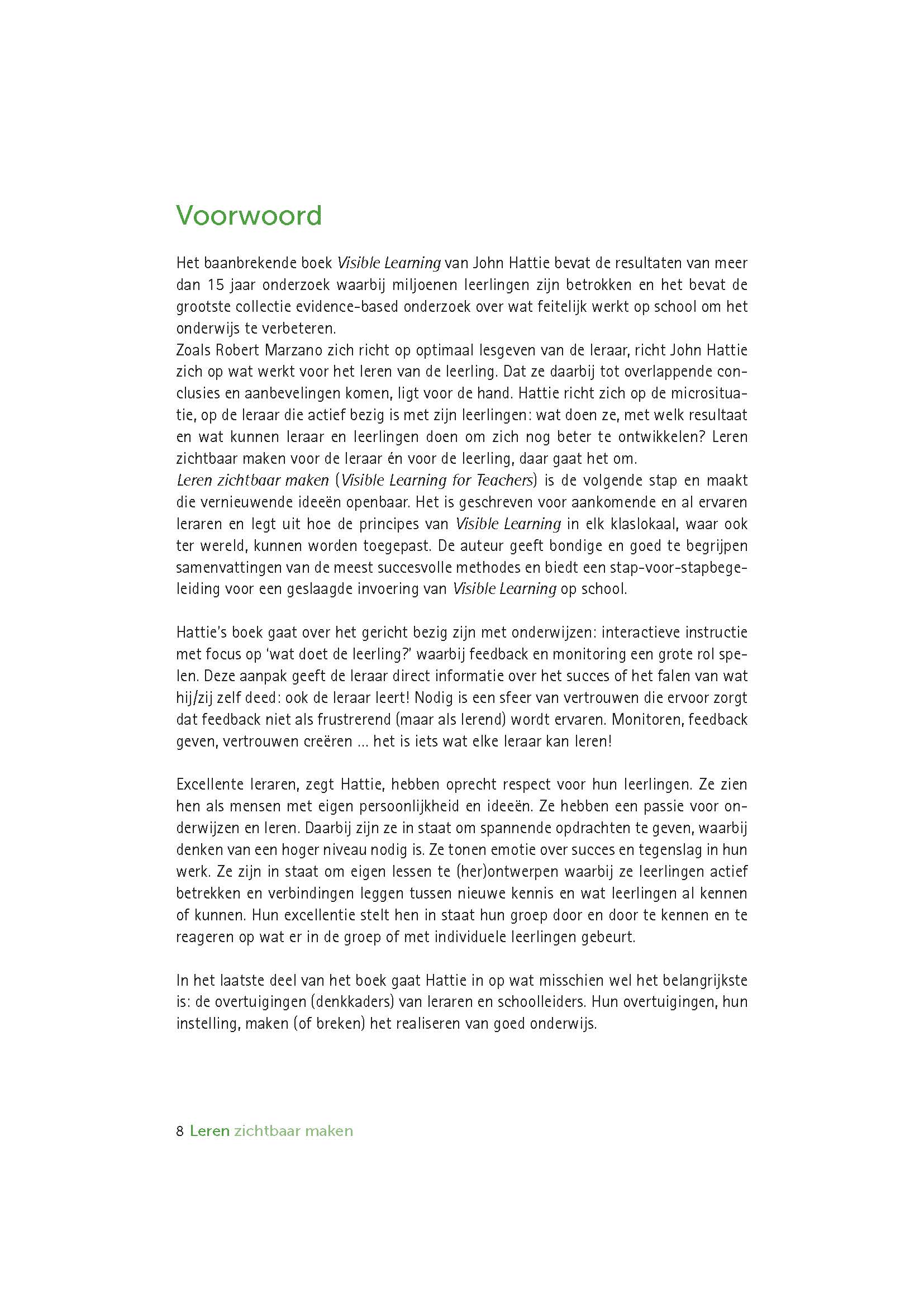 <blockquote>John Hattie’s boek Visible Learning is de neerslag van ruim 15 jaar onderzoek naar 816 meta-analyses van onderwijsonderzoek. Op basis van de resultaten van 62.169 studies met ruim 83 miljoen deelnemers bespreekt, beoordeelt en rangschikt Hattie de e¬ffecten van 138 factoren die invloed kunnen uitoefenen op het (beter) leren. In dit boek richt Hattie zich rechtstreeks tot de belangrijkste mensen in het onderwijs - de leraren - en geeft hen de mogelijkheden om de uitkomsten van zijn onderzoek direct in de praktijk toe te passen.