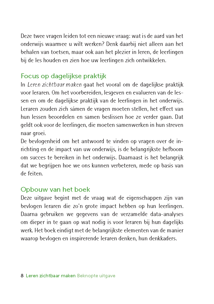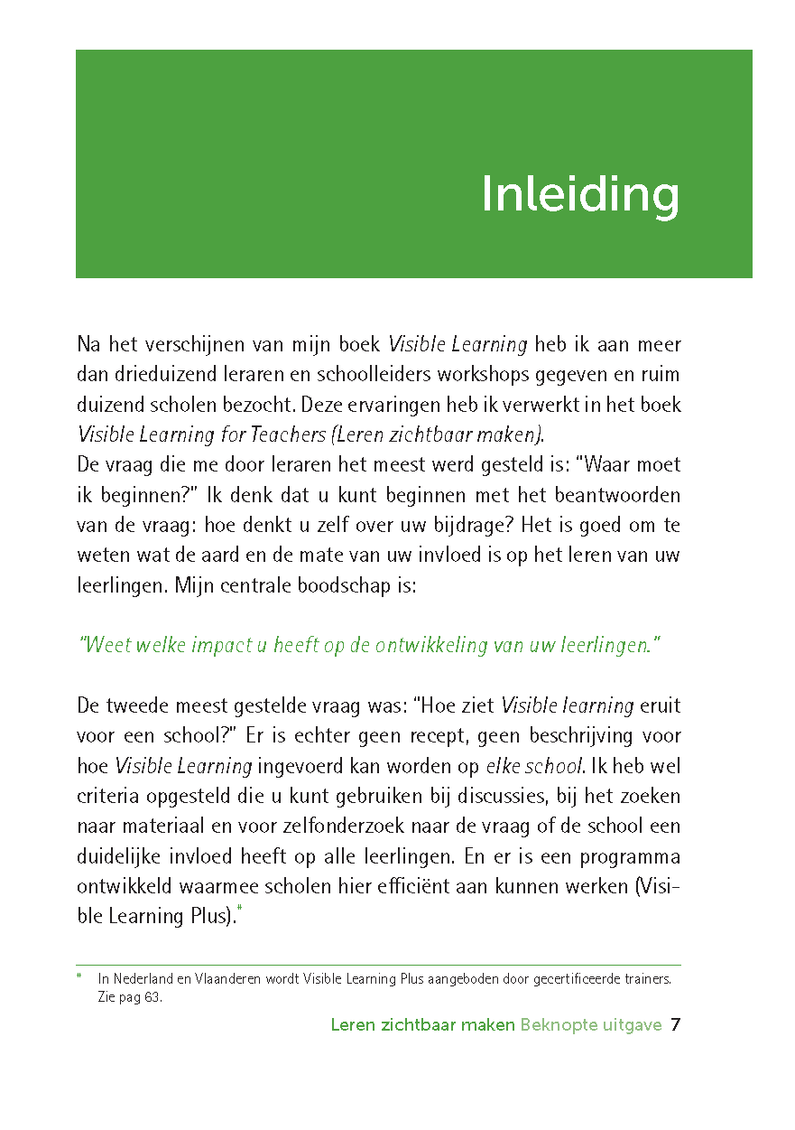 Hattie baseert zijn visie op meta-analyses die hij verrichtte op duizenden onderwijsonderzoeken, met als centrale vraag: wat heeft grote impact op het verbeteren van het leren? Leren zichtbaar maken laat je op een andere manier kijken naar je onderwijs en de opbrengsten ervan.