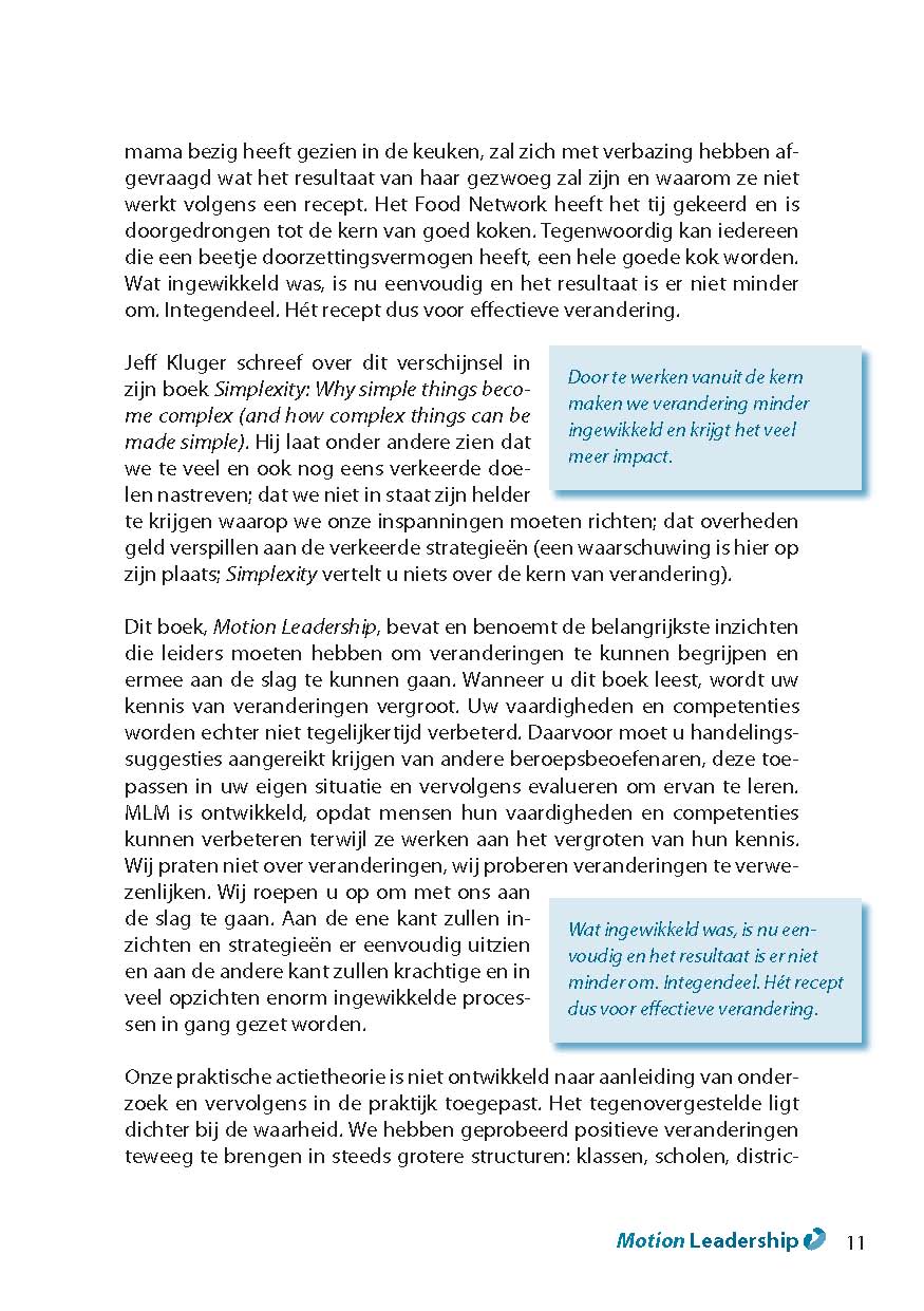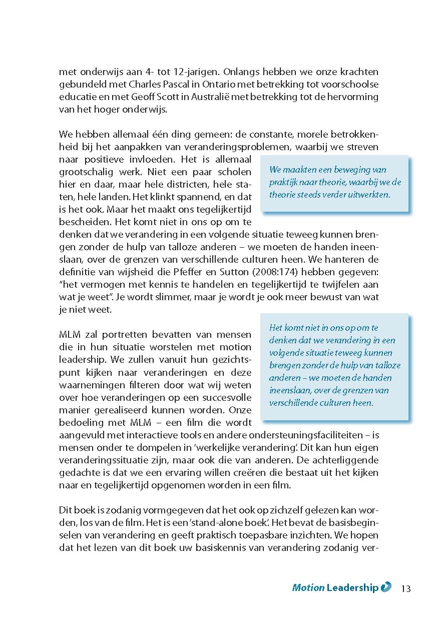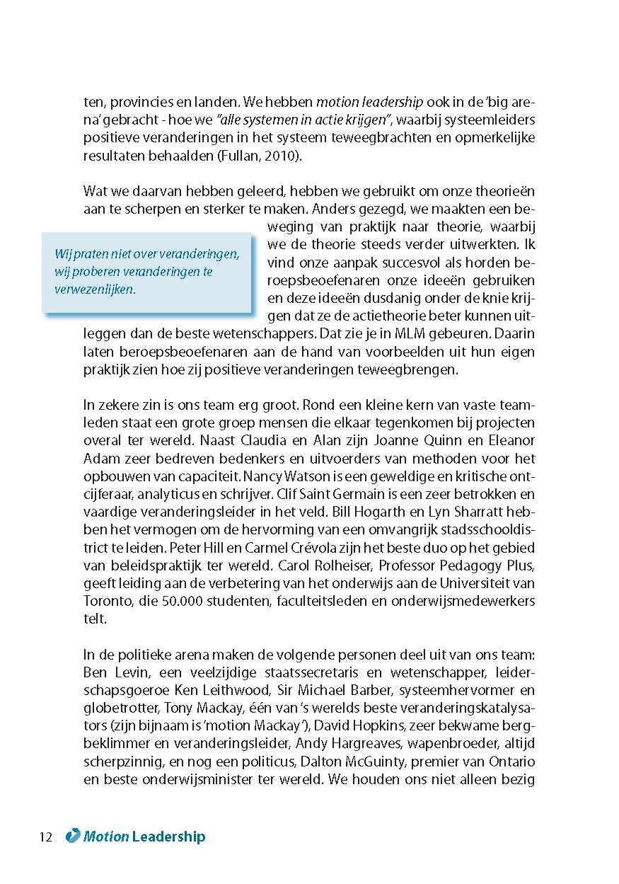 Michael Fullan presenteert in dit boek - vanuit zijn ervaring met veranderingsleiders die echt resultaat boeken - de kern van het leiding geven aan veranderingen. Motion Leadership, oftewel: hoe krijg je ze in beweging, mensen, scholen, bovenschoolse verbanden? In een voortdurend evenwicht tussen praktijk en theorie geeft dit makkelijk leesbare boek voorbeelden uit Fullan's wereldwijde ervaring. Een boek zo compact en kernachtig dat geen interne veranderaar, schoolleider, manager of bestuurder het mag missen.