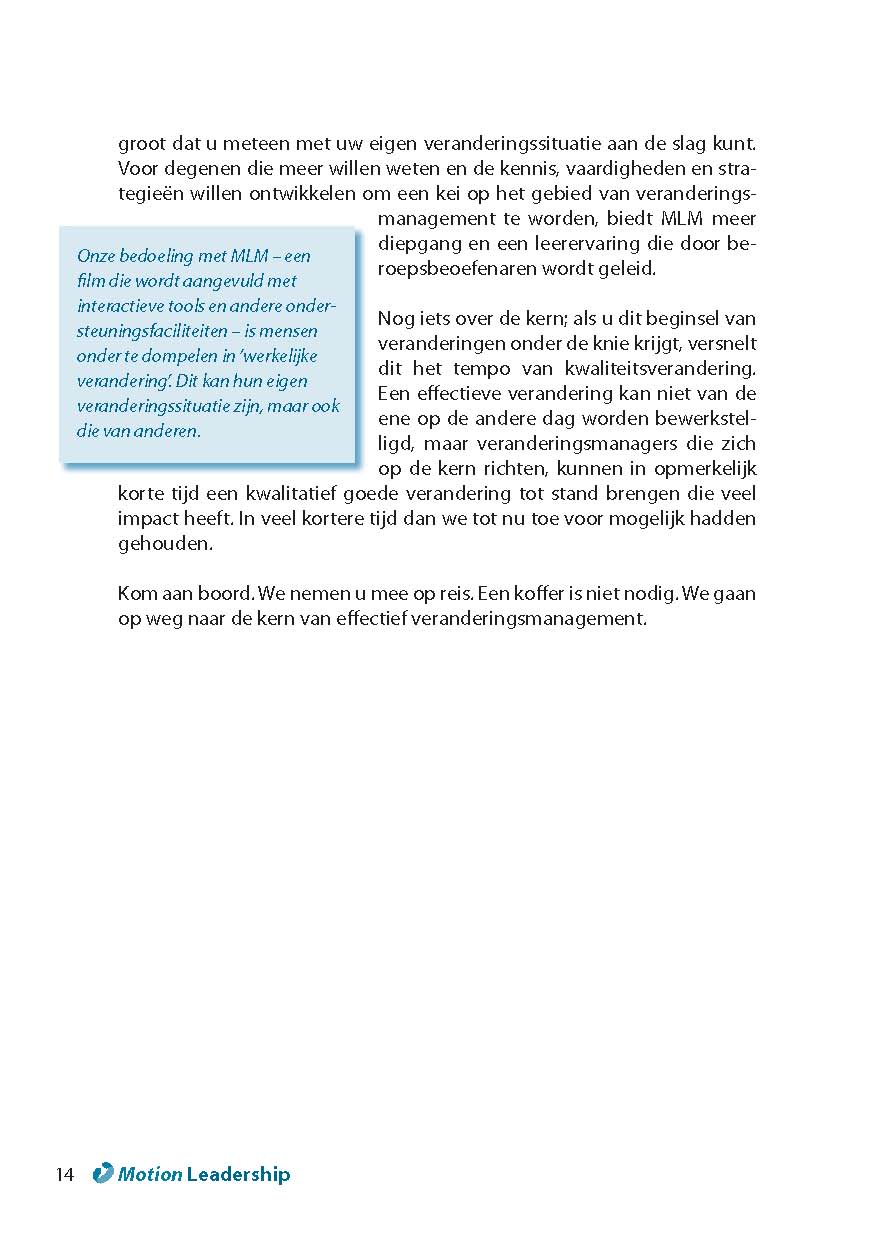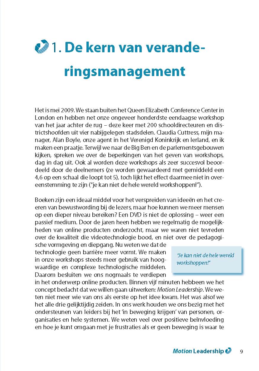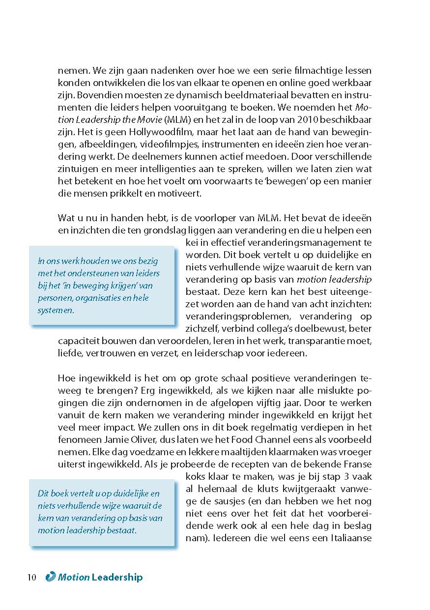 Michael Fullan presenteert in dit boek - vanuit zijn ervaring met veranderingsleiders die echt resultaat boeken - de kern van het leiding geven aan veranderingen. Motion Leadership, oftewel: hoe krijg je ze in beweging, mensen, scholen, bovenschoolse verbanden? In een voortdurend evenwicht tussen praktijk en theorie geeft dit makkelijk leesbare boek voorbeelden uit Fullan's wereldwijde ervaring. Een boek zo compact en kernachtig dat geen interne veranderaar, schoolleider, manager of bestuurder het mag missen.