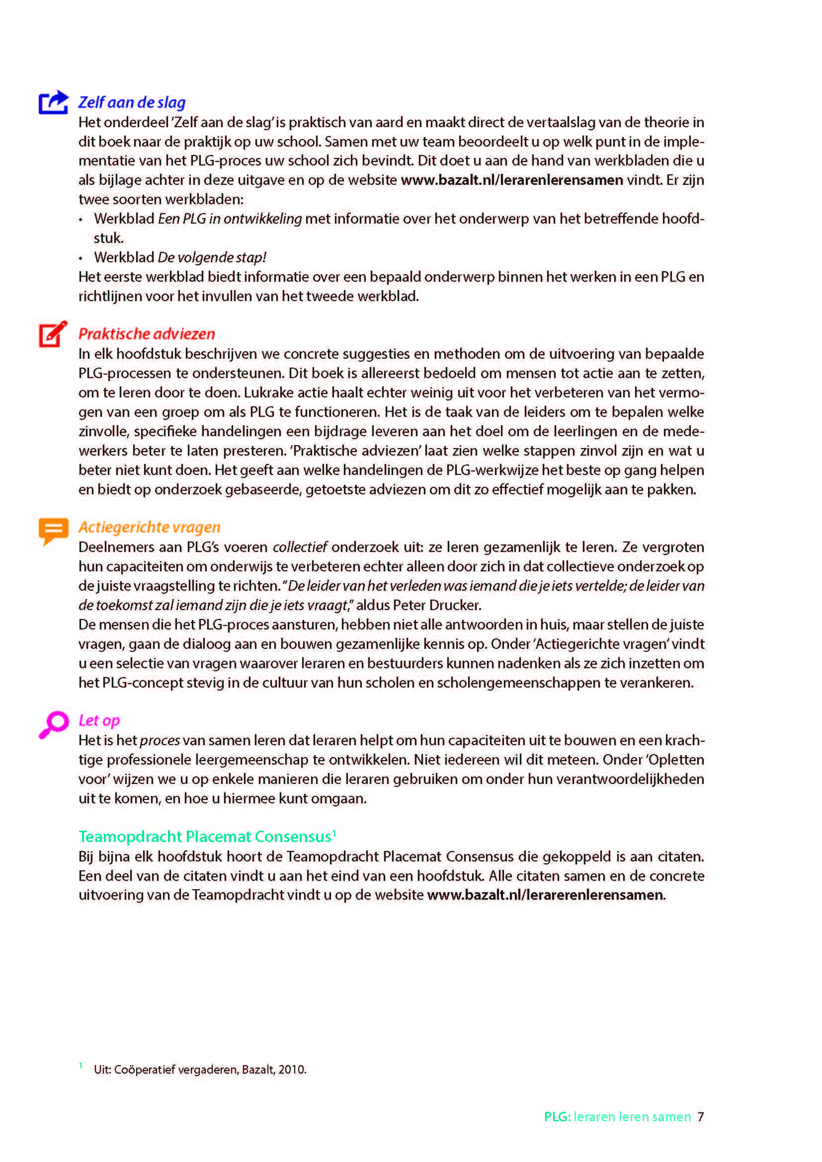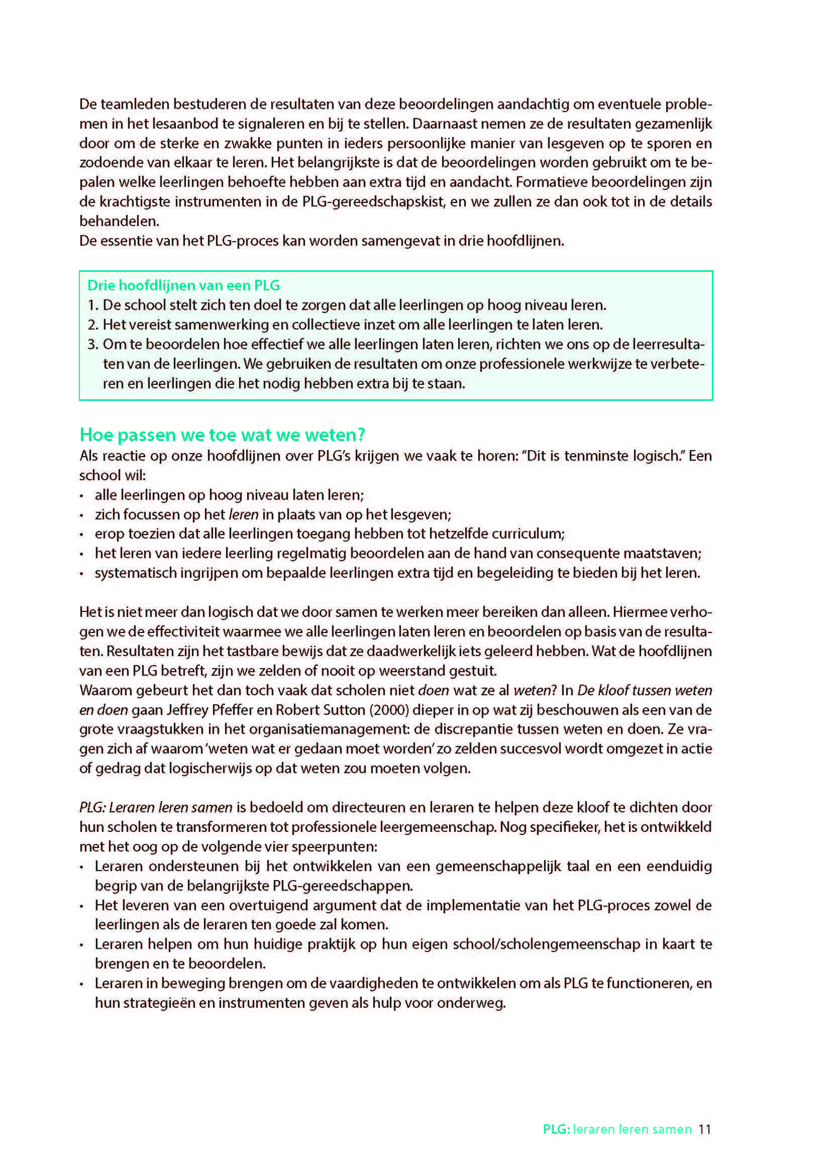 Hoe zo’n PLG functioneert, beschrijft Richard DuFour in dit handboek voor professionele leergemeenschappen. Met duidelijke voorbeelden en een theoretische onderbouwing geeft hij aan hoe je PLG’s vormt en wat ze concreet kunnen doen. Want alleen door te doen, kun je dit leren, zegt DuFour. Laat leraren dus samen leren en zorg daarbij voor de juiste focus, cultuur en resultaatgerichtheid. De werkbladen en teamopdrachten uit dit boek helpen daarbij.