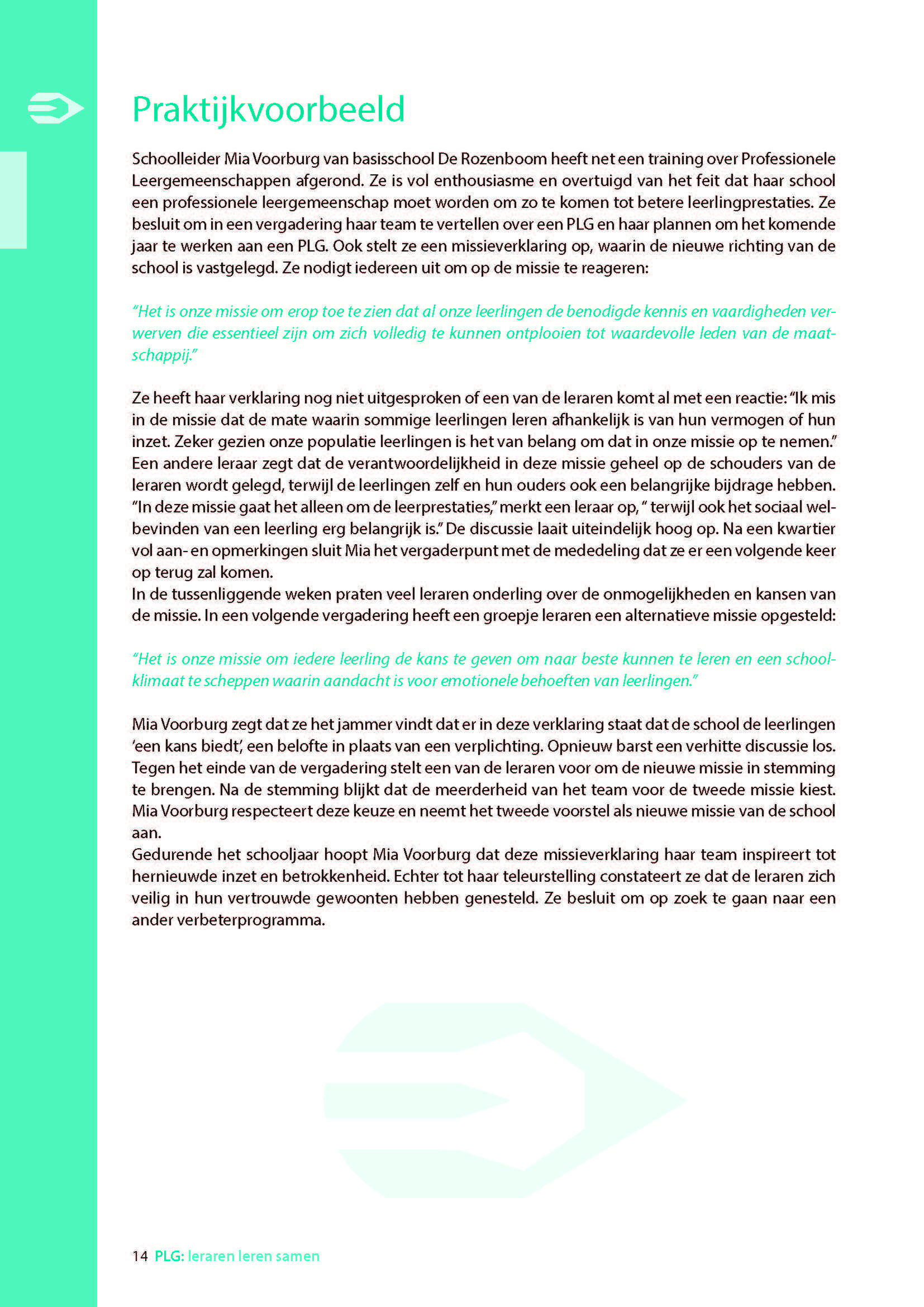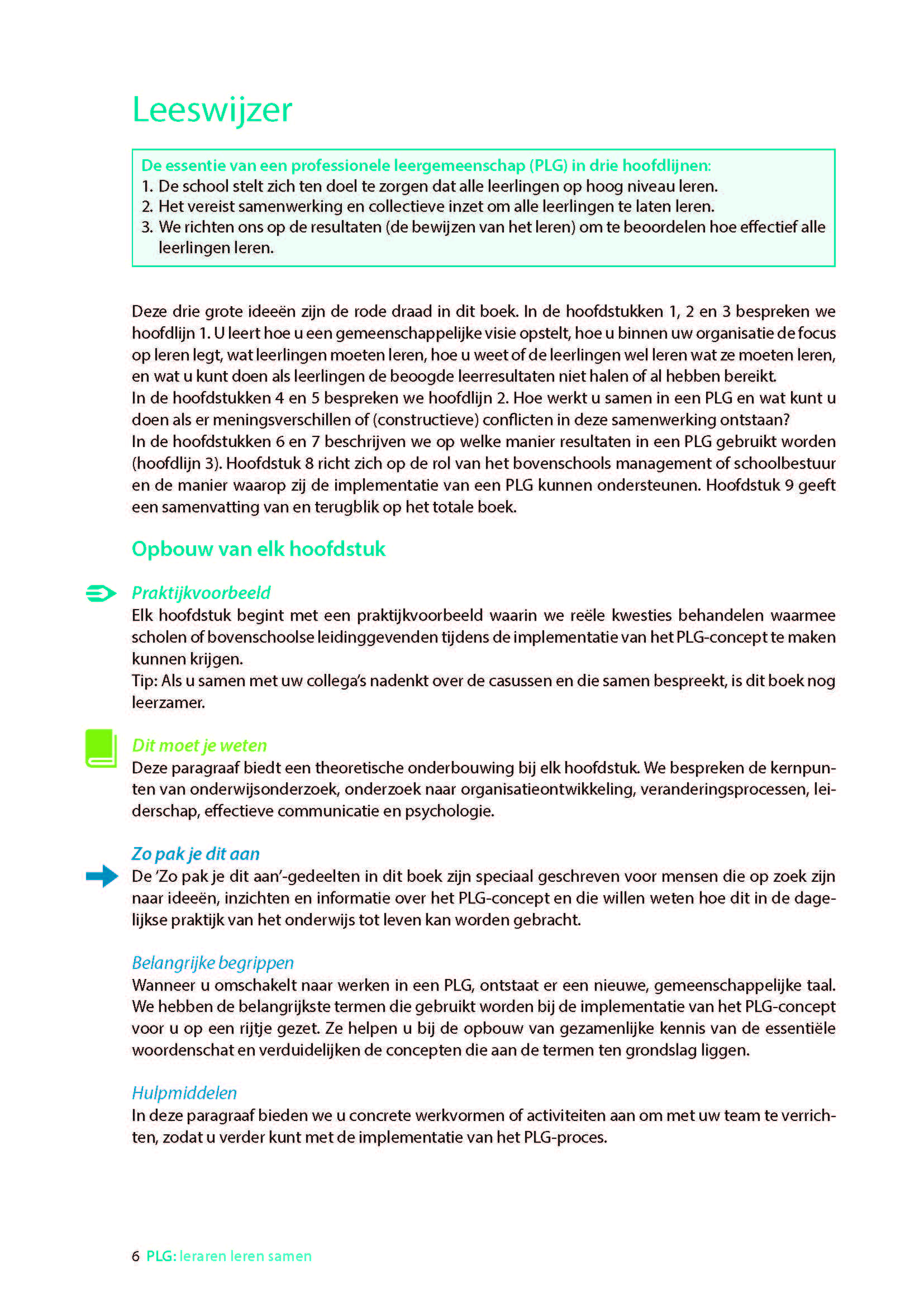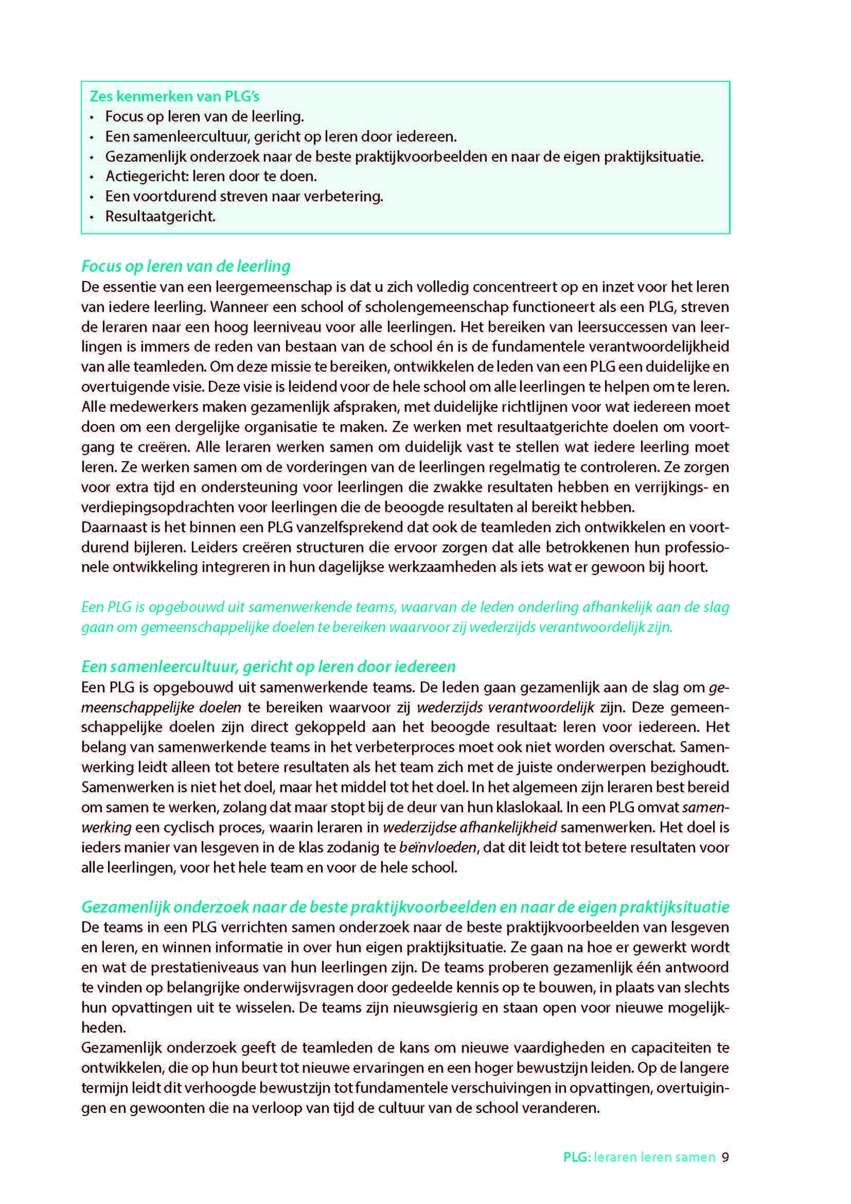 Als je wilt dat alle leerlingen in de school op het hoogst mogelijke niveau leren, dan kun je de verantwoordelijkheid daarvoor niet bij een individuele leraar leggen. Dan is het van belang dat leraren met elkaar antwoorden zoeken op vragen als: Wat zijn de beste onderwijspraktijken? Wat bevordert het leerproces? Hoe laten we alle leerlingen beter leren, ongeacht hun capaciteiten? In een professionele leergemeenschap (PLG) onderzoeken ze dit samen.