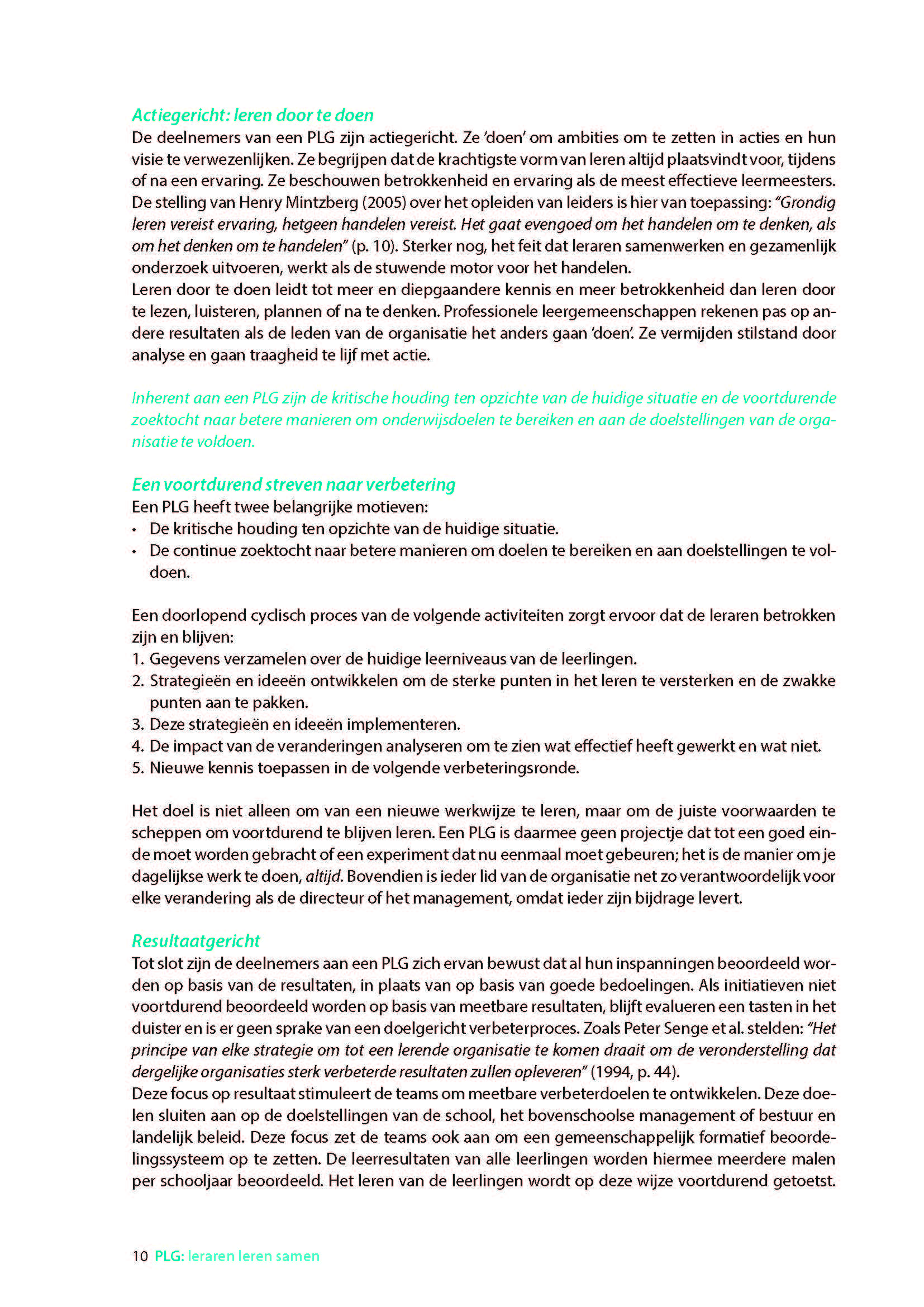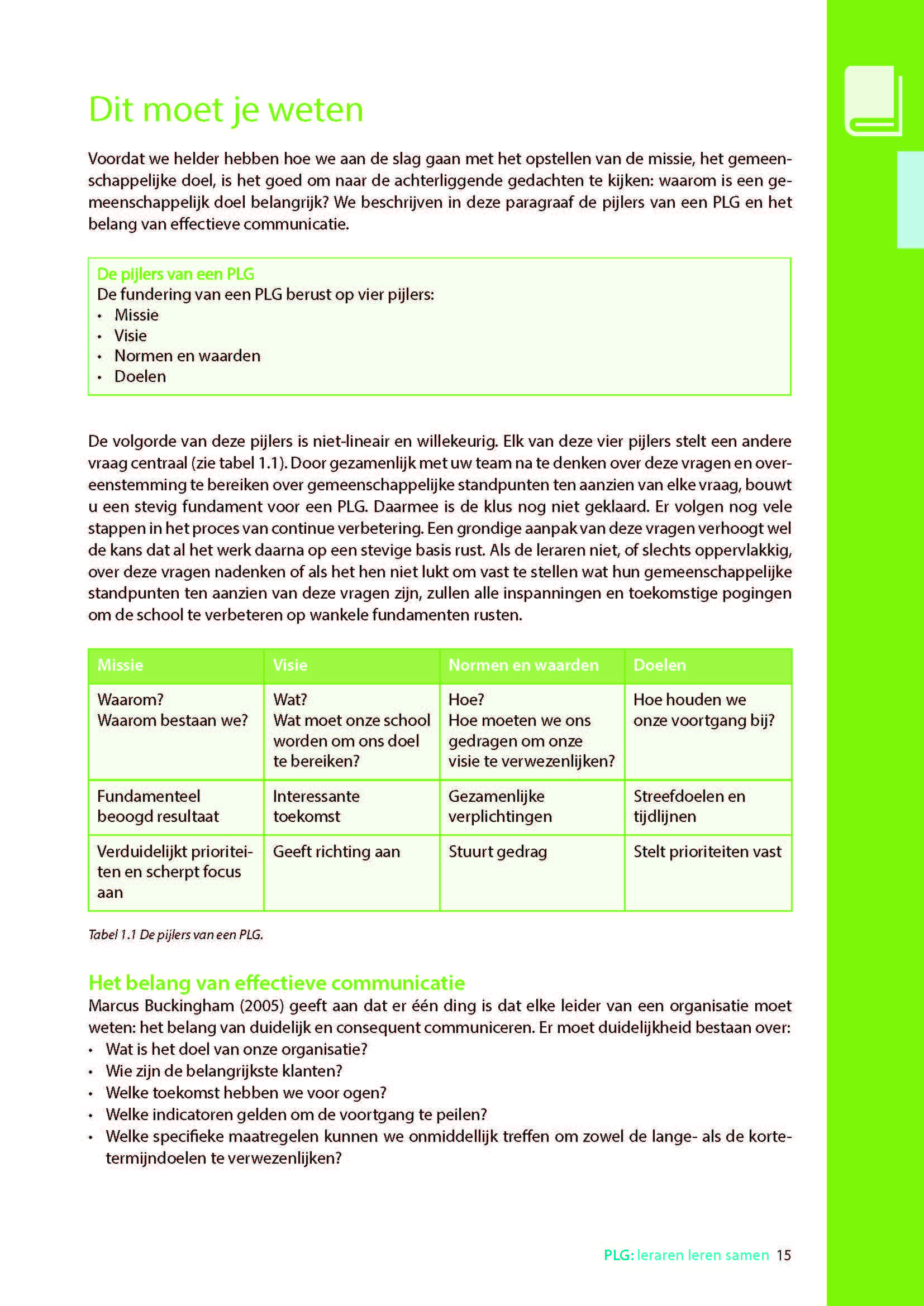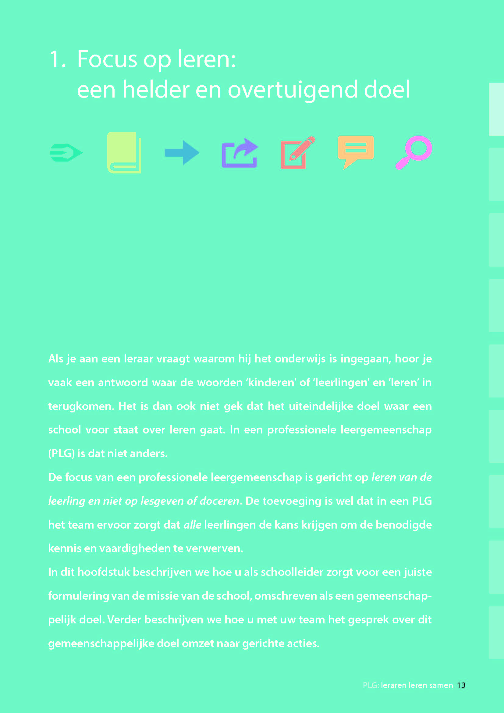 Als je wilt dat alle leerlingen in de school op het hoogst mogelijke niveau leren, dan kun je de verantwoordelijkheid daarvoor niet bij een individuele leraar leggen. Dan is het van belang dat leraren met elkaar antwoorden zoeken op vragen als: Wat zijn de beste onderwijspraktijken? Wat bevordert het leerproces? Hoe laten we alle leerlingen beter leren, ongeacht hun capaciteiten? In een professionele leergemeenschap (PLG) onderzoeken ze dit samen.