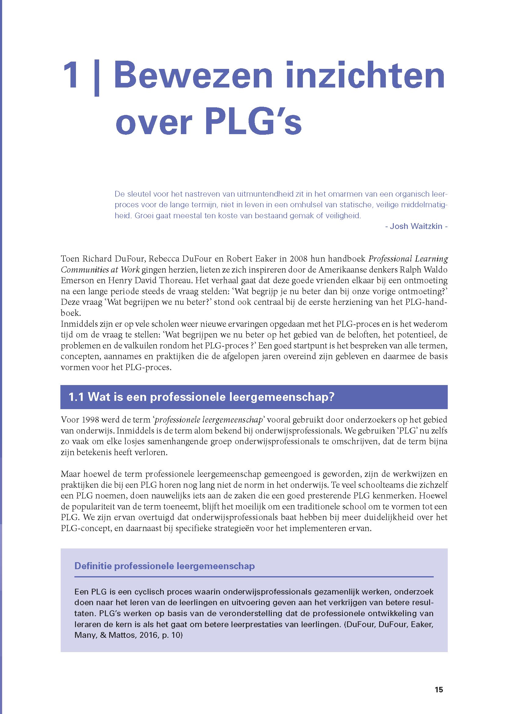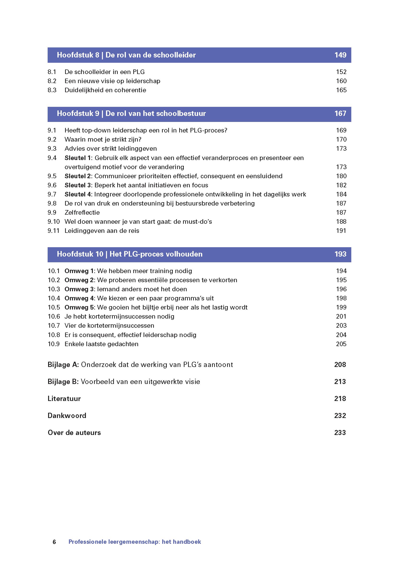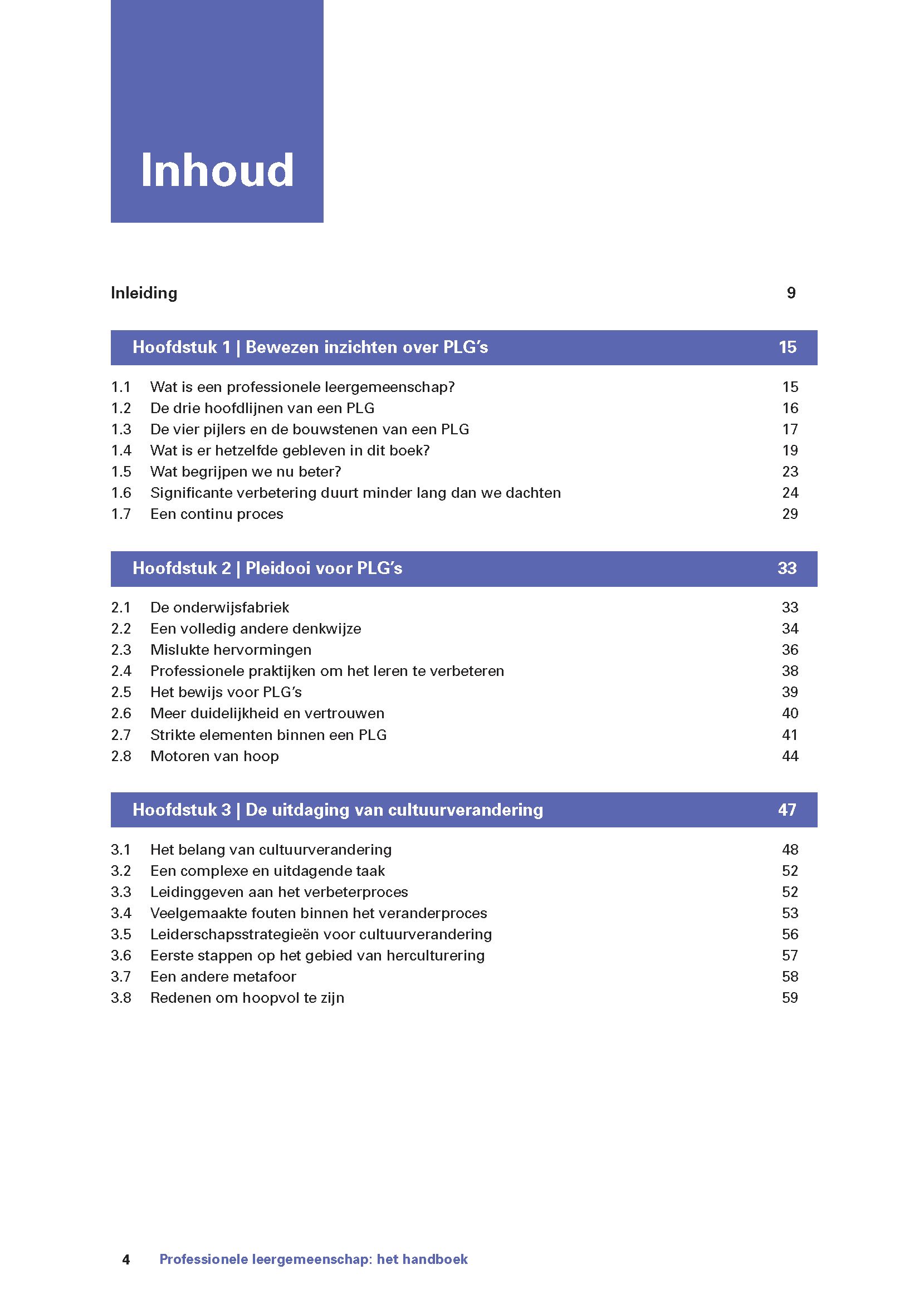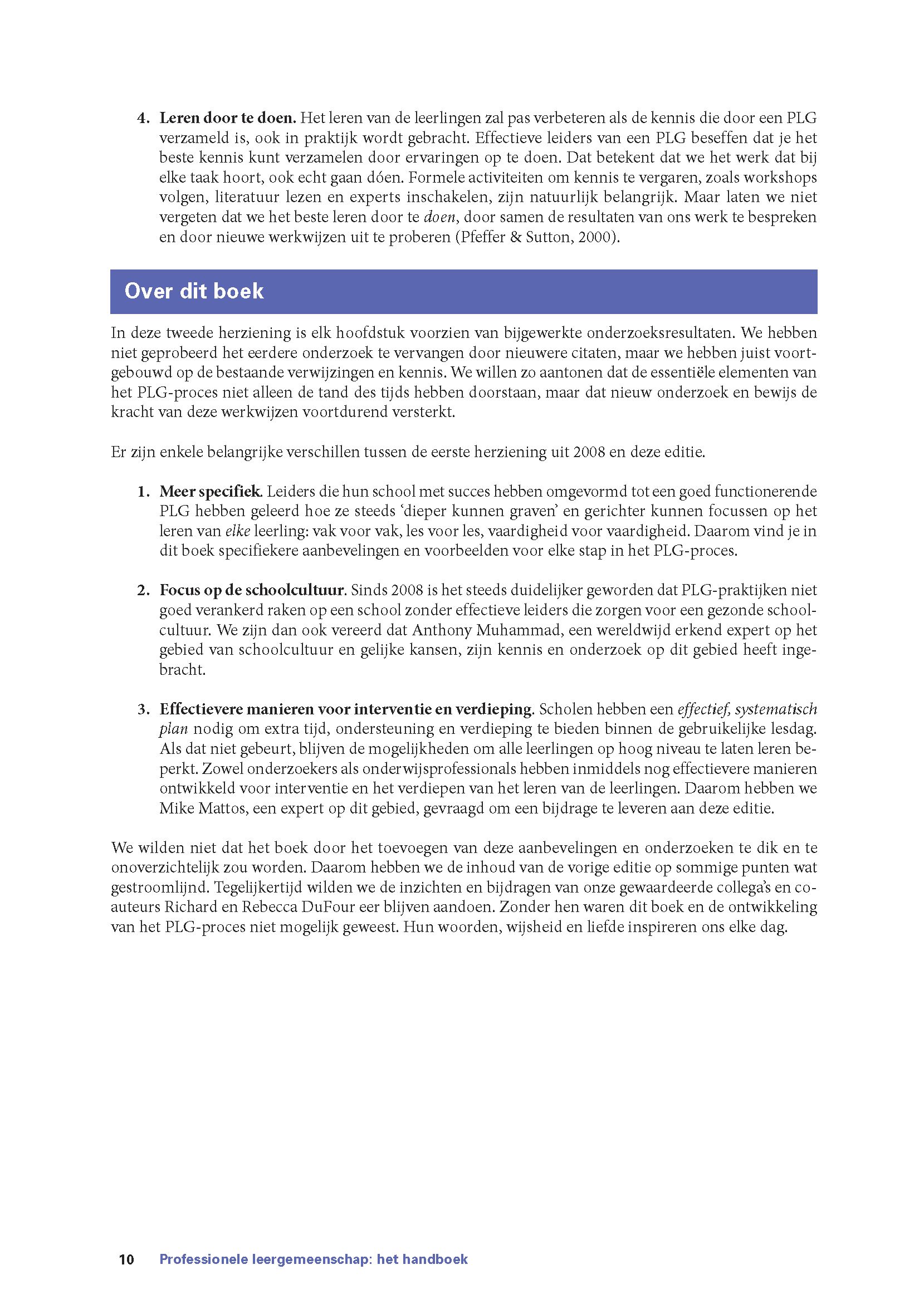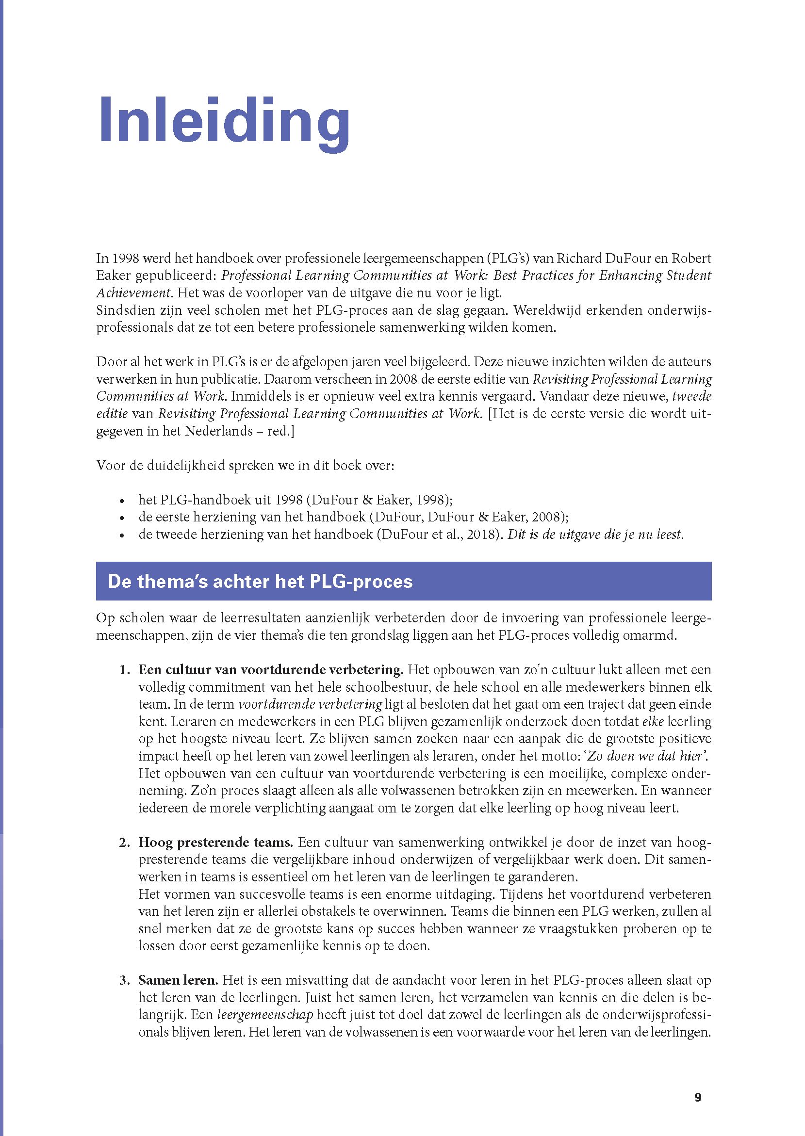 In dit handboek onderbouwen Richard DuFour en zijn medeauteurs hun kennis over het PLG-proces met bewezen inzichten uit wetenschappelijk onderzoek en met ervaringen uit de praktijk van de afgelopen decennia. Ze beschrijven de pijlers waarop een professionele leergemeenschap rust en geven handvatten om het PLG-proces te implementeren. Daarmee bieden ze een gedegen basis voor iedereen die met PLG’s aan de slag wil gaan.