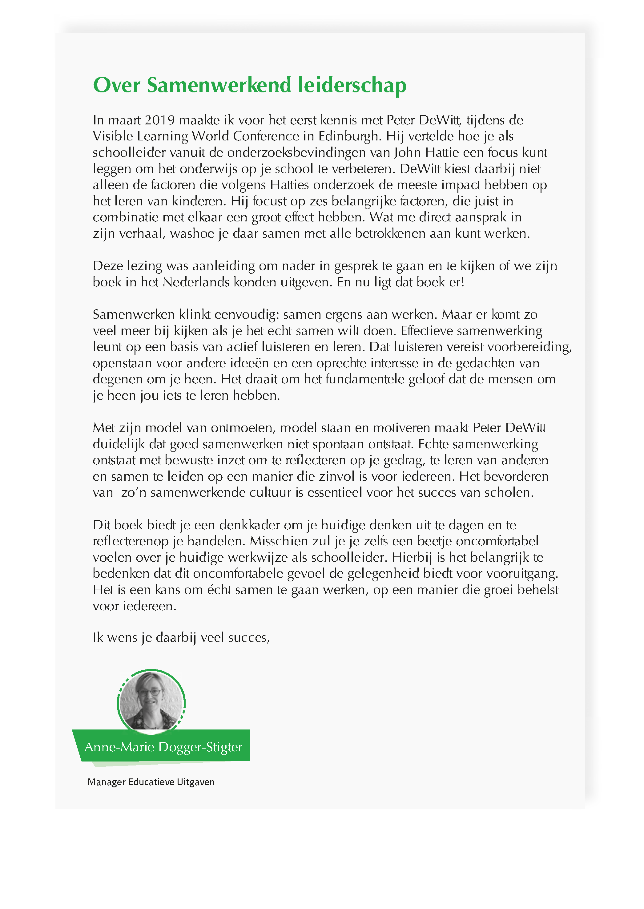 “DeWitt verbindt op toegankelijke wijze belangrijke elementen van Leren Zichtbaar Maken met essenties van het systeemdenken. Het boek combineert onderbouwde theorie met praktische handvatten, om door middel van ‘samenwerkend leiderschap’ te werken aan kwaliteitsverbetering van het onderwijs. Niet vanachter een bureau, maar op de werkvloer."