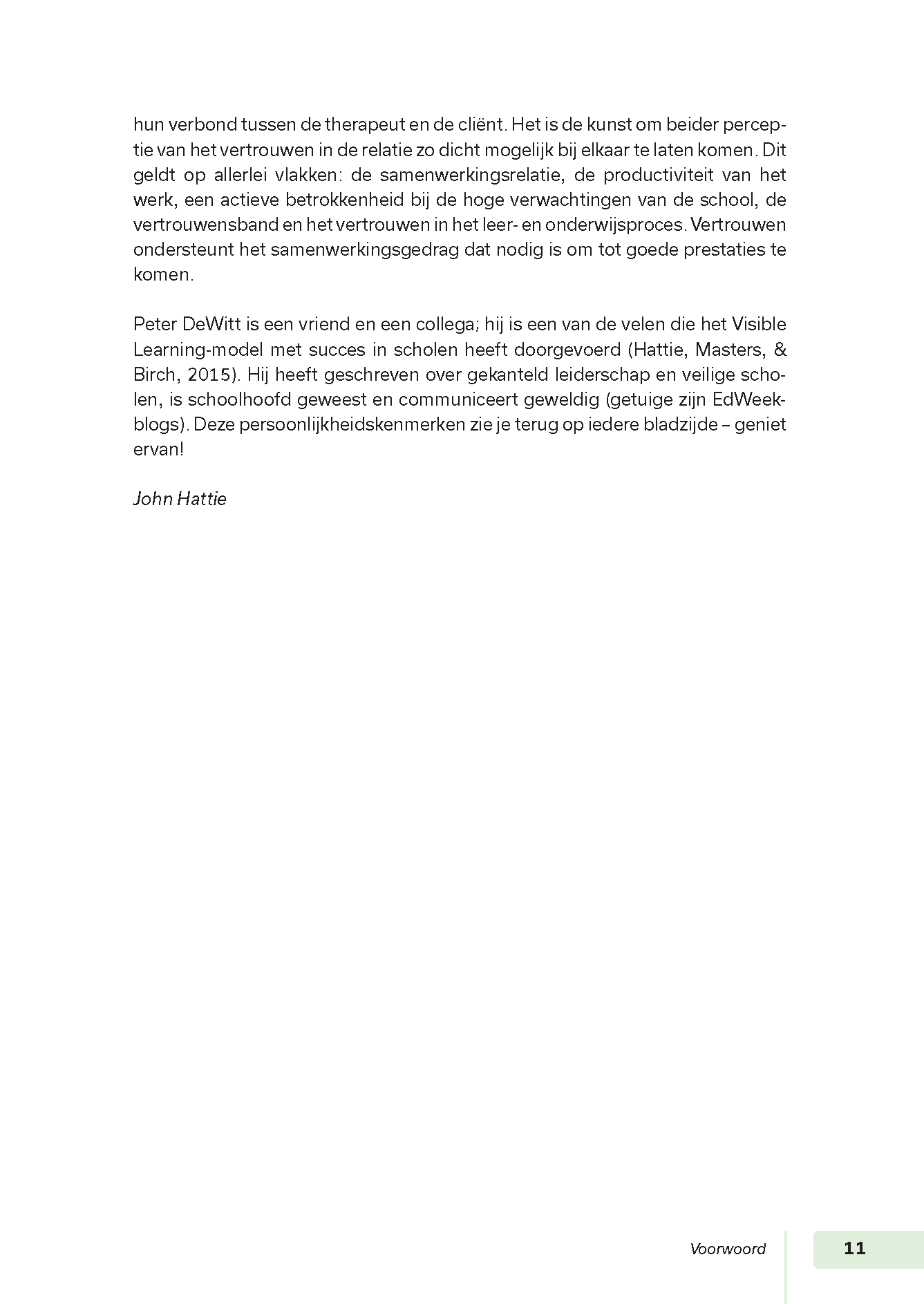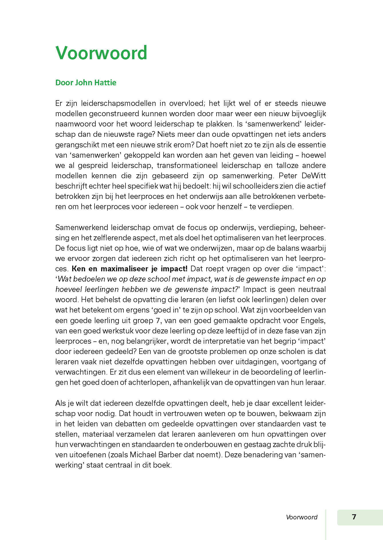Het onderwijs verbeteren begint volgens Peter DeWitt bij de feiten. Daarvoor haakt DeWitt aan bij het baanbrekende werk van onderwijswetenschapper John Hattie. Die bracht het effect van 250 invloeden op het leerproces in kaart. Uit dit onderzoek kiest DeWitt zes invloeden waar je je als schoolleider op kunt richten. Het zijn invloeden die zich bij uitstek richten op het bijeen brengen van diverse betrokkenen, om zo samen de verbeteringen vorm te geven.