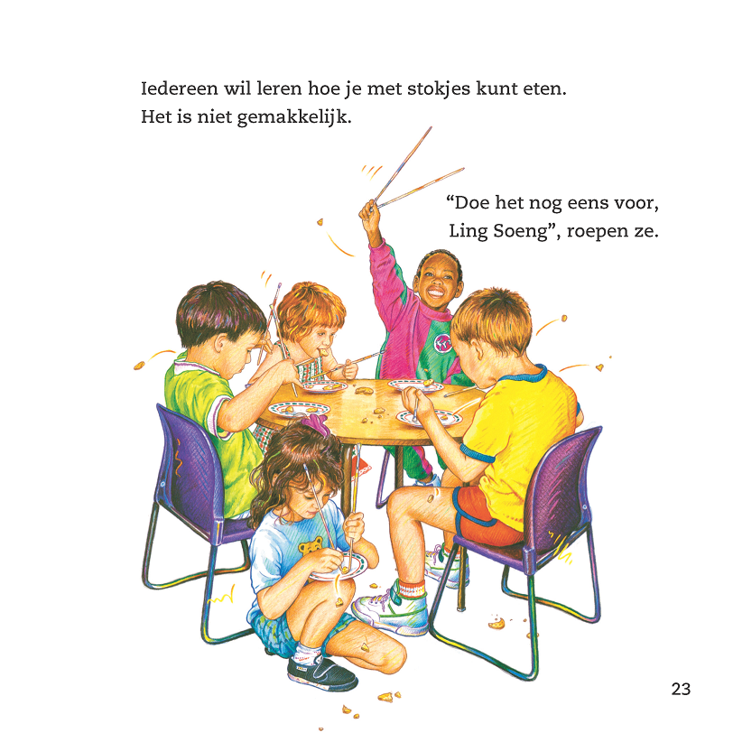 Dan blijkt dat hij iets kan wat anderen niet kunnen: met stokjes eten. Alle kinderen willen het graag van hem leren. Ook de juffen willen het proberen. Ling Soeng doet het voor. En hij ontdekt dat hij ook dingen van anderen kan leren. Als je oefent en hulp vraagt, kun je het ook leren! Met de juiste mindset kom je er wel.