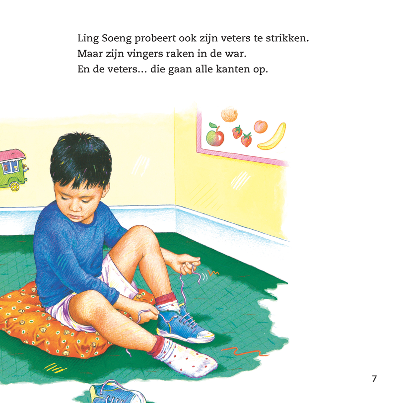 Ling Soeng vindt het niet leuk om naar school te gaan. Er zijn zoveel kinderen die dingen kunnen die hij nog niet kan. Veters strikken bijvoorbeeld. Hun jas goed aantrekken. Of hun naam schrijven. Ling Soeng wil ook ergens goed in zijn!