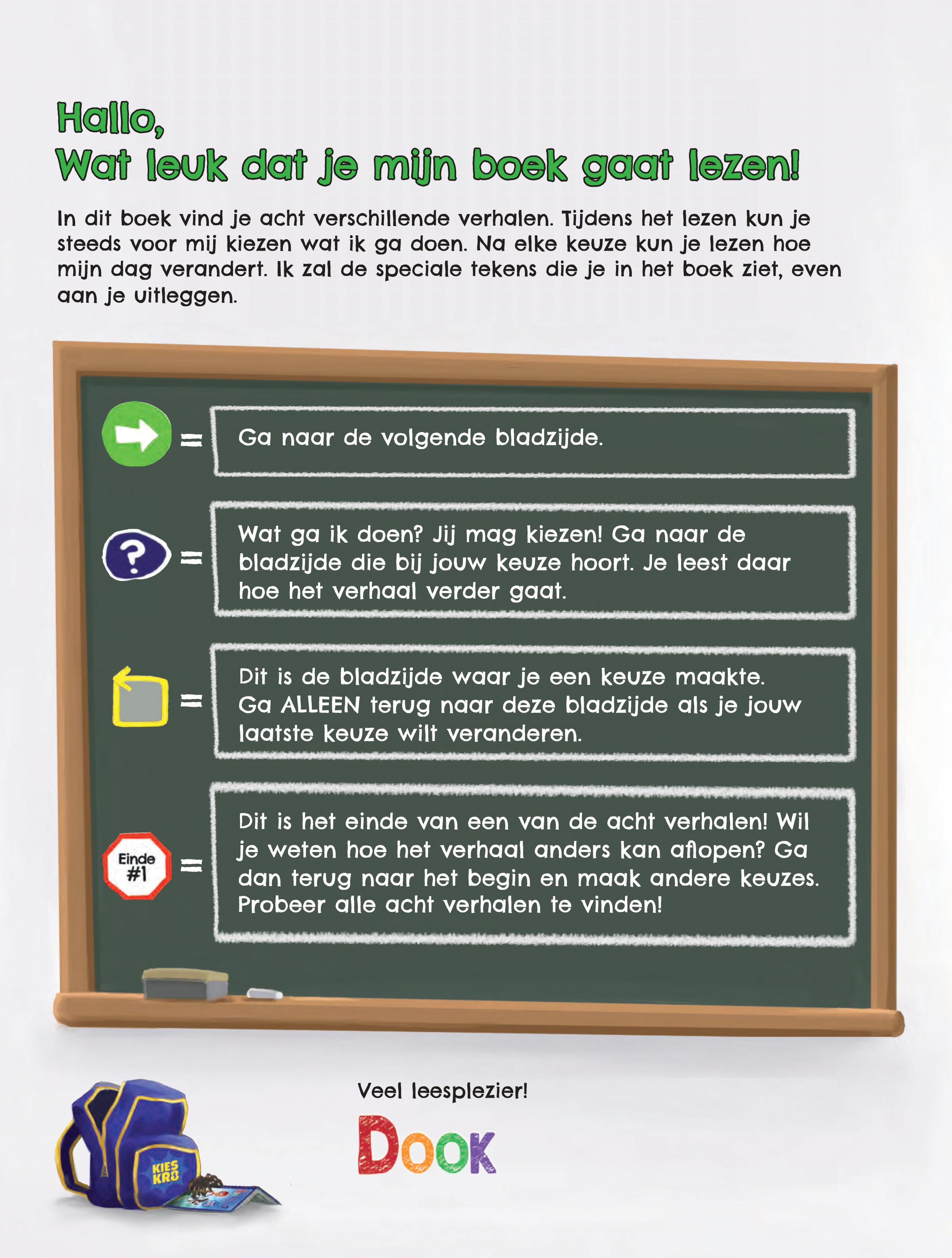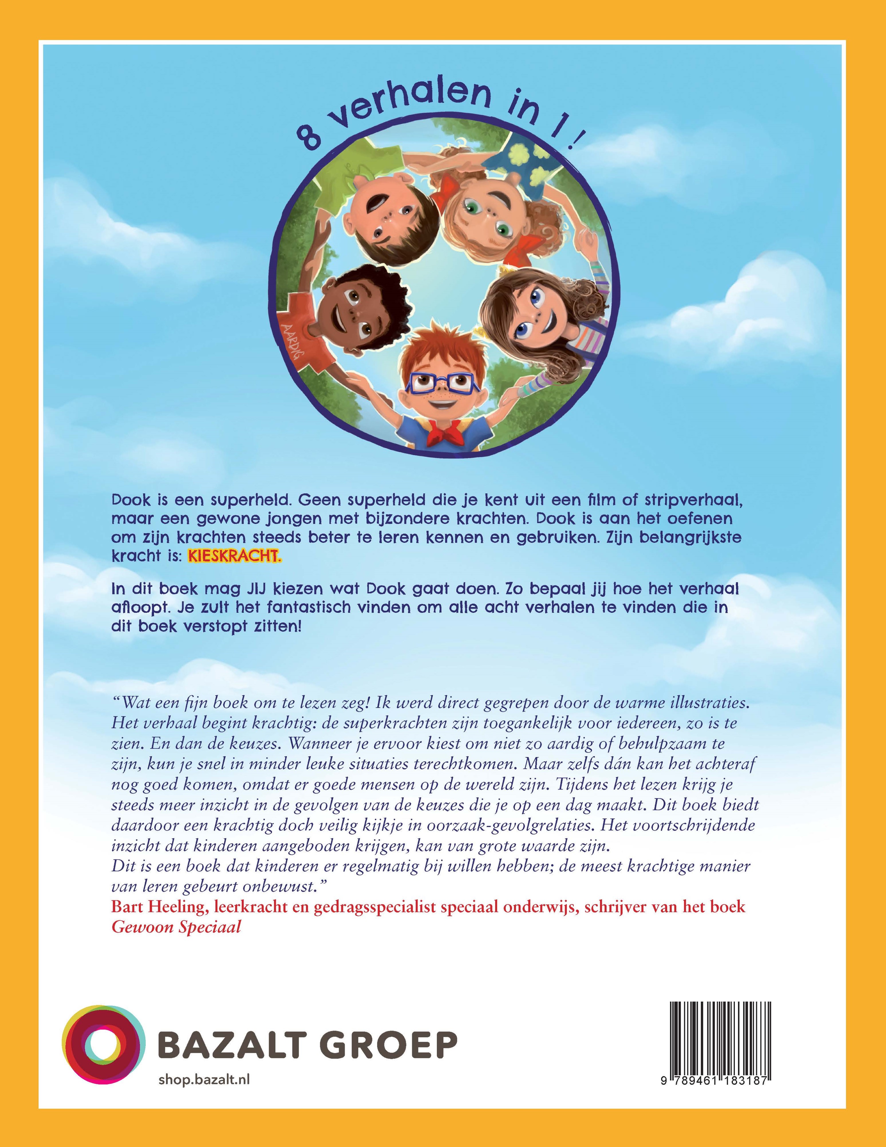 In dit boek beleef je een schooldag uit het leven van Dook. Dook is een gewone jongen met bijzondere krachten. Hij is druk aan het oefenen om zijn krachten steeds beter te leren kennen en gebruiken. Zijn belangrijkste kracht is: KIESKRACHT. Met deze KIESKRACHT kan Dook het verschil maken in hoe zijn dag verloopt.
