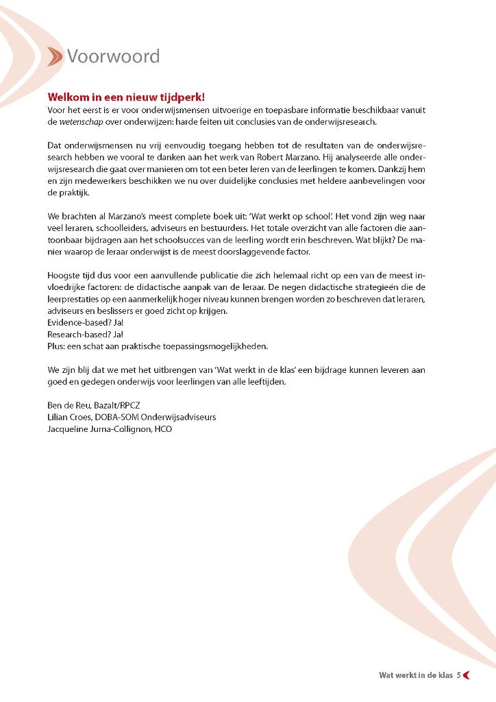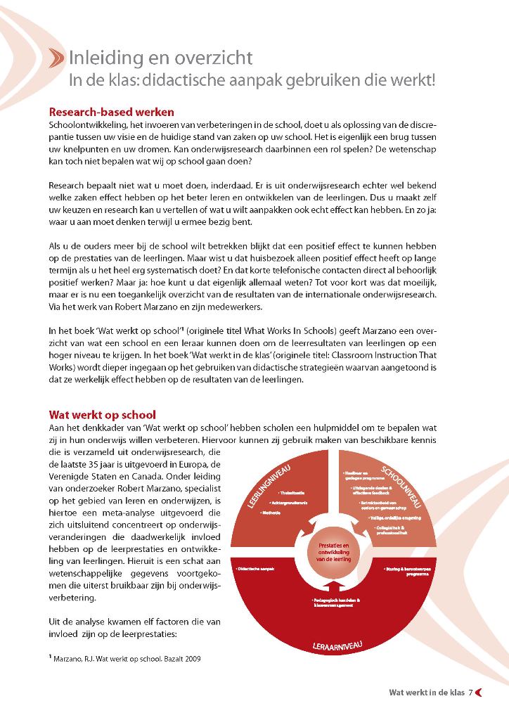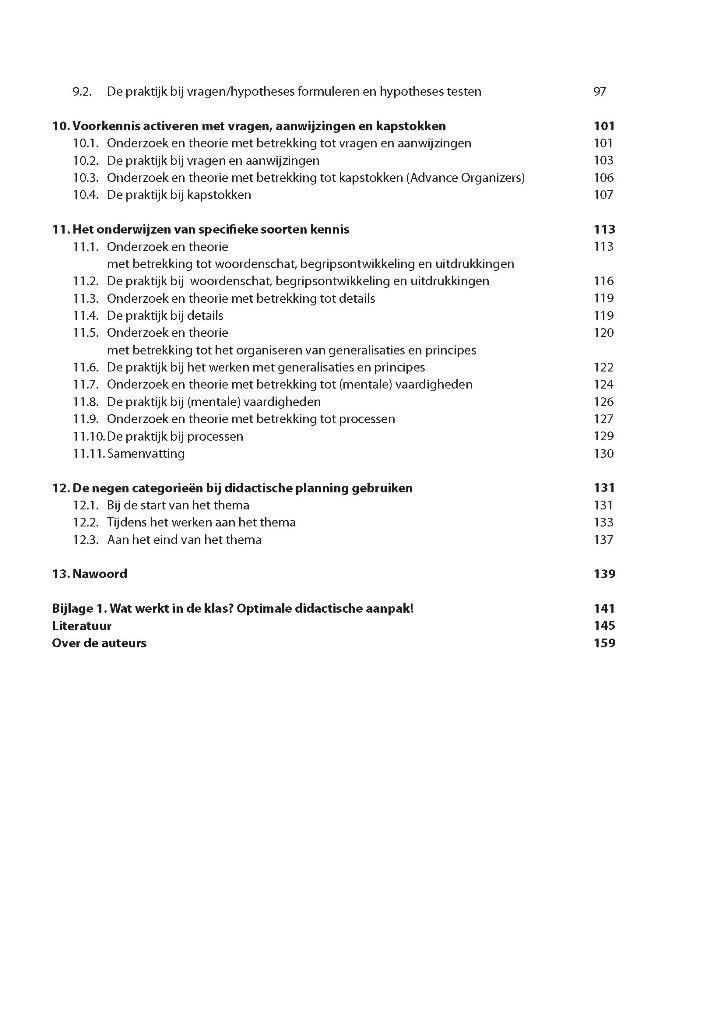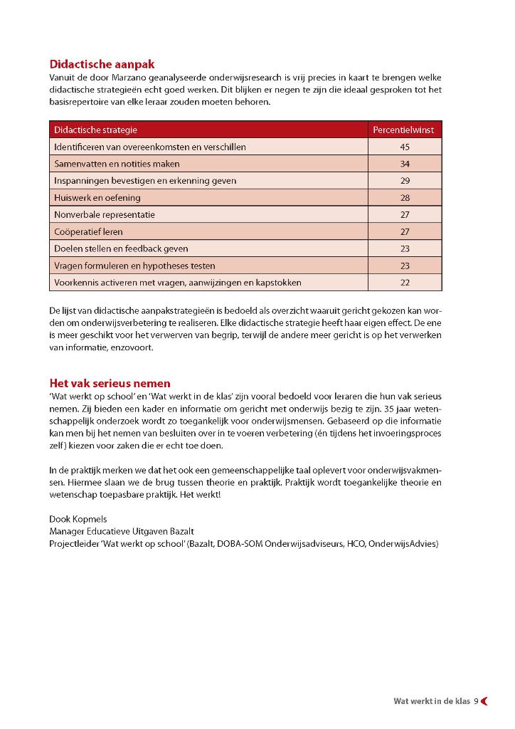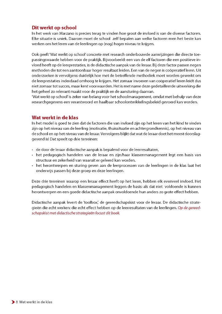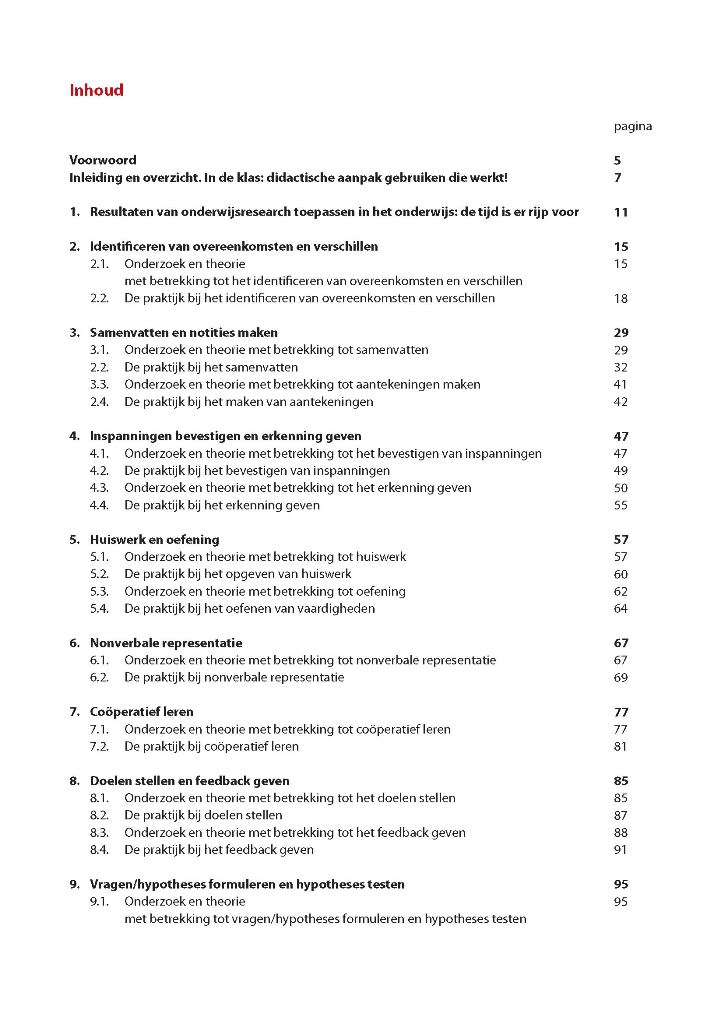 Voor ieder in het onderwijs die echt wil weten welke didactische aanpak de resultaten van de leerlingen aantoonbaar verbetert, biedt dit boek zicht op research uitkomsten, overzichten en beschrijvingen van wat werkt. De auteurs zetten tientallen jaren wetenschappelijke informatie om in heldere actieplannen voor de praktijk. Er blijken 9 soorten didactische aanpak te zijn die het leren van de leerling op hoger niveau brengen. Van elk van deze negen didactische strategieën wordt uitgelegd: